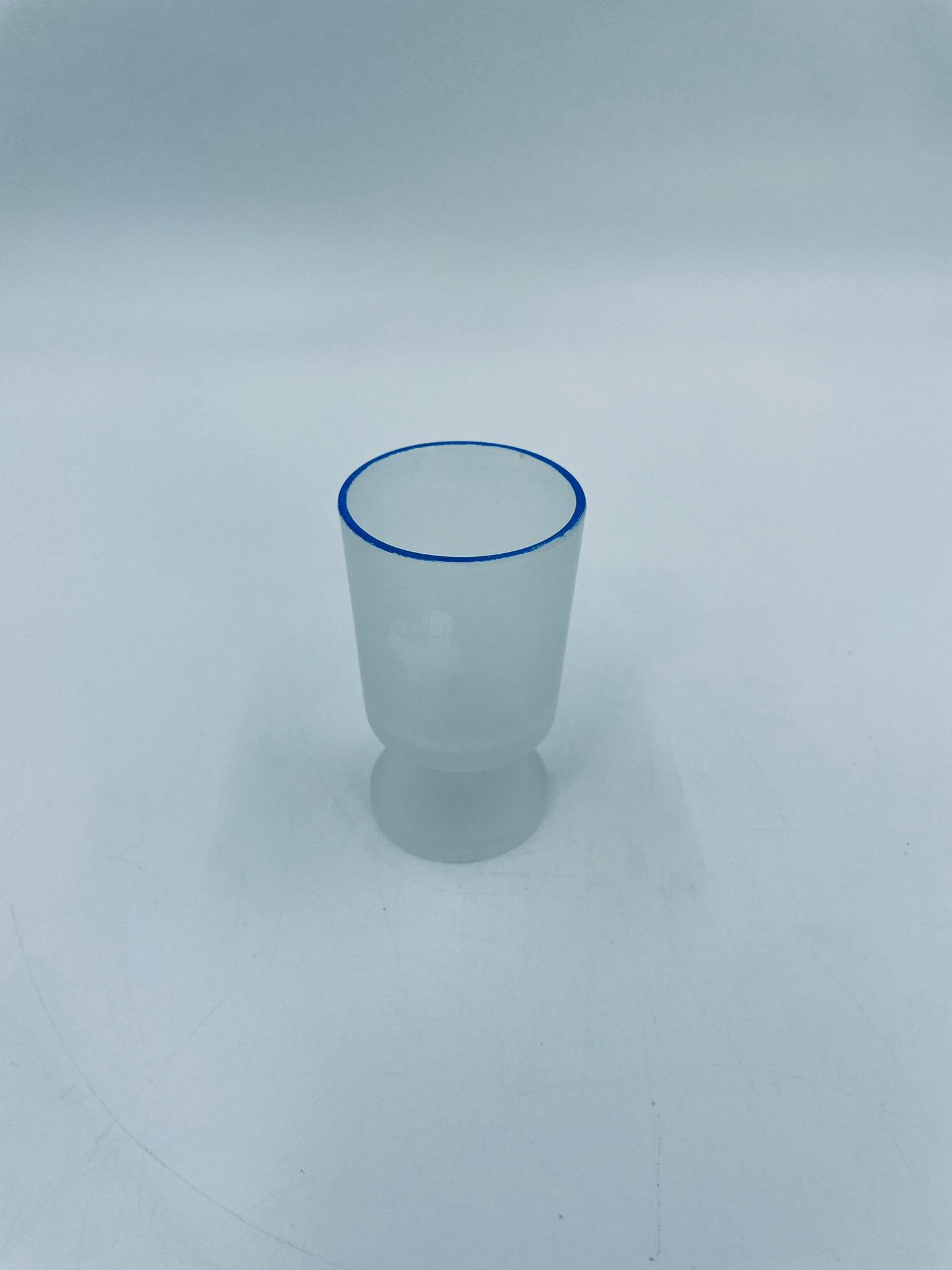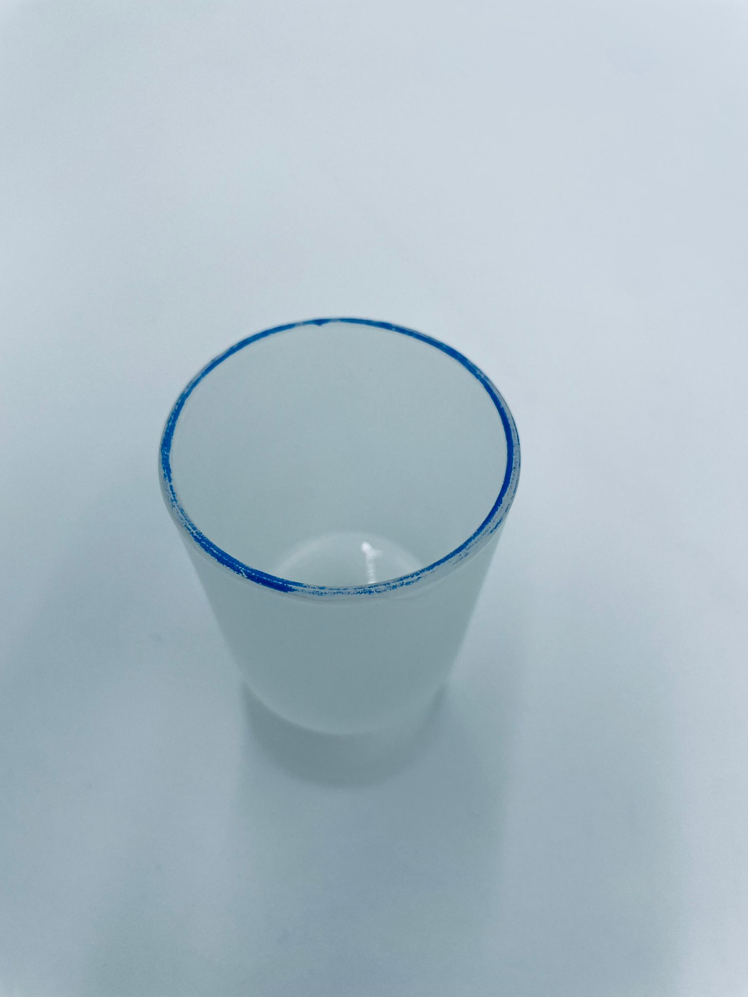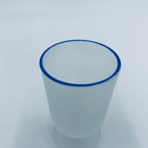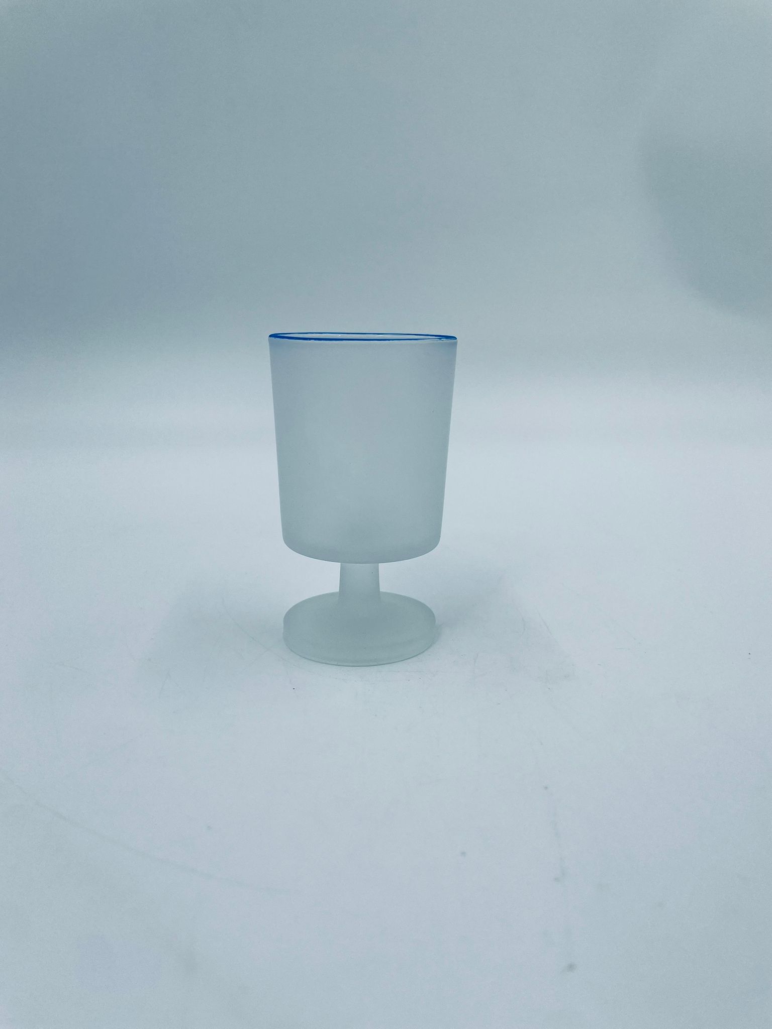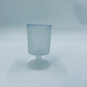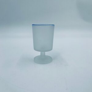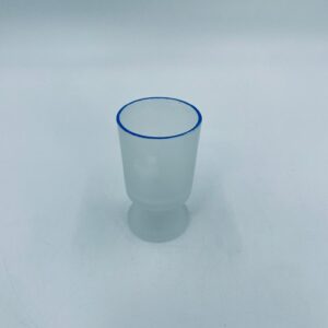 Kieliszek do wódki w stylu Vintage, wykonany z wysokiej jakości szkła. Kieliszek o matowym, mlecznym wykończeniem, osadzony na krótkiej nóżce i podstawie, wykończony niebieską obwódką na rancie. Posiada przetarcie na kolorze oraz uszczerbek na podstawie.