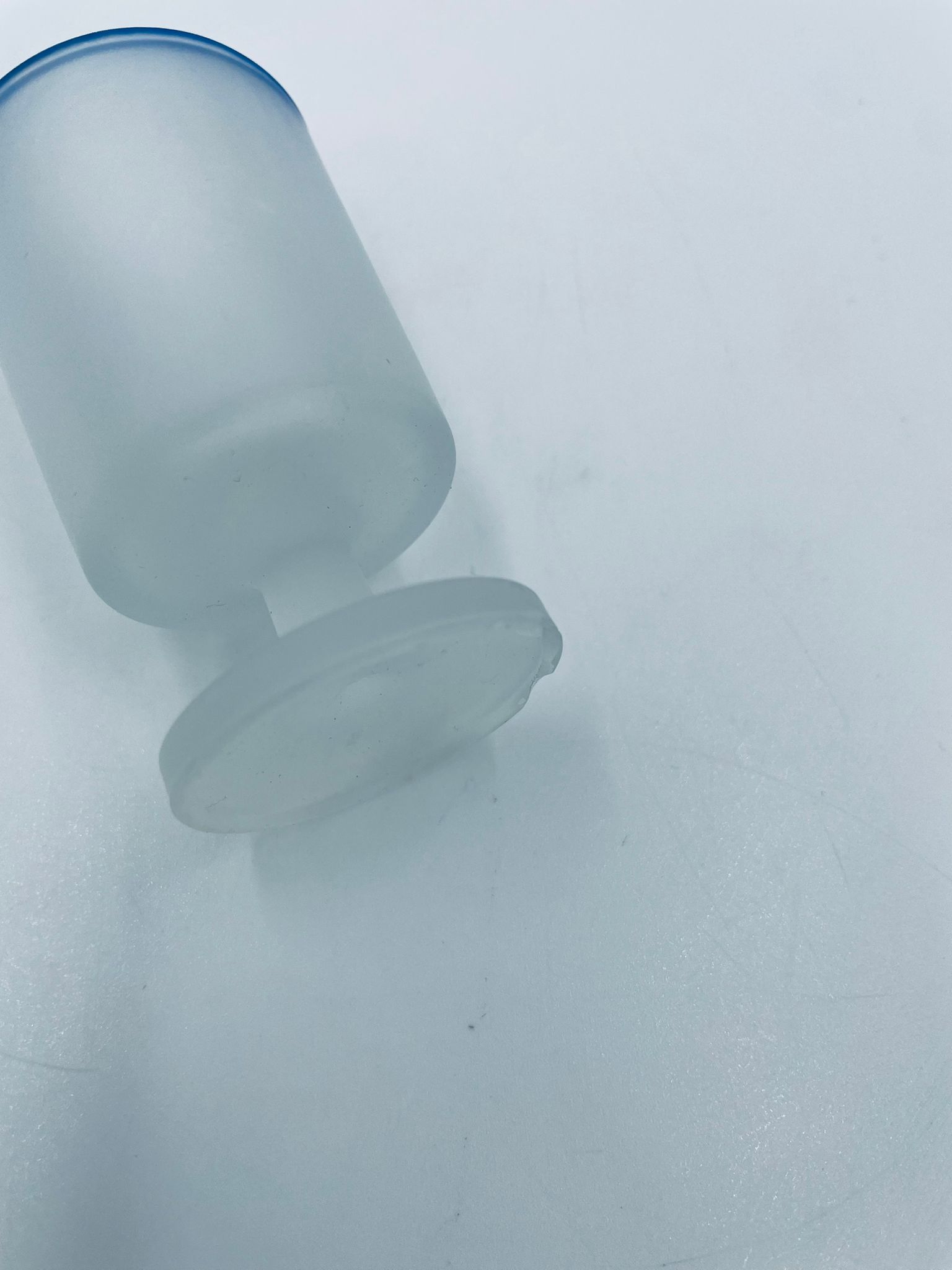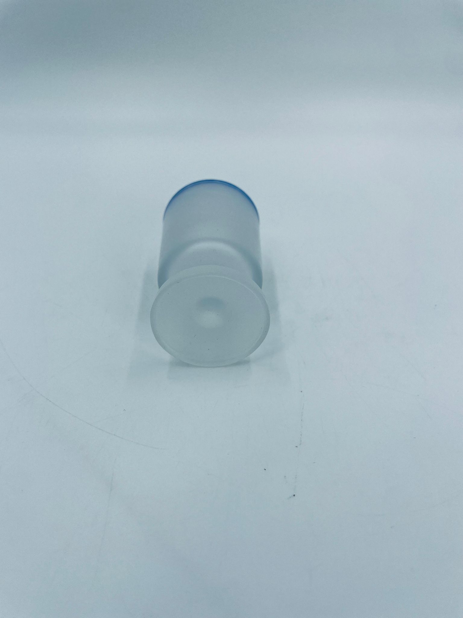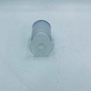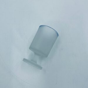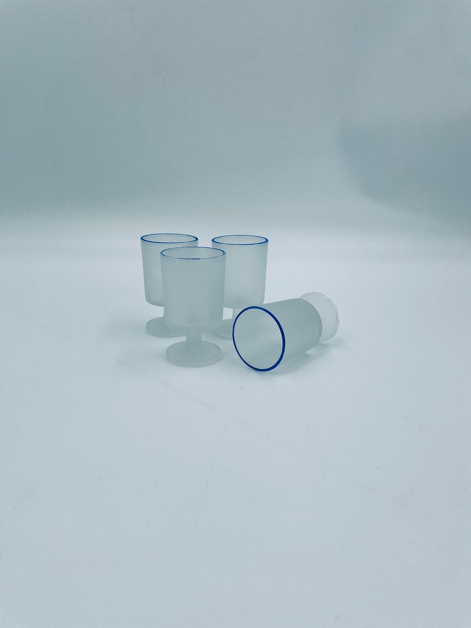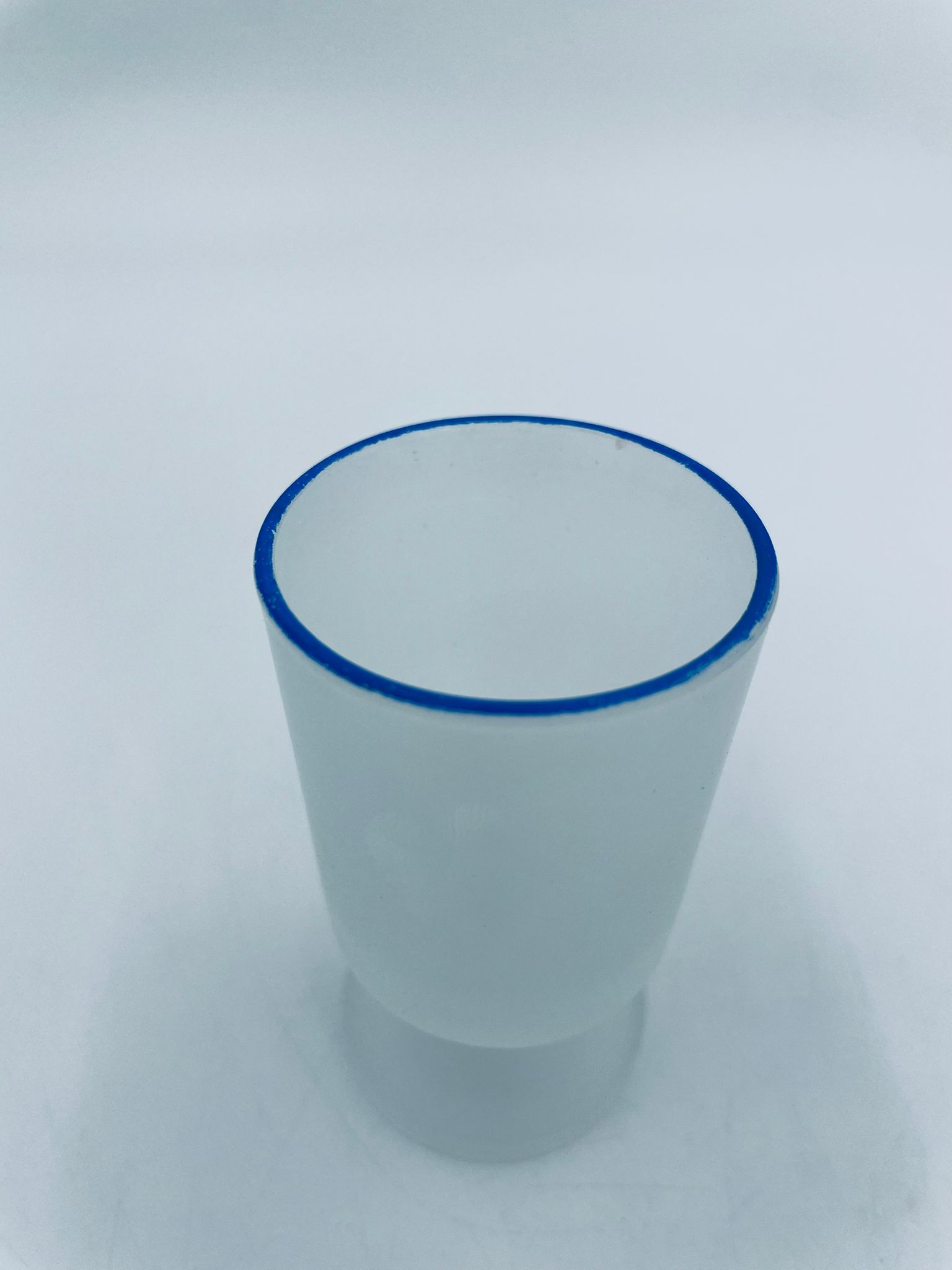 Kieliszek do wódki w stylu Vintage, wykonany z wysokiej jakości szkła. Kieliszek o matowym, mlecznym wykończeniem, osadzony na krótkiej nóżce i podstawie, wykończony niebieską obwódką na rancie. Posiada przetarcie na kolorze oraz uszczerbek na podstawie.