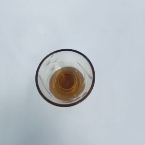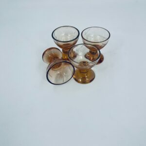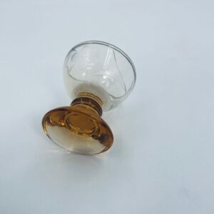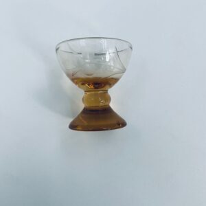 Kieliszek do wódki na nóżce w stylu Vintage, wykonany ze szkła przezroczystego, barwionego w bursztynowym kolorze. Charakteryzuje się trawionym wzorem kwiatowym na czarce i ozdobną nóżką.