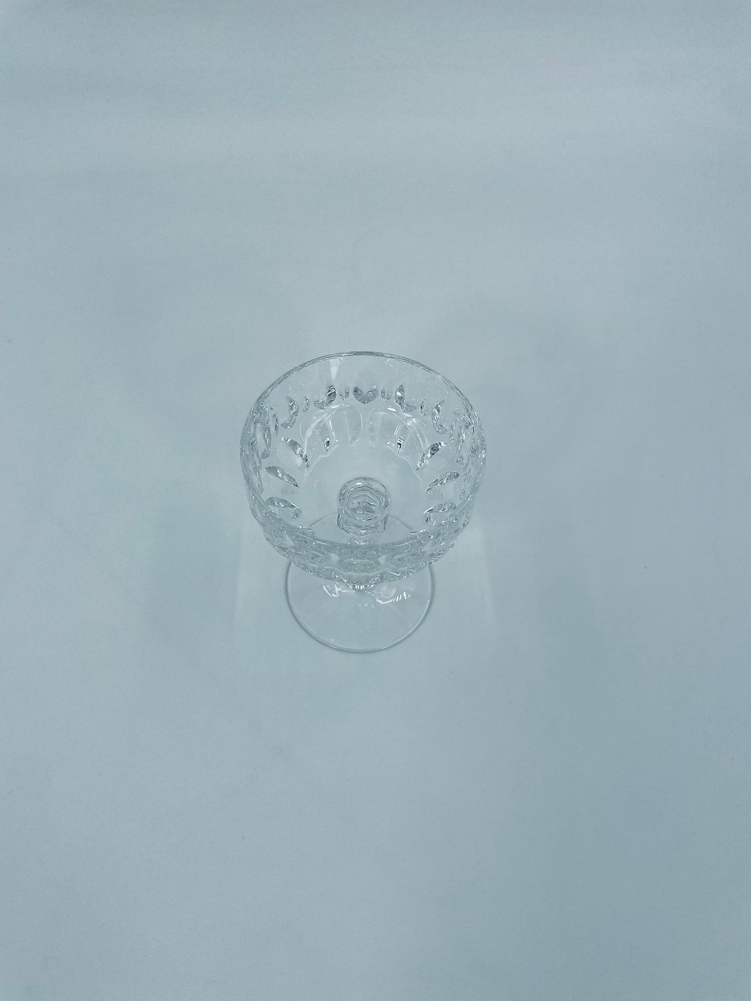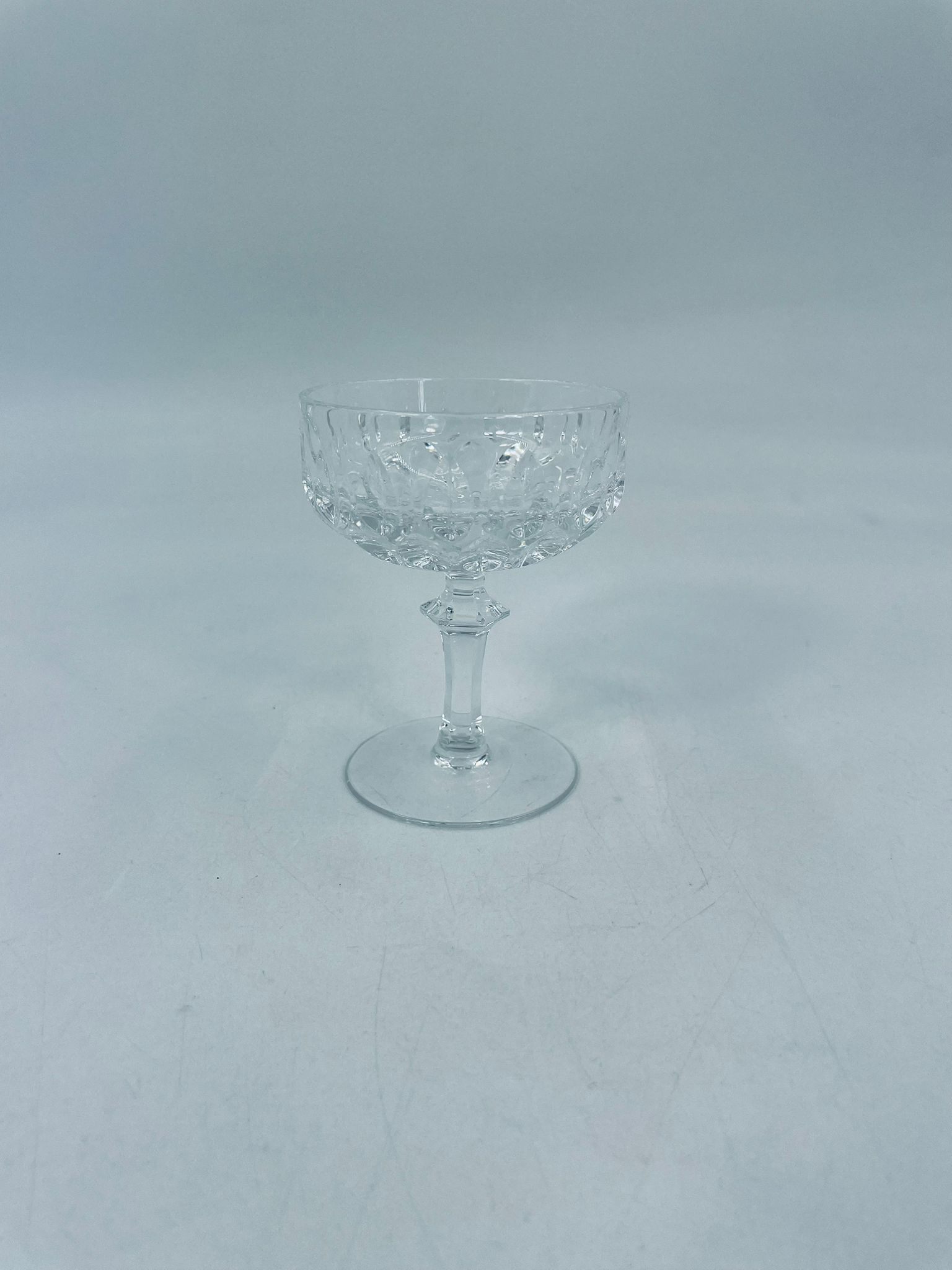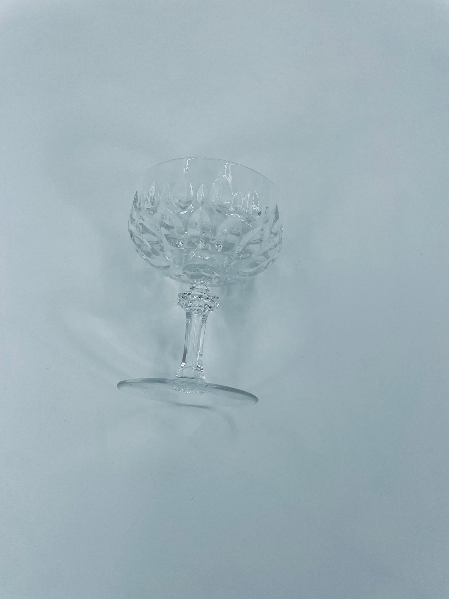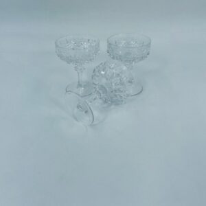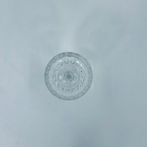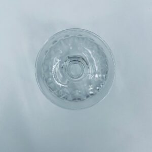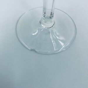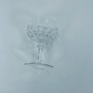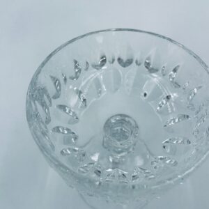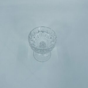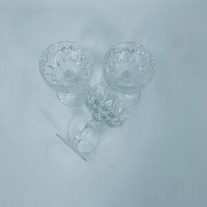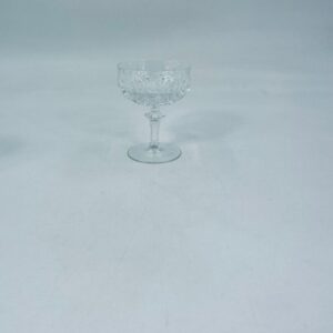 Kieliszek ze szkła kryształowego, przezroczysty. Kieliszek z charakterystyczną, rzeźbioną czarą i ozdobną nóżką, co nadaje eleganckiego i klasycznego wyglądu. Jeden kieliszek posiada uszczerbek na górnym rancie, a drugi na podstawie.