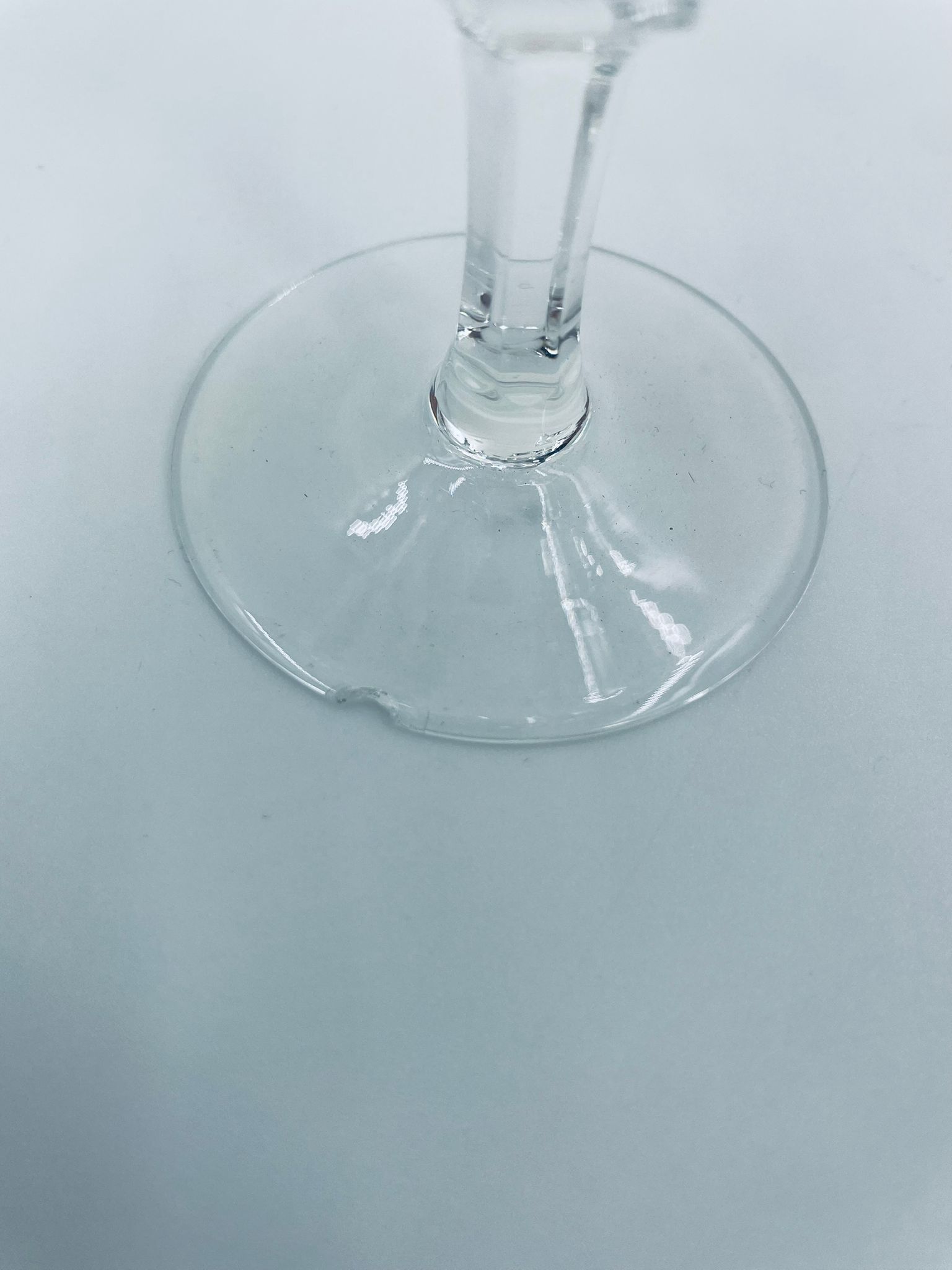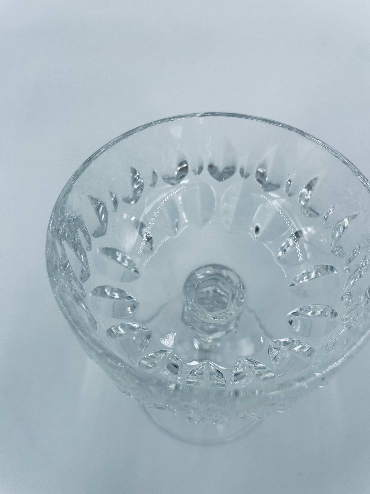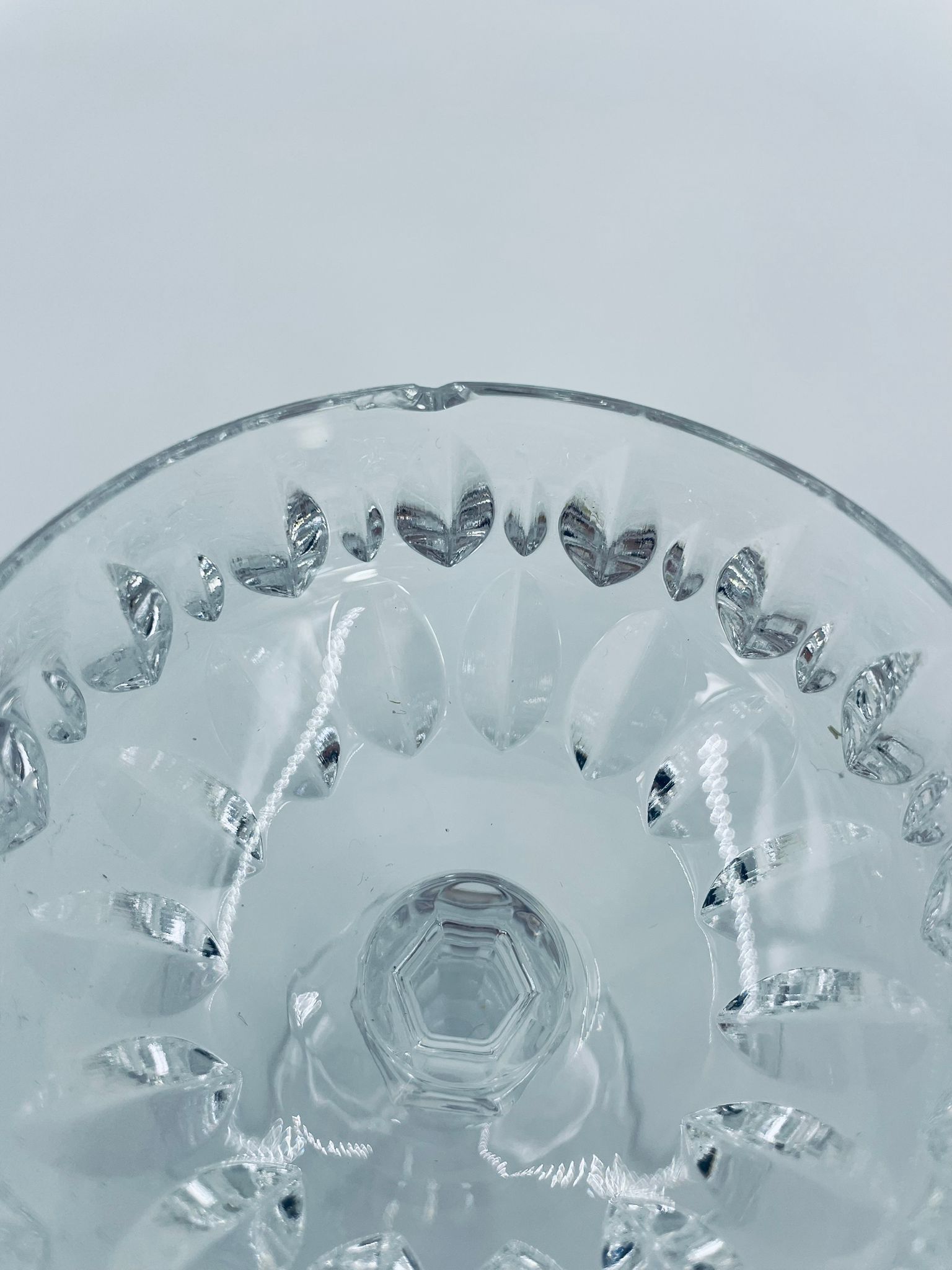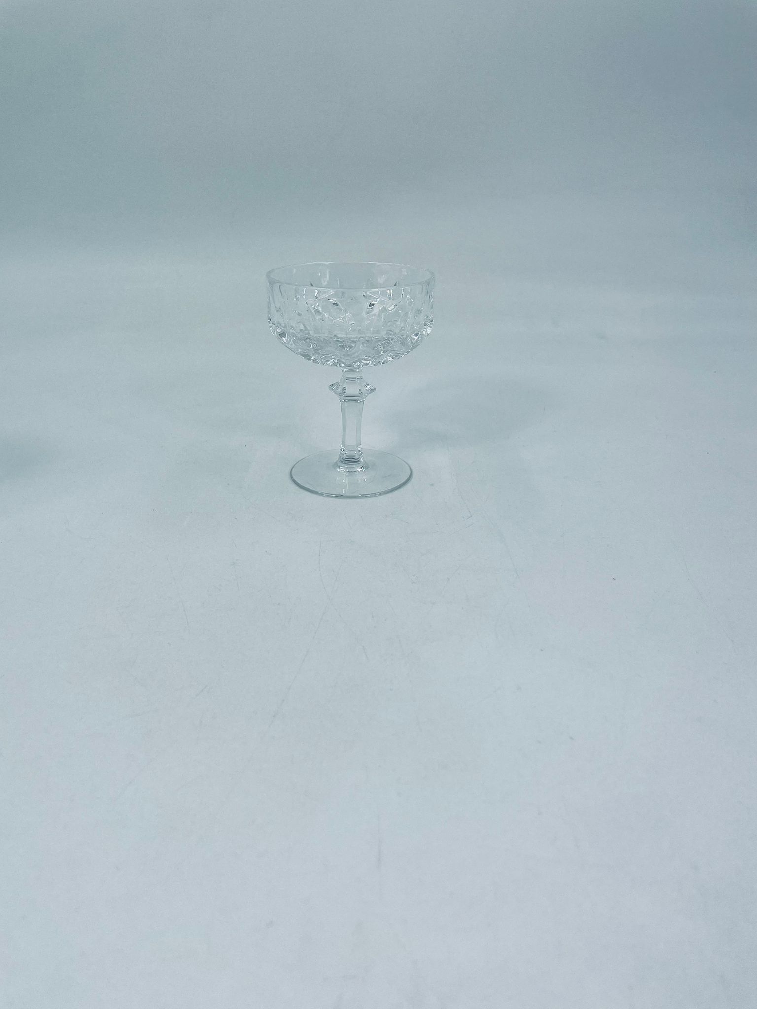 Kieliszek ze szkła kryształowego, przezroczysty. Kieliszek z charakterystyczną, rzeźbioną czarą i ozdobną nóżką, co nadaje eleganckiego i klasycznego wyglądu. Jeden kieliszek posiada uszczerbek na górnym rancie, a drugi na podstawie.
