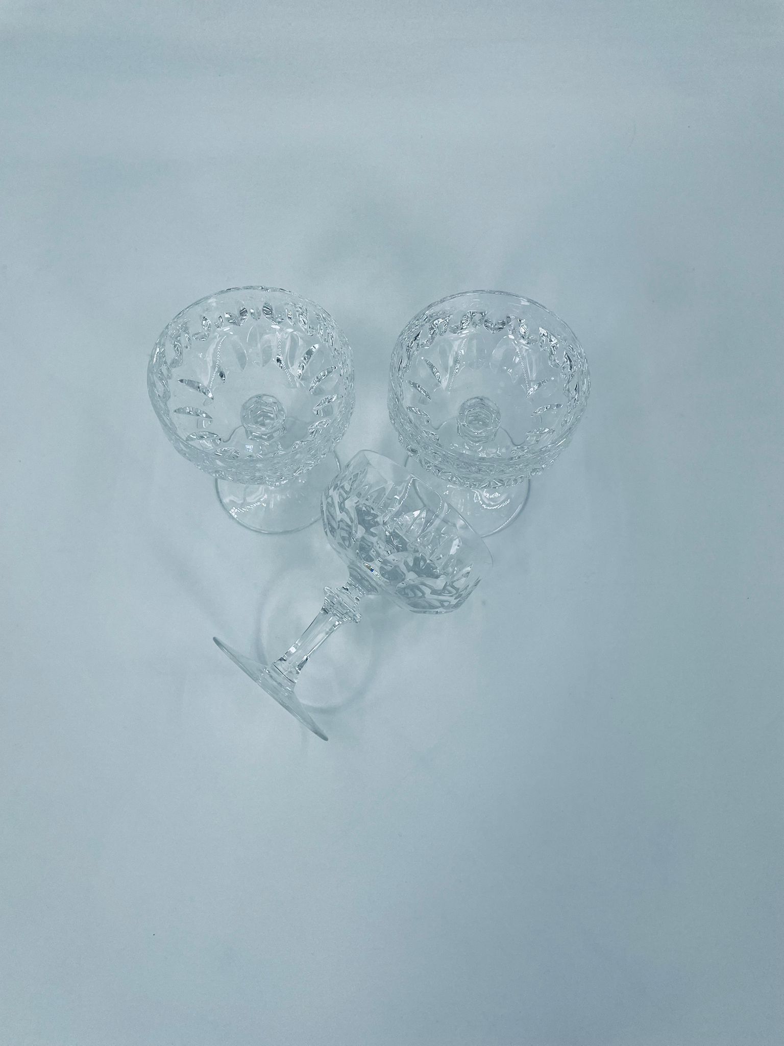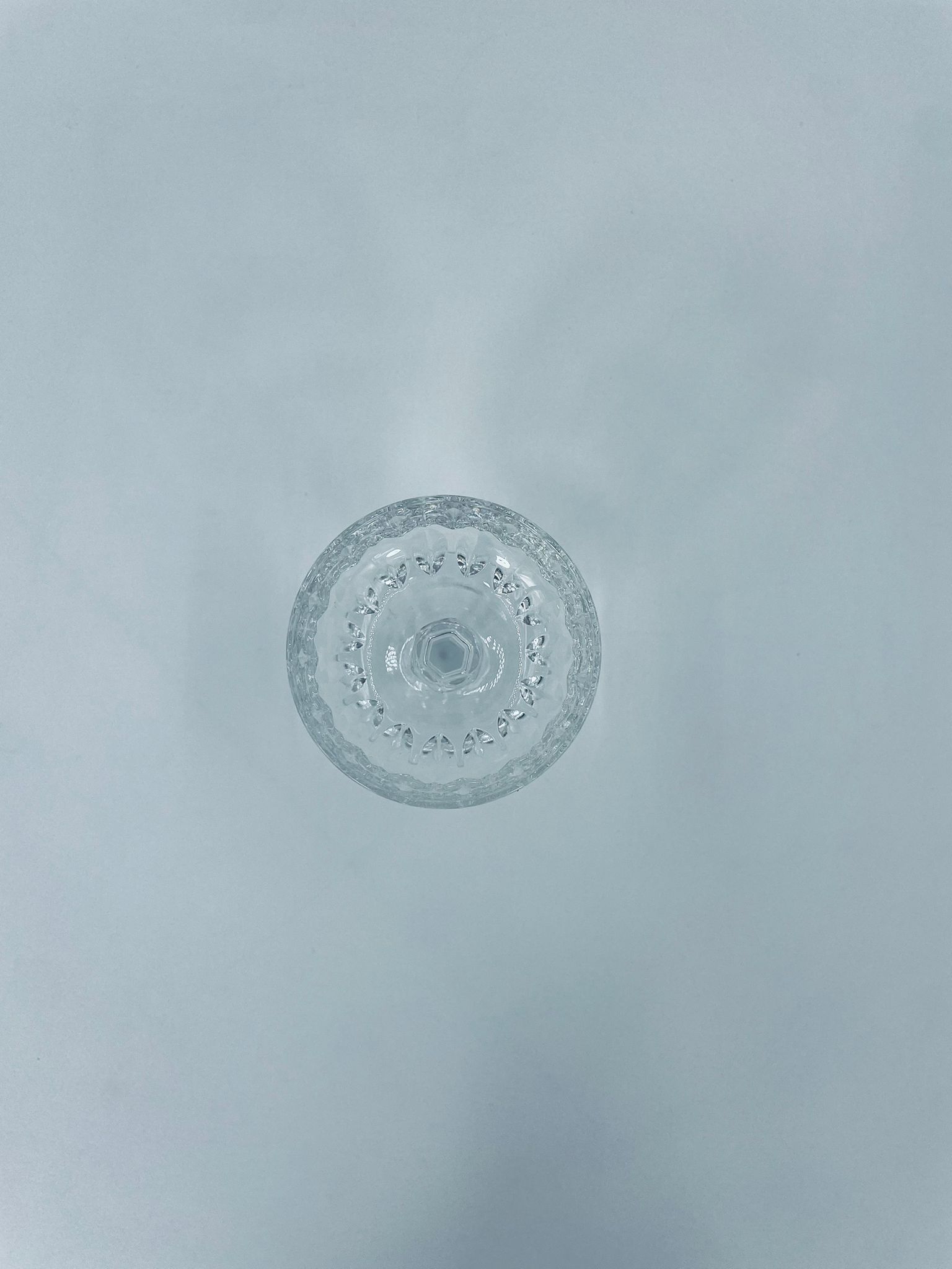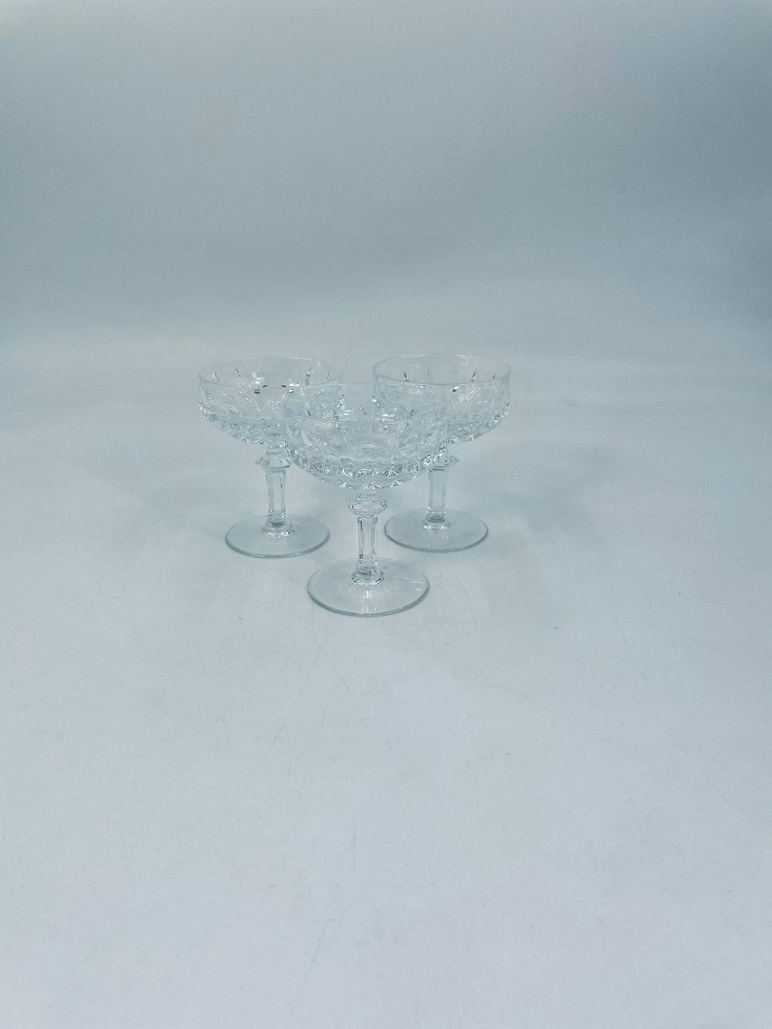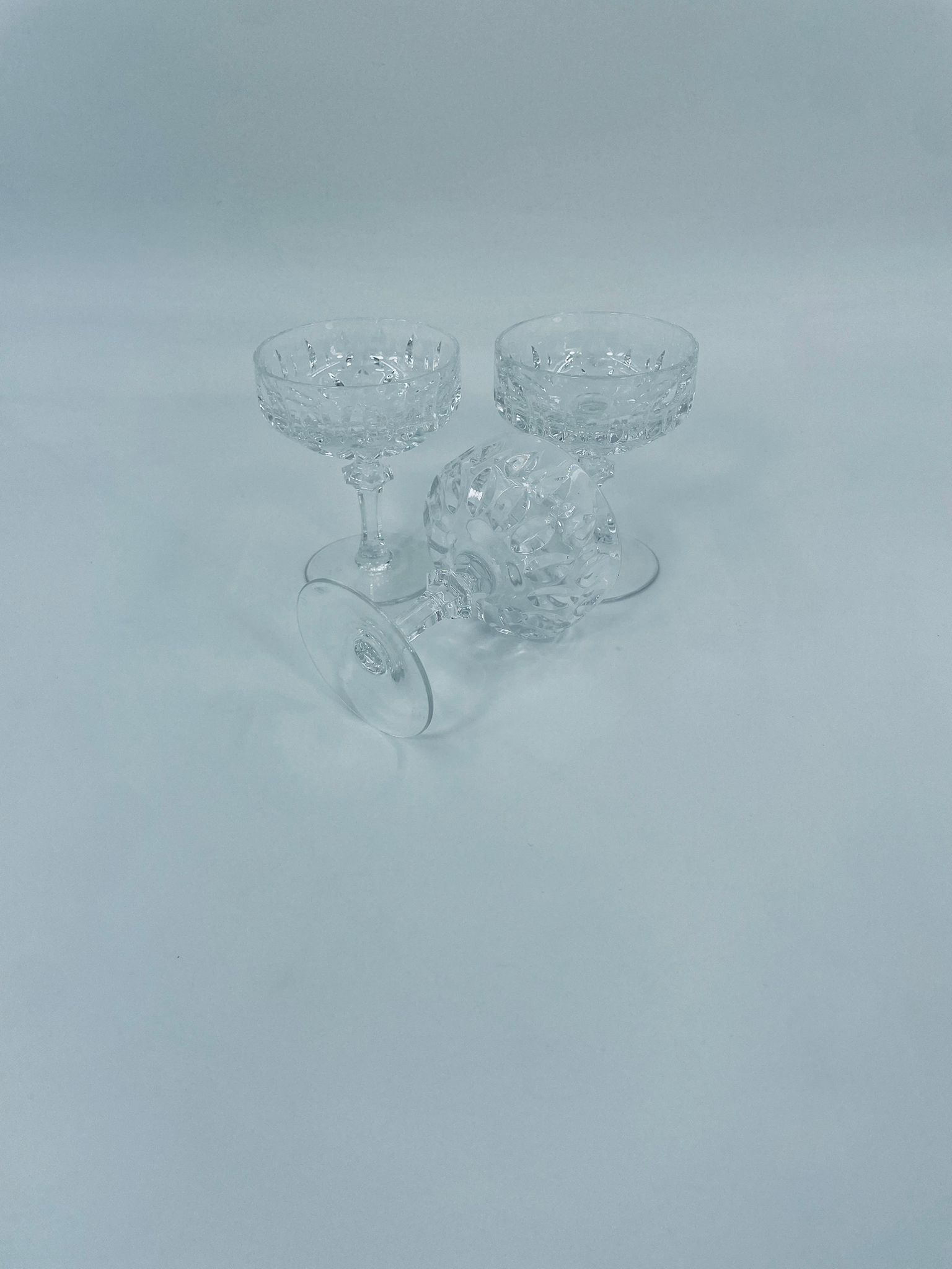 Kieliszek ze szkła kryształowego, przezroczysty. Kieliszek z charakterystyczną, rzeźbioną czarą i ozdobną nóżką, co nadaje eleganckiego i klasycznego wyglądu. Jeden kieliszek posiada uszczerbek na górnym rancie, a drugi na podstawie.