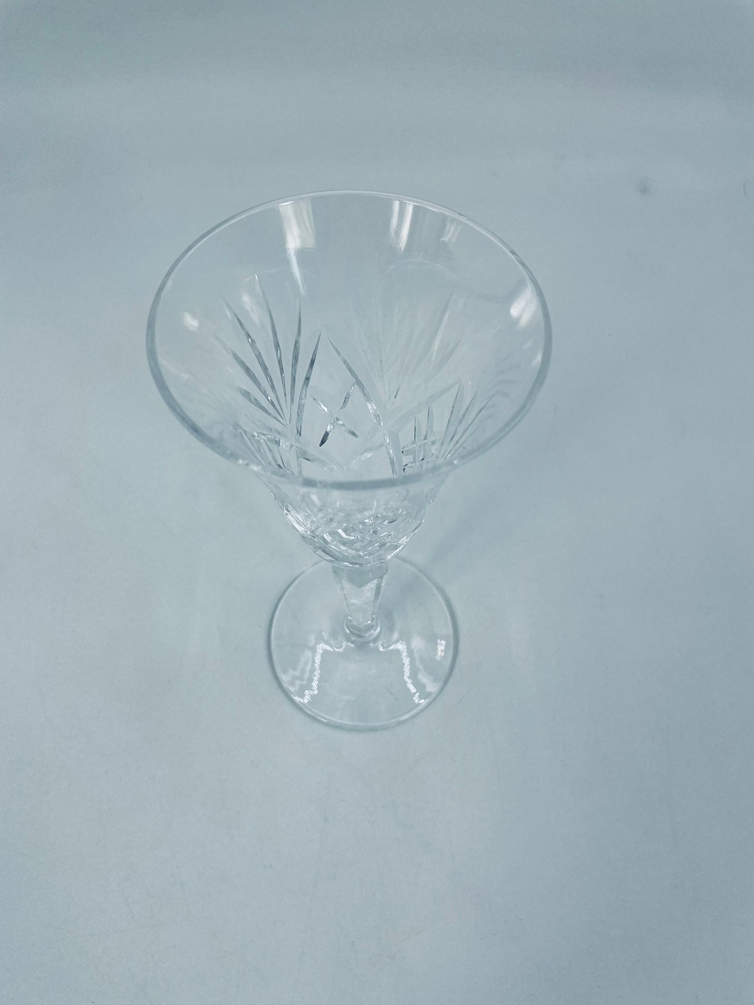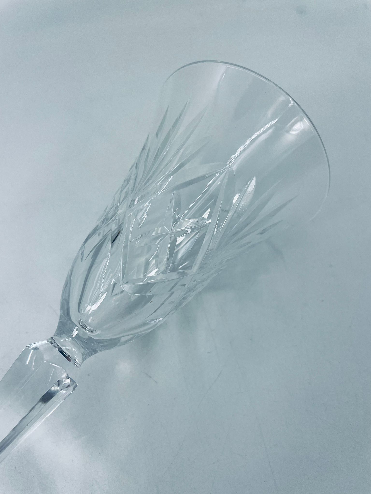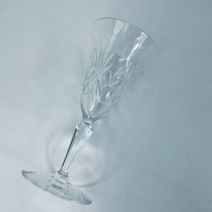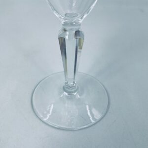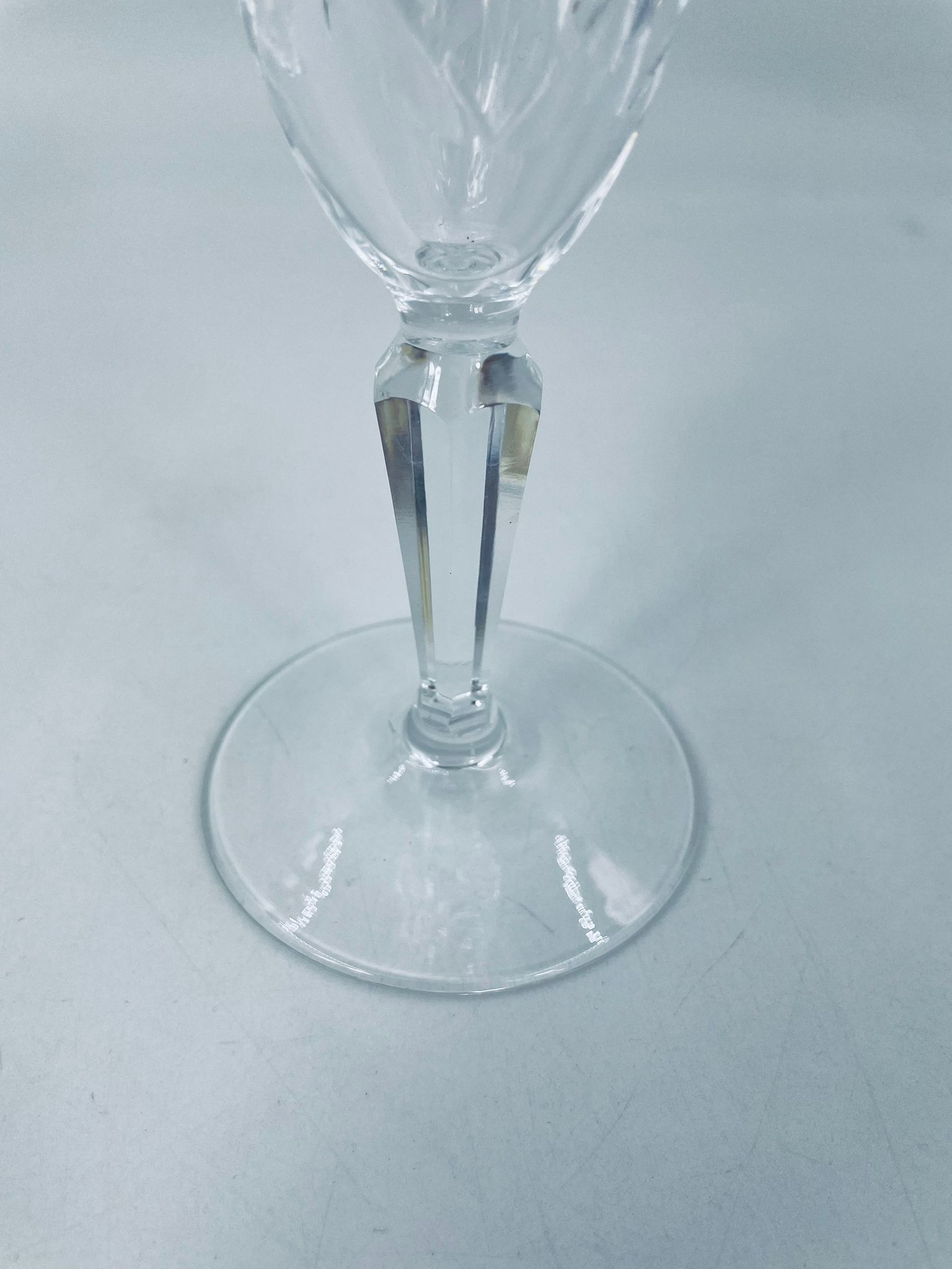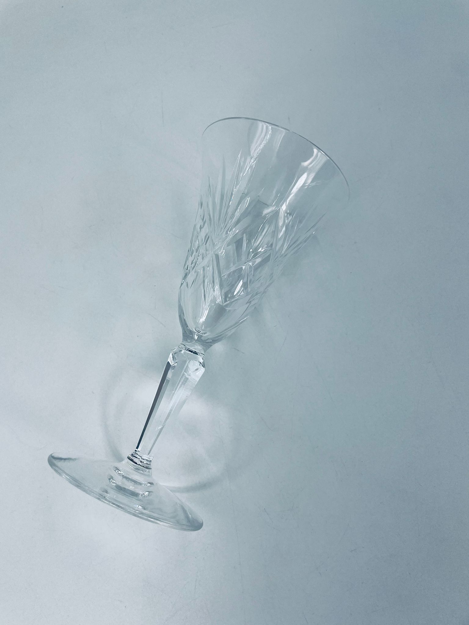 Kieliszek kryształowy do szampana. Wyróżnia się fasetowanym wzorem na czarce i nóżce. Kryształ bezbarwny.