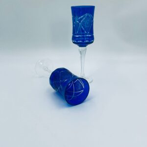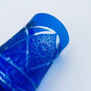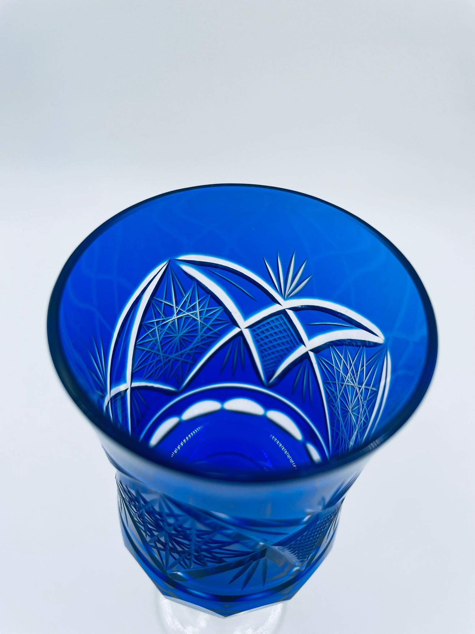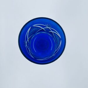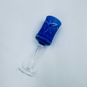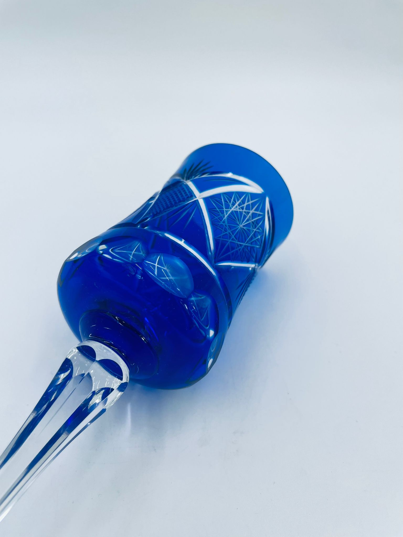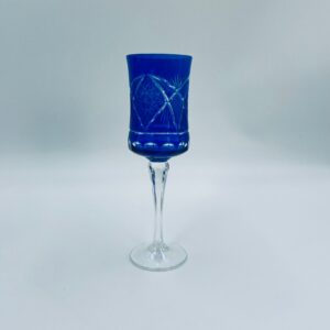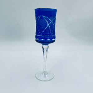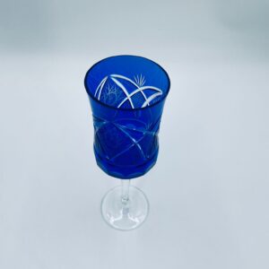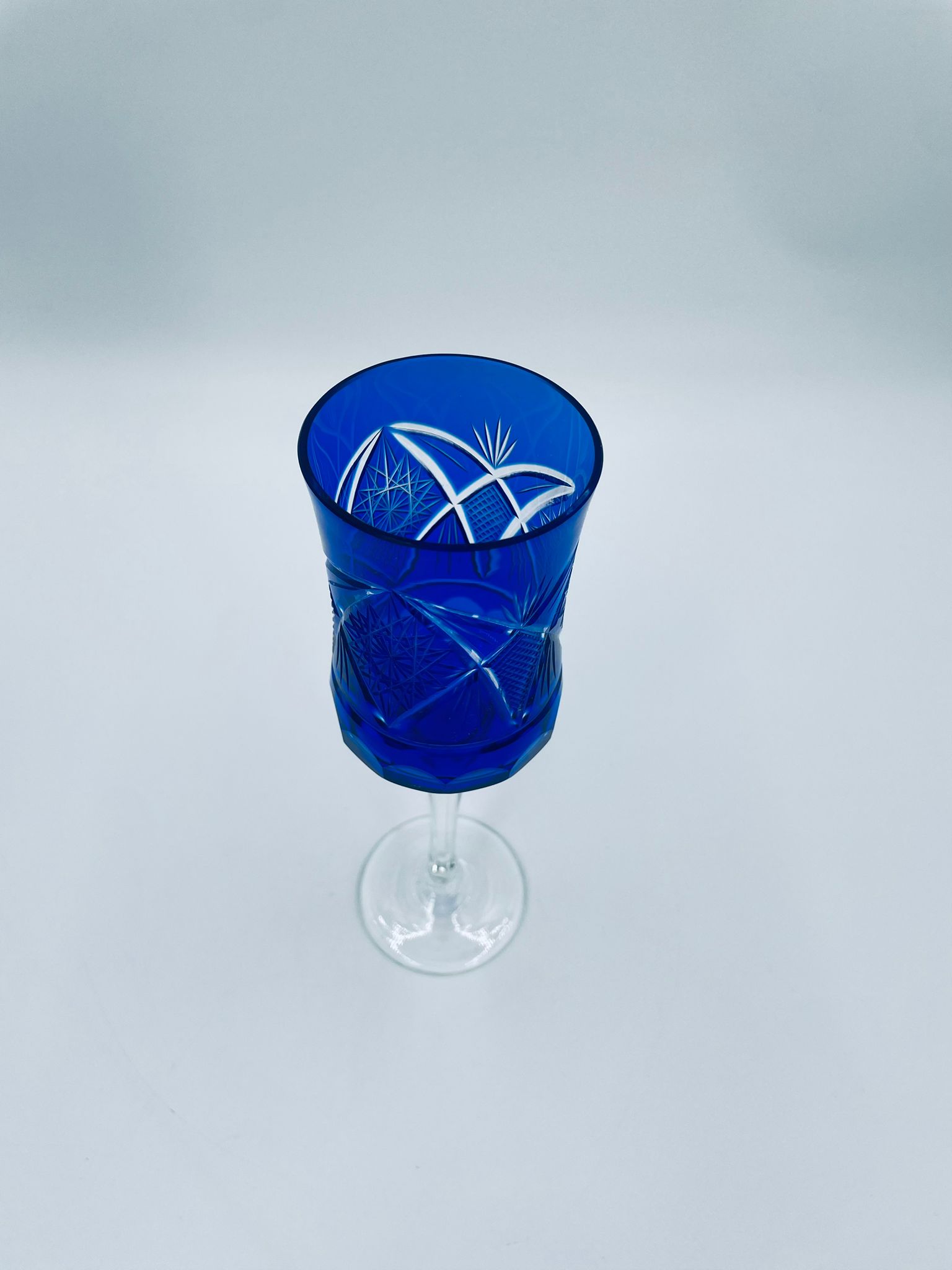 Kieliszek do szampana typu Römer, wykonany z wysokiej jakości szkła kryształowego, ołowiowego, dwuwarstwowego. Kieliszek w kolorze kobaltowego błękitu z techniką cut-to-Clear, ozdobiony bogatym, geometrycznym szlifem, posiada dugą, fasetowana nóżkę oraz stabilną postawę.