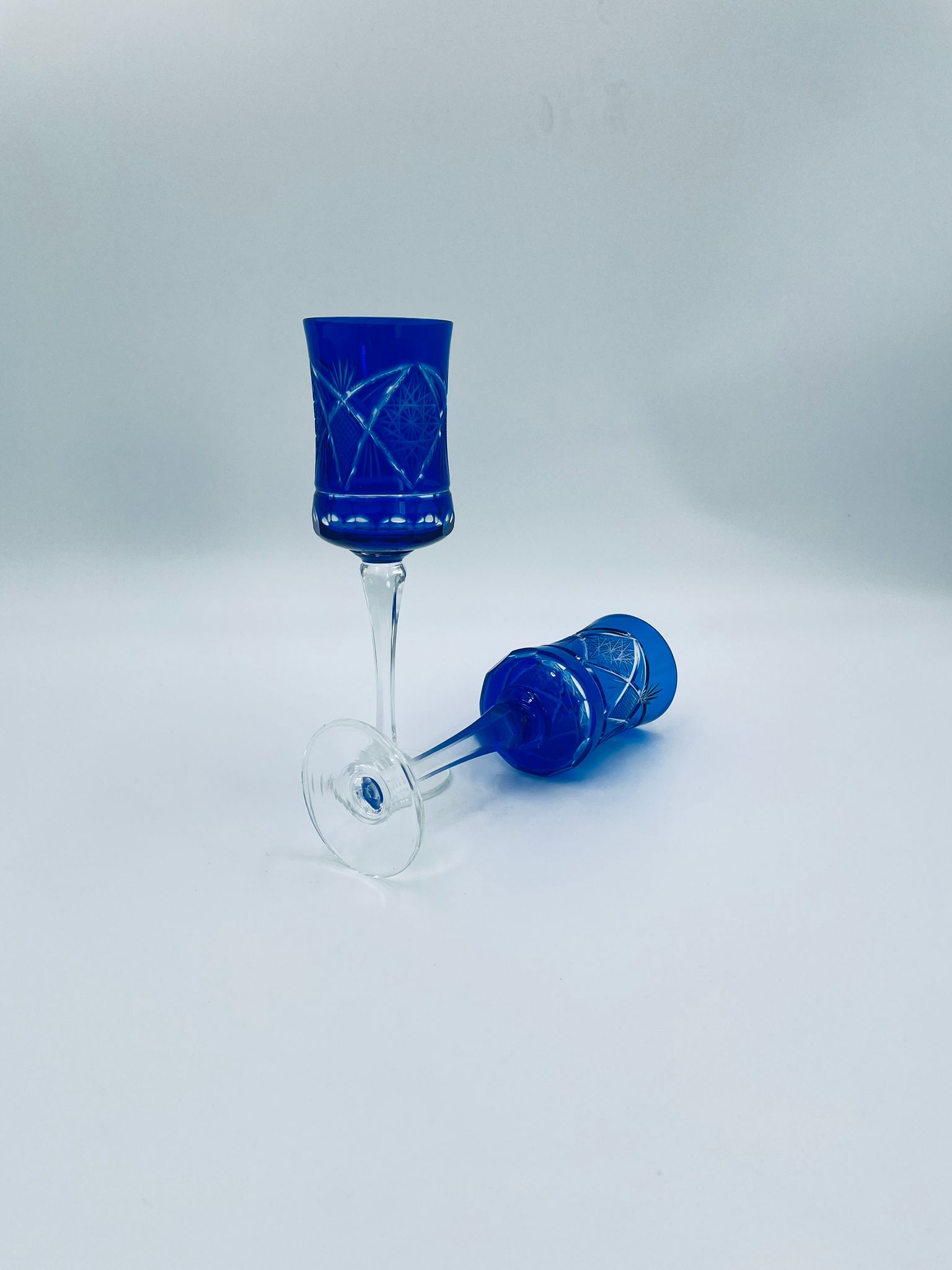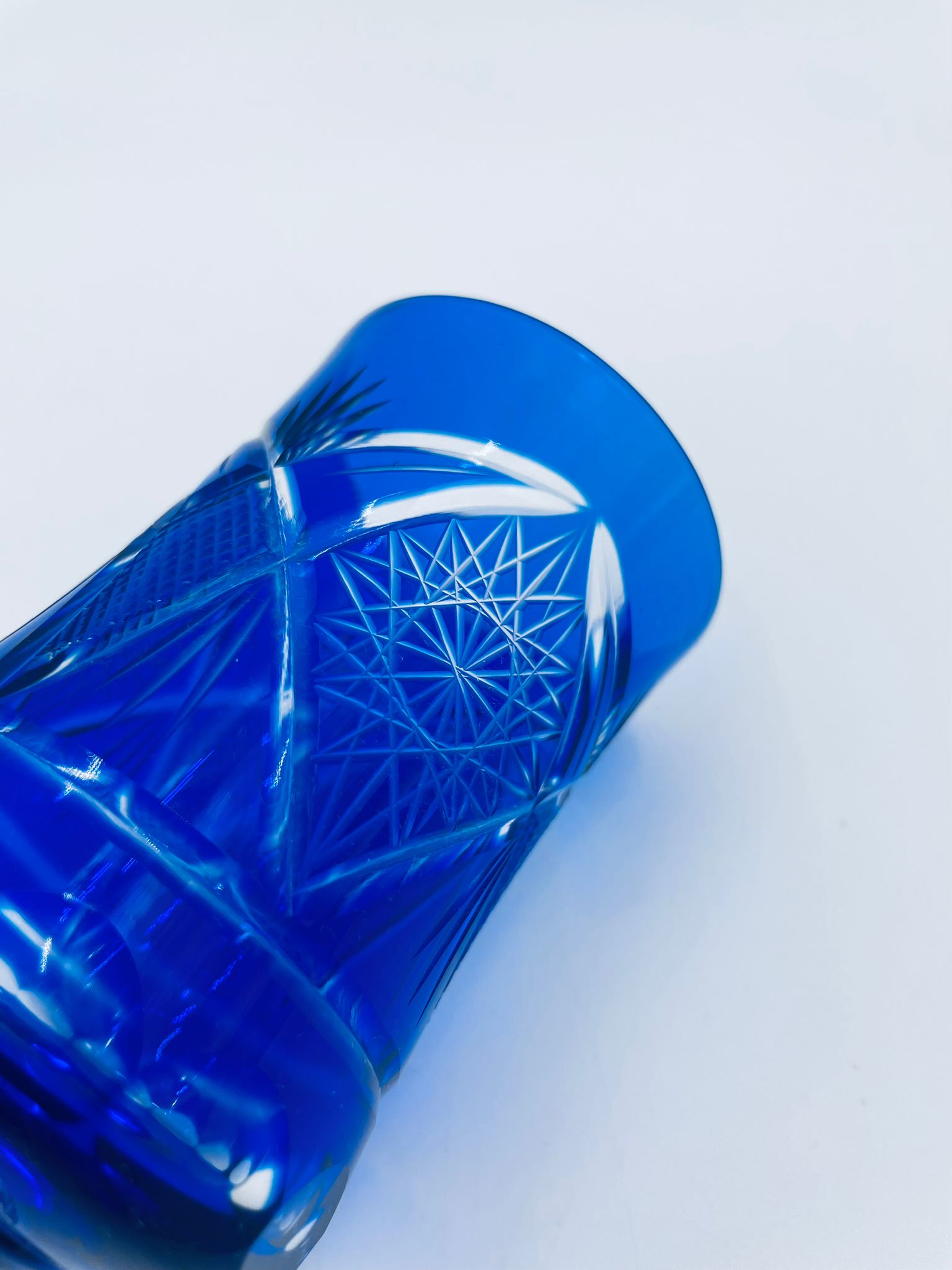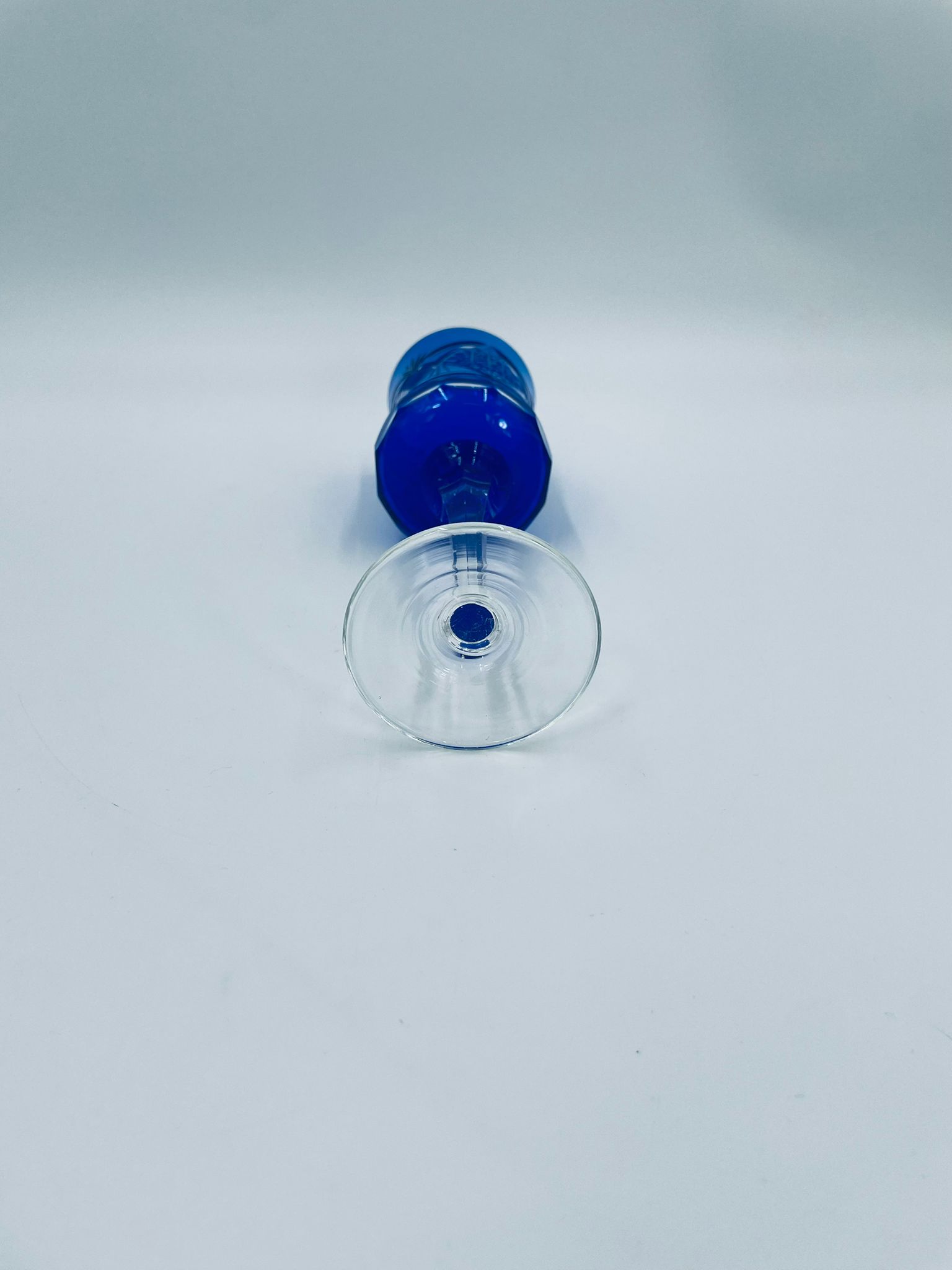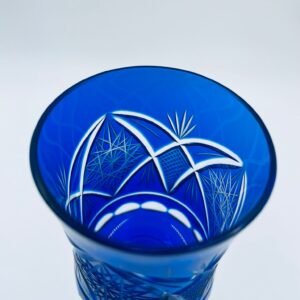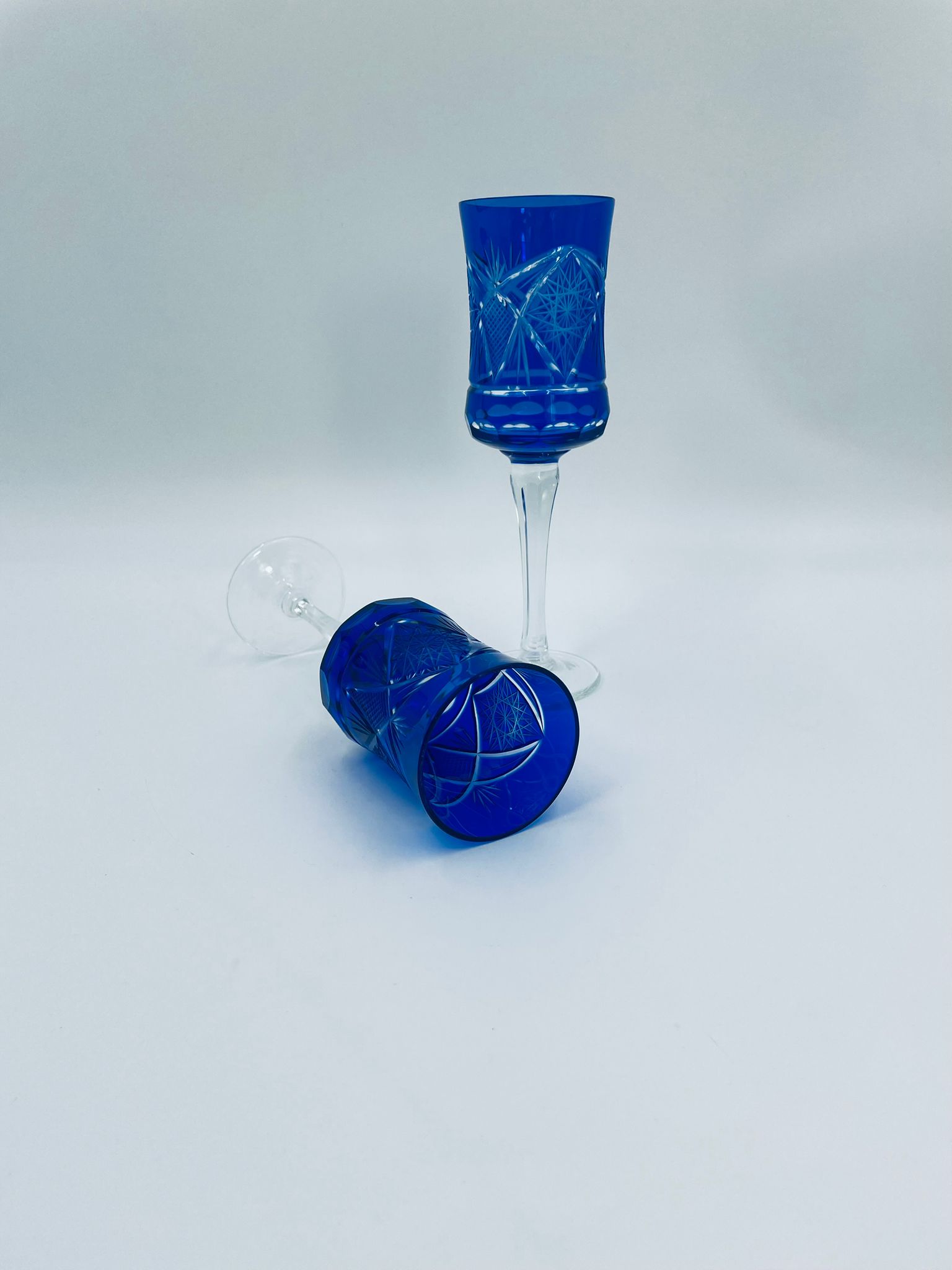 Kieliszek do szampana typu Römer, wykonany z wysokiej jakości szkła kryształowego, ołowiowego, dwuwarstwowego. Kieliszek w kolorze kobaltowego błękitu z techniką cut-to-Clear, ozdobiony bogatym, geometrycznym szlifem, posiada dugą, fasetowana nóżkę oraz stabilną postawę.