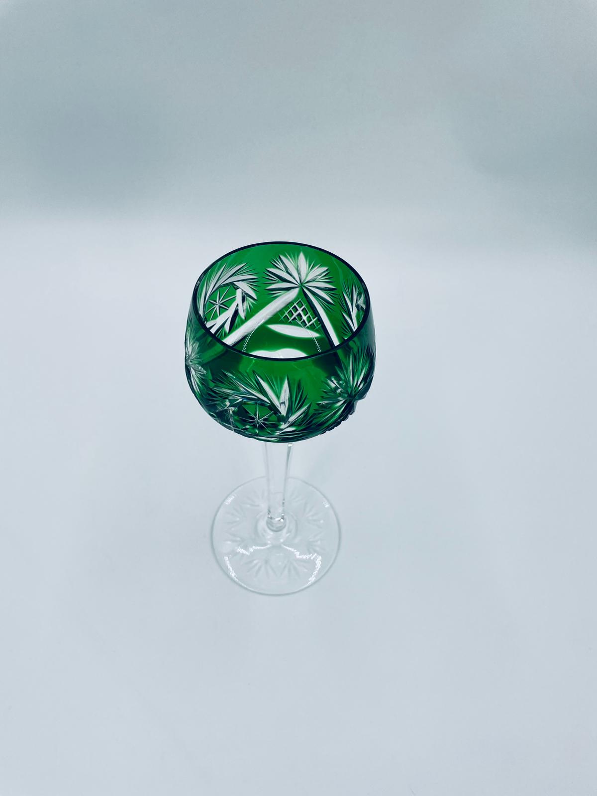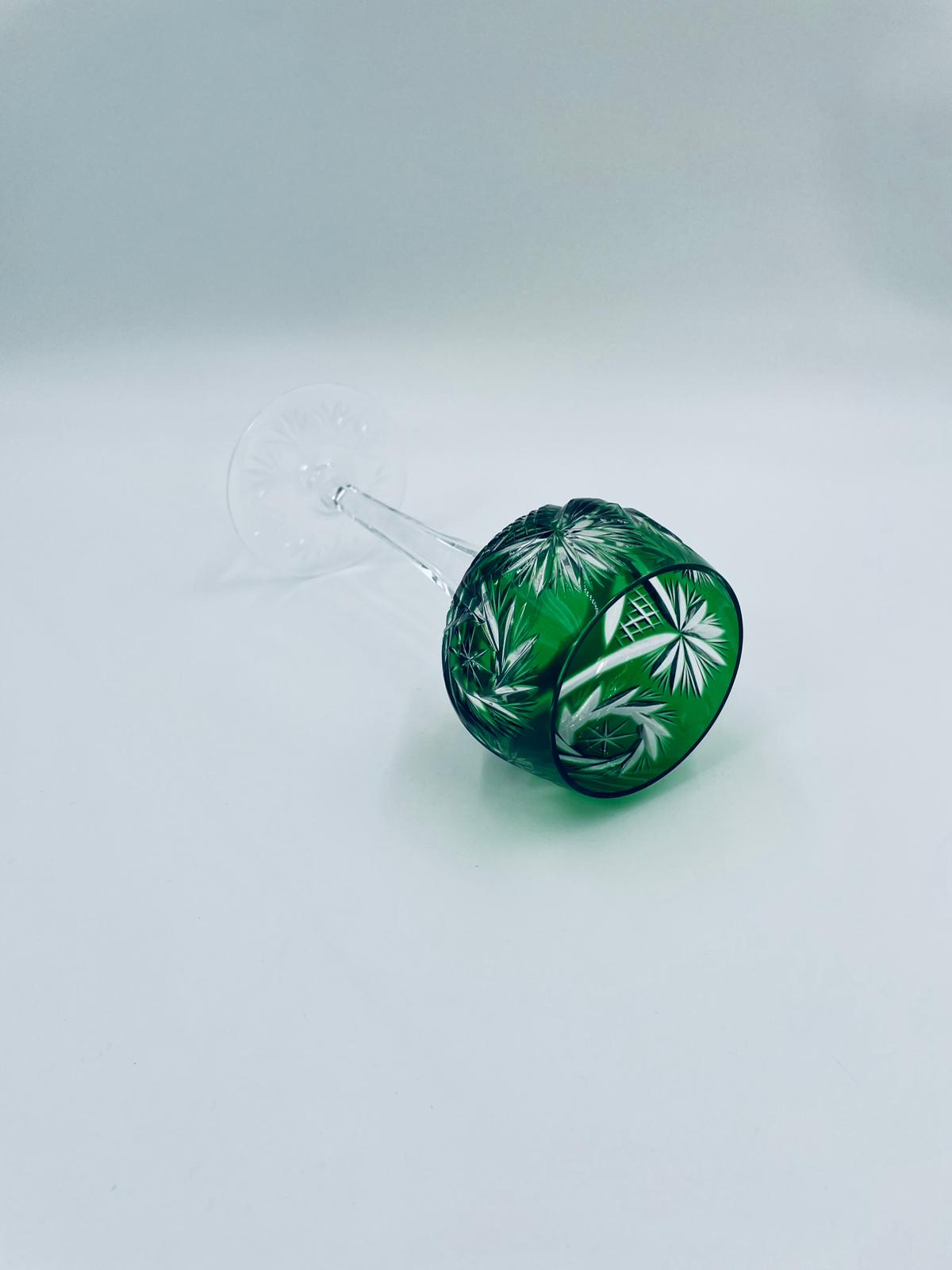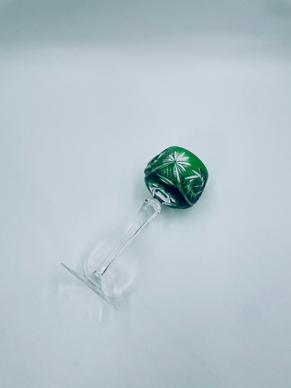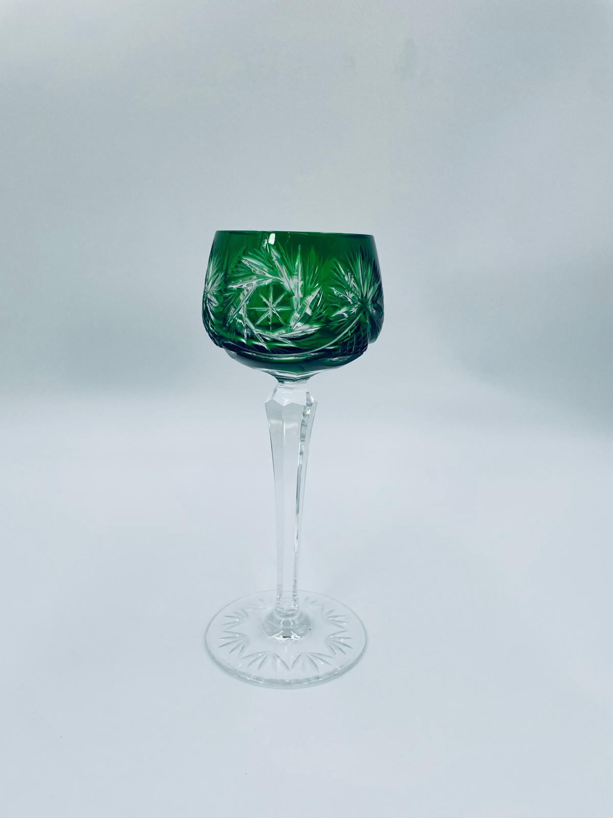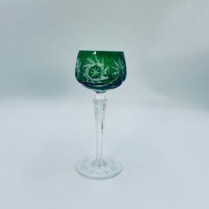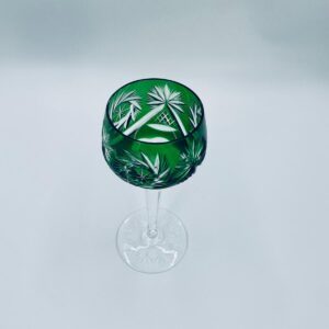 Kieliszek do wina typu Römer, prawdopodobnie wykonany przez renomowaną Hutę Józefina w czasach PRL-u, wykonany z wysokiej jakości szkła kryształowego. Kieliszek posiada szmaragdową, dwuwarstwową czarę z ręcznie szlifowanym, ozdobnym wzorem gwiazd i wachlarzy , smukłą i fasetowana nóżkę oraz ozdobną podstawę z precyzyjnym szlifem.
