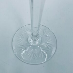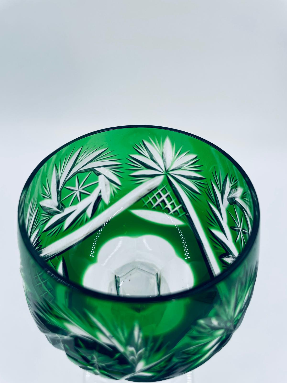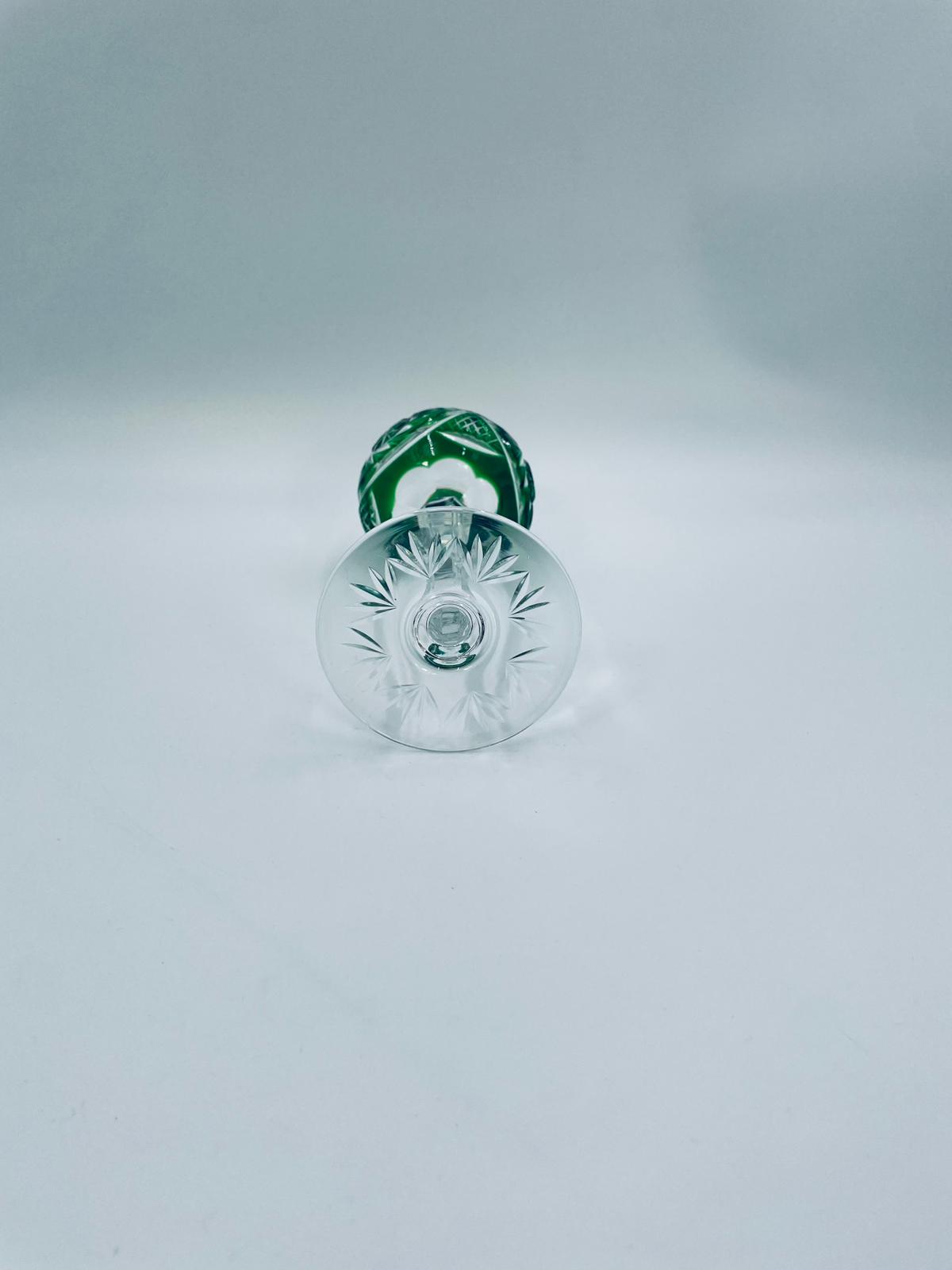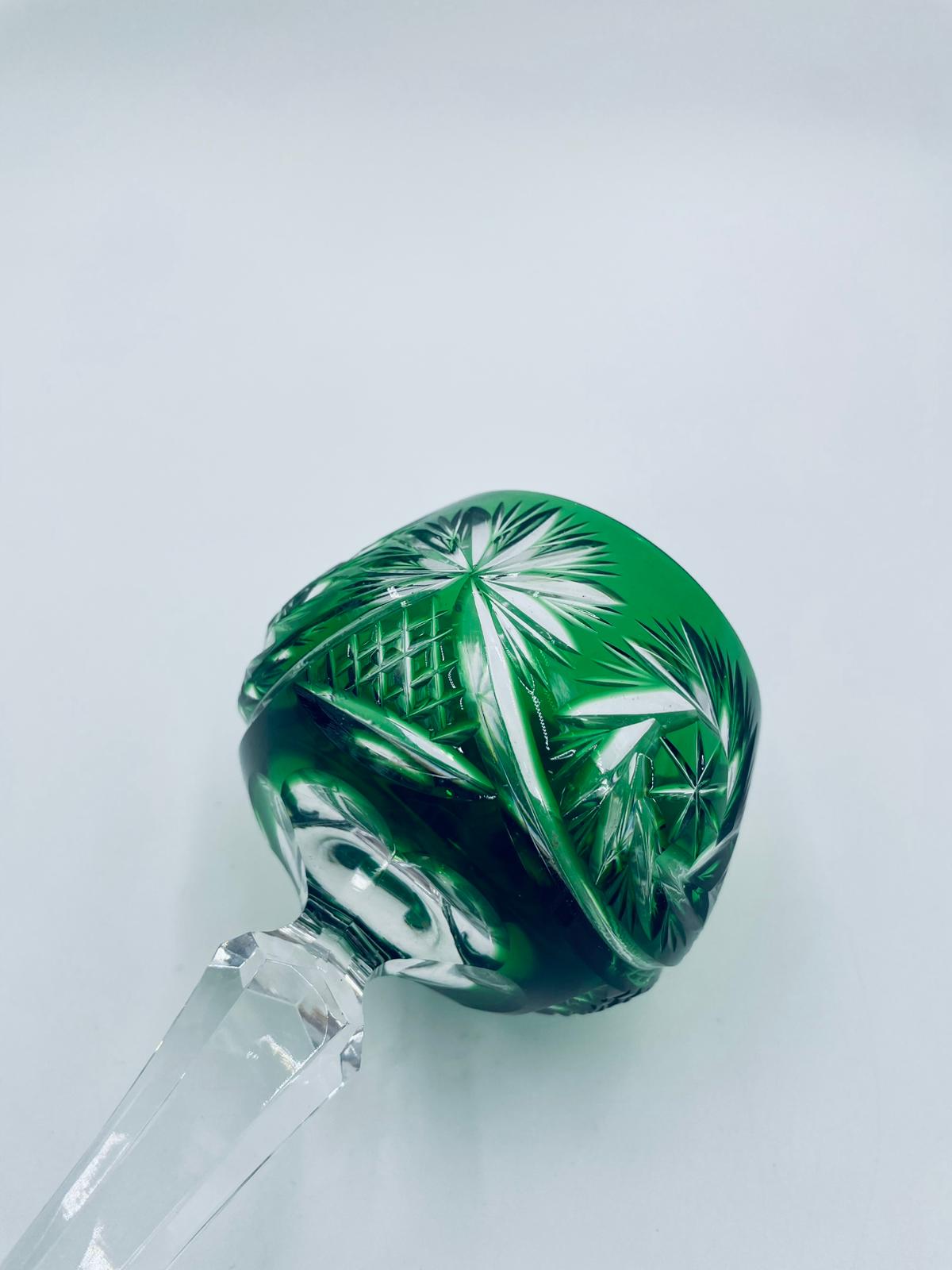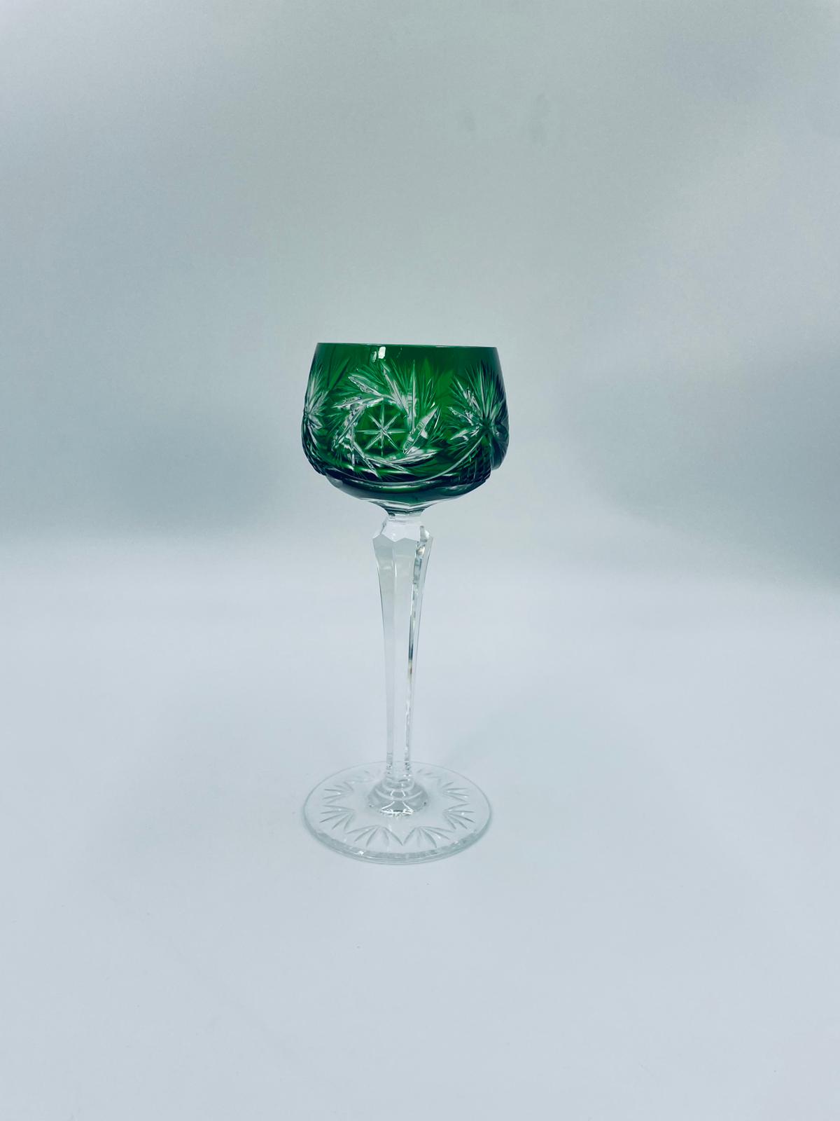 Kieliszek do wina typu Römer, prawdopodobnie wykonany przez renomowaną Hutę Józefina w czasach PRL-u, wykonany z wysokiej jakości szkła kryształowego. Kieliszek posiada szmaragdową, dwuwarstwową czarę z ręcznie szlifowanym, ozdobnym wzorem gwiazd i wachlarzy , smukłą i fasetowana nóżkę oraz ozdobną podstawę z precyzyjnym szlifem.