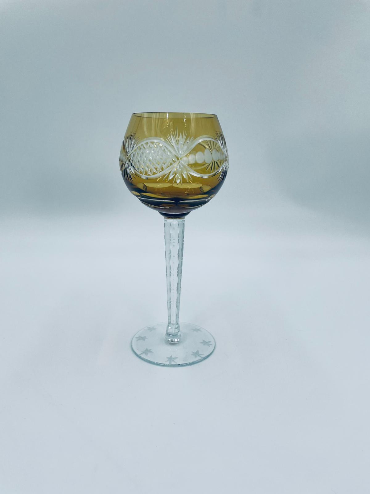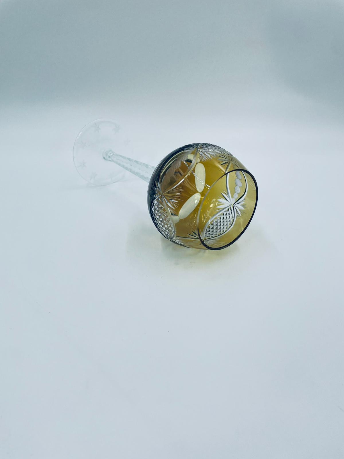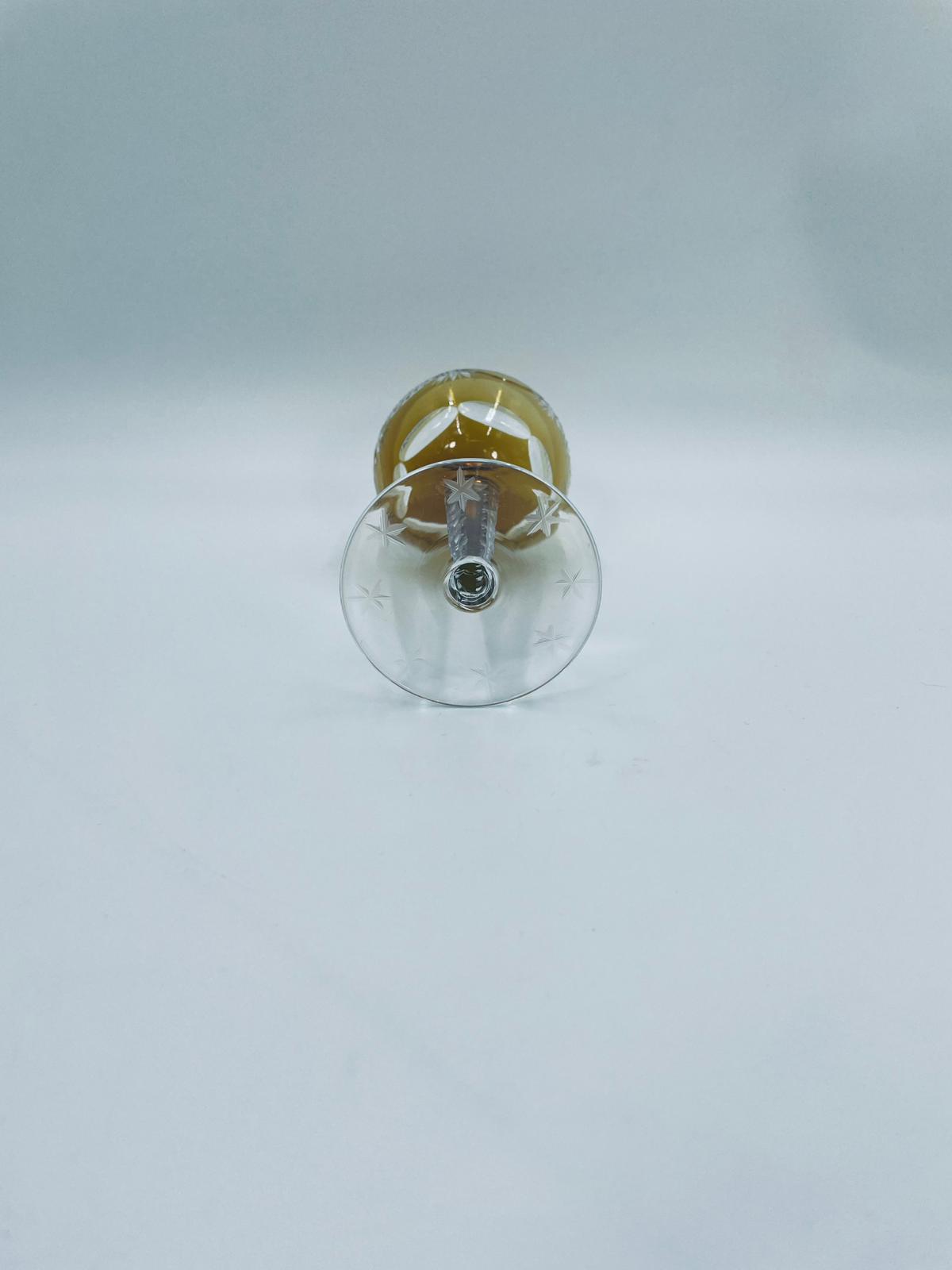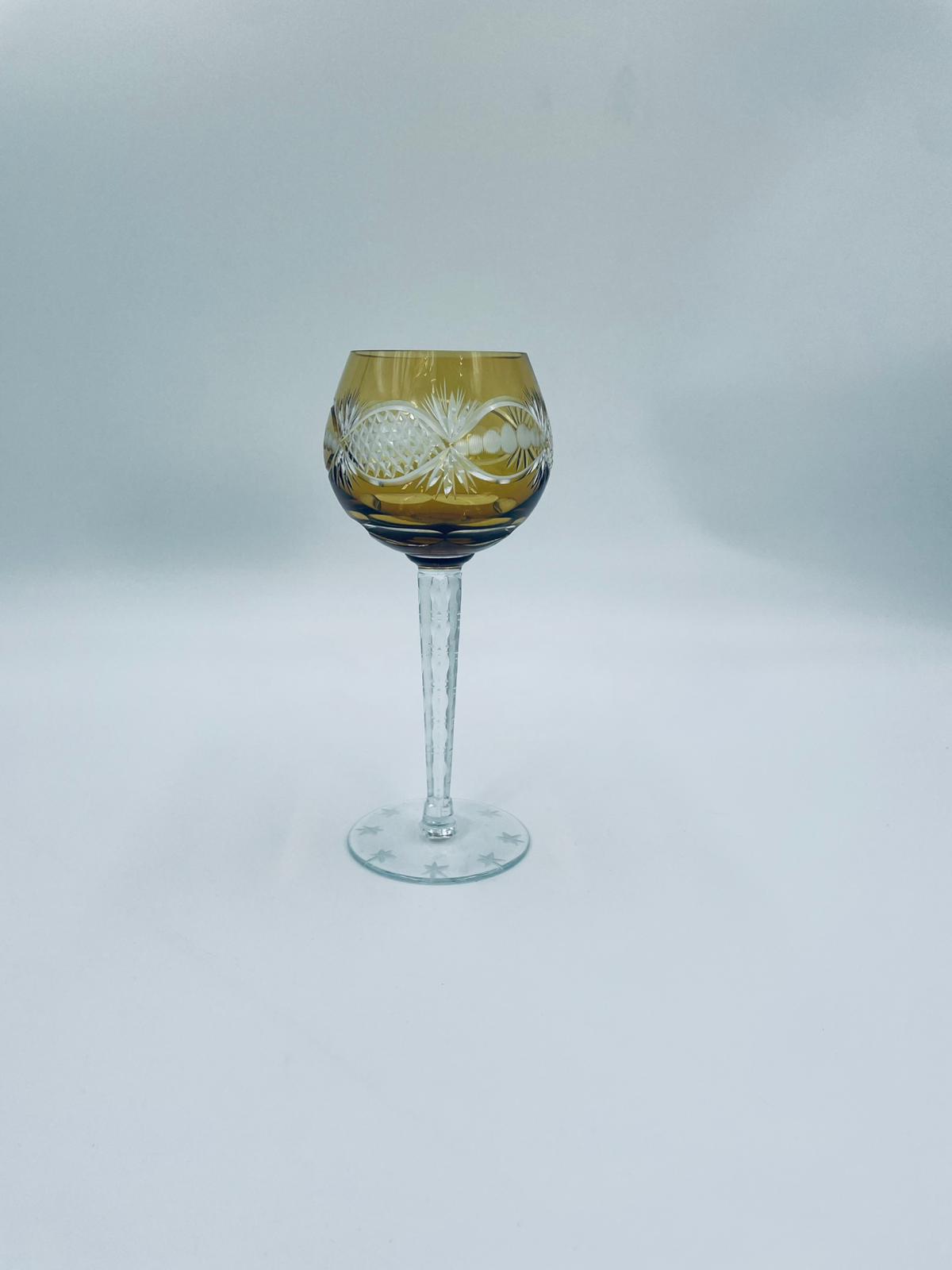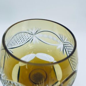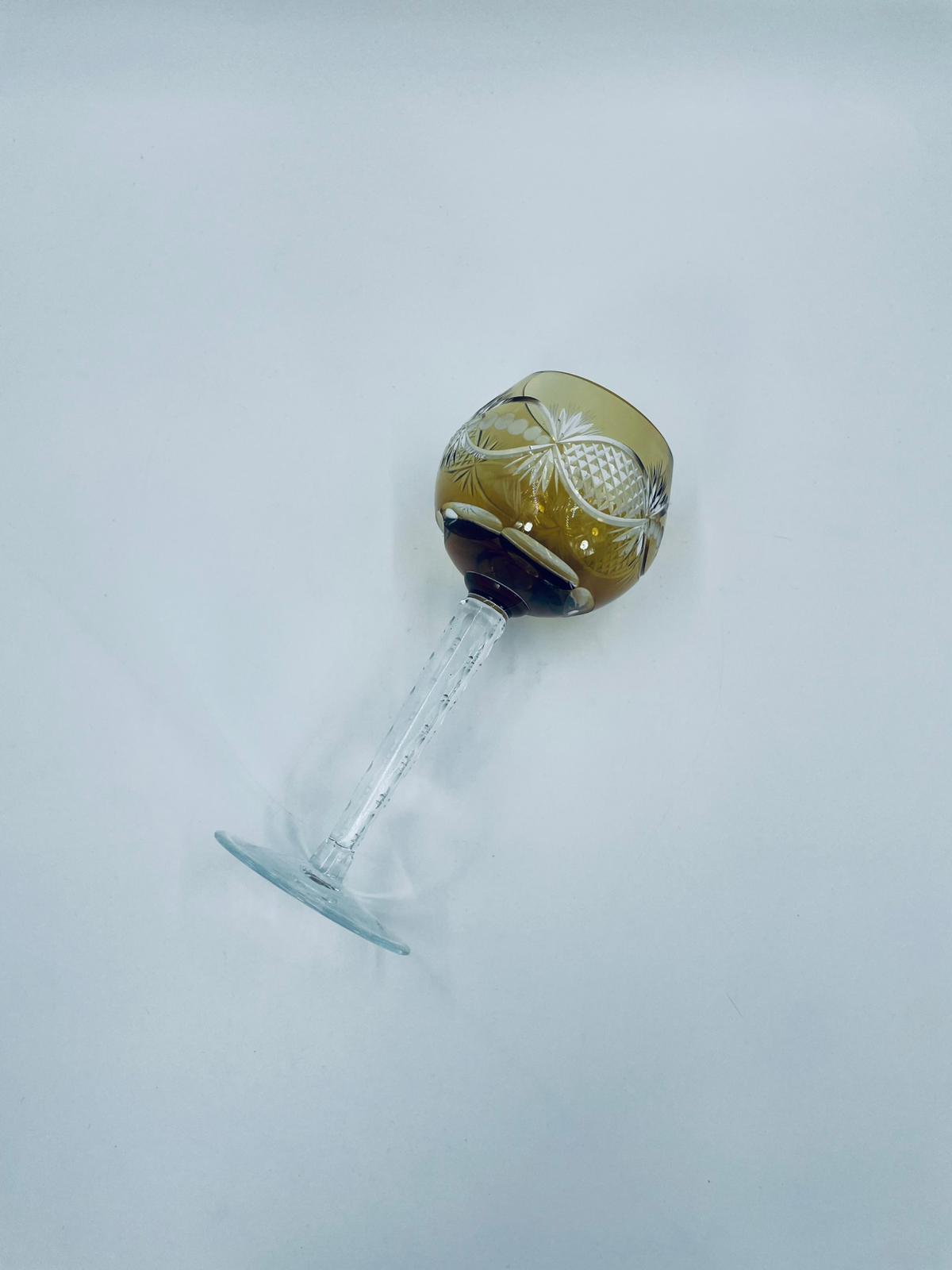 Kieliszek do wina typu Römer w stylu Vintage, z czasów PRL-u, wykonany z wysokiej jakości szkła kryształowego. Kieliszek posiada złoto-miodową, dwuwarstwową czarę z ręcznie szlifowanym, ozdobnym wzorem geometrycznym, smukłą i ozdobną nóżkę oraz ozdobną podstawę z precyzyjnym szlifem w kształcie gwiazdek.