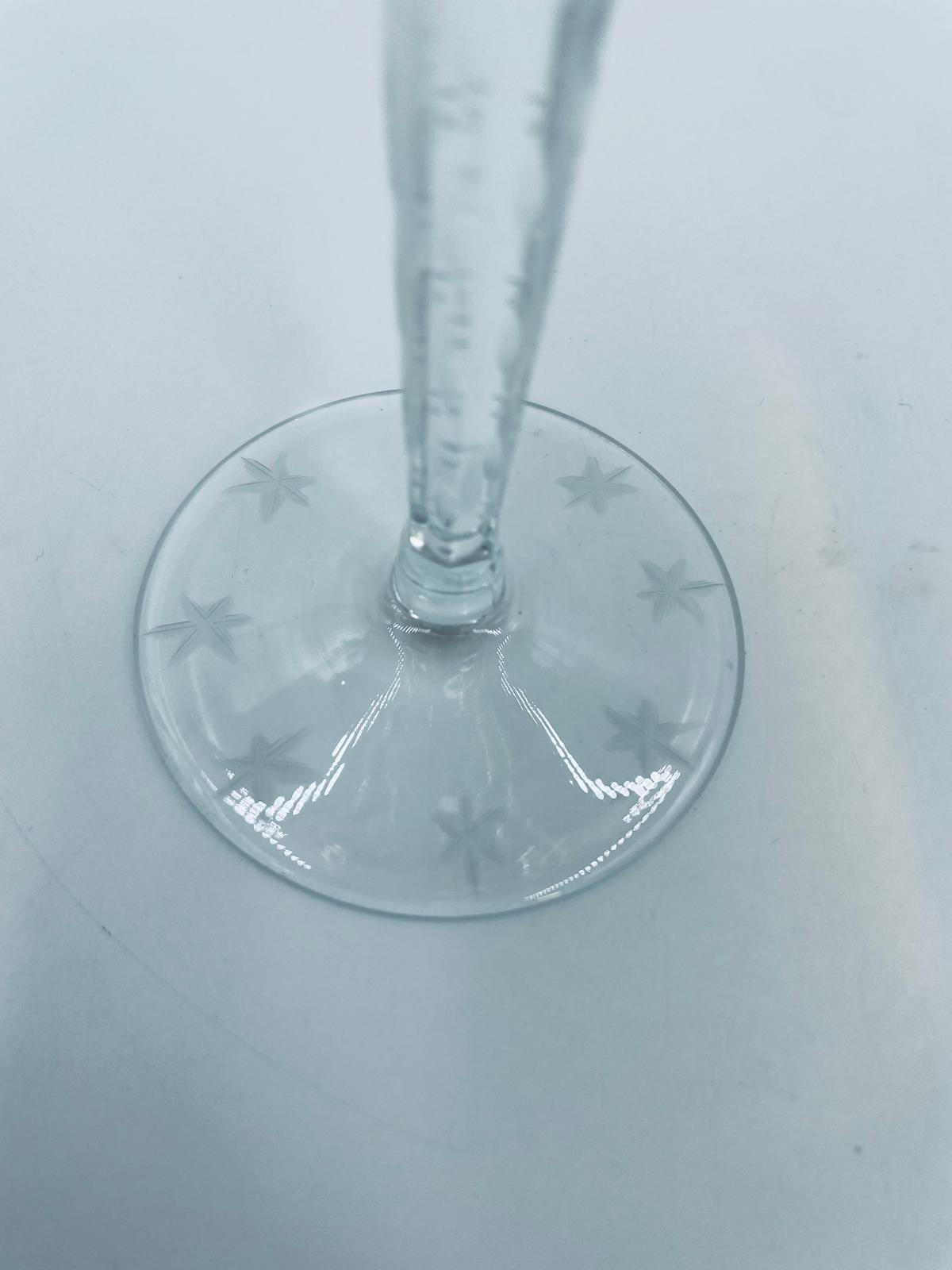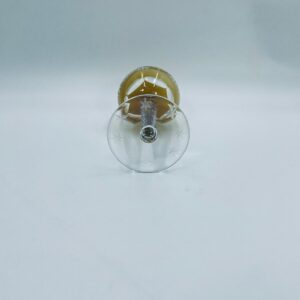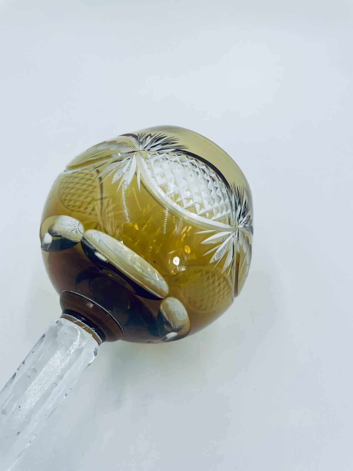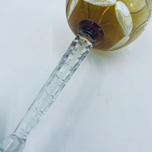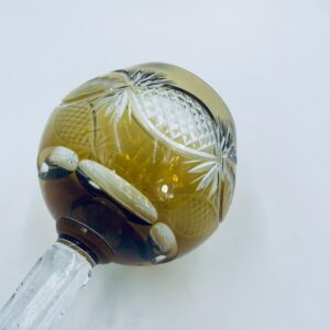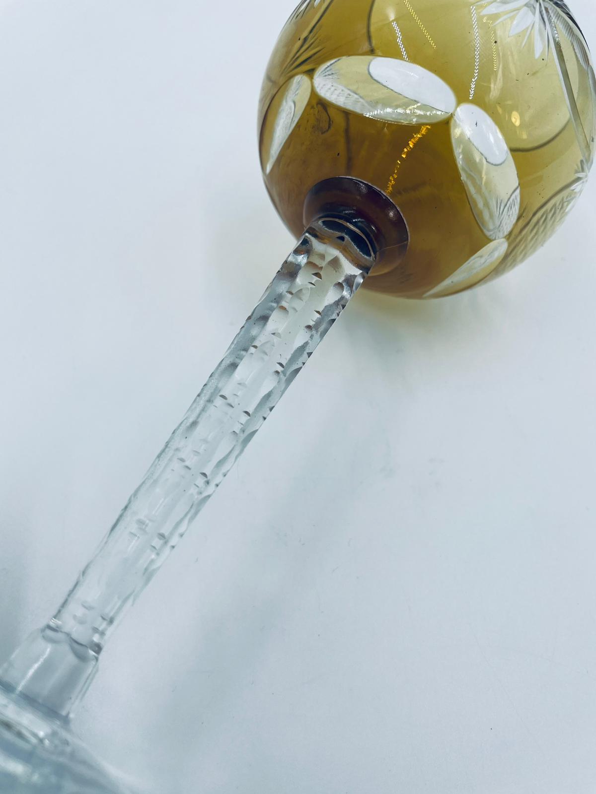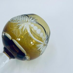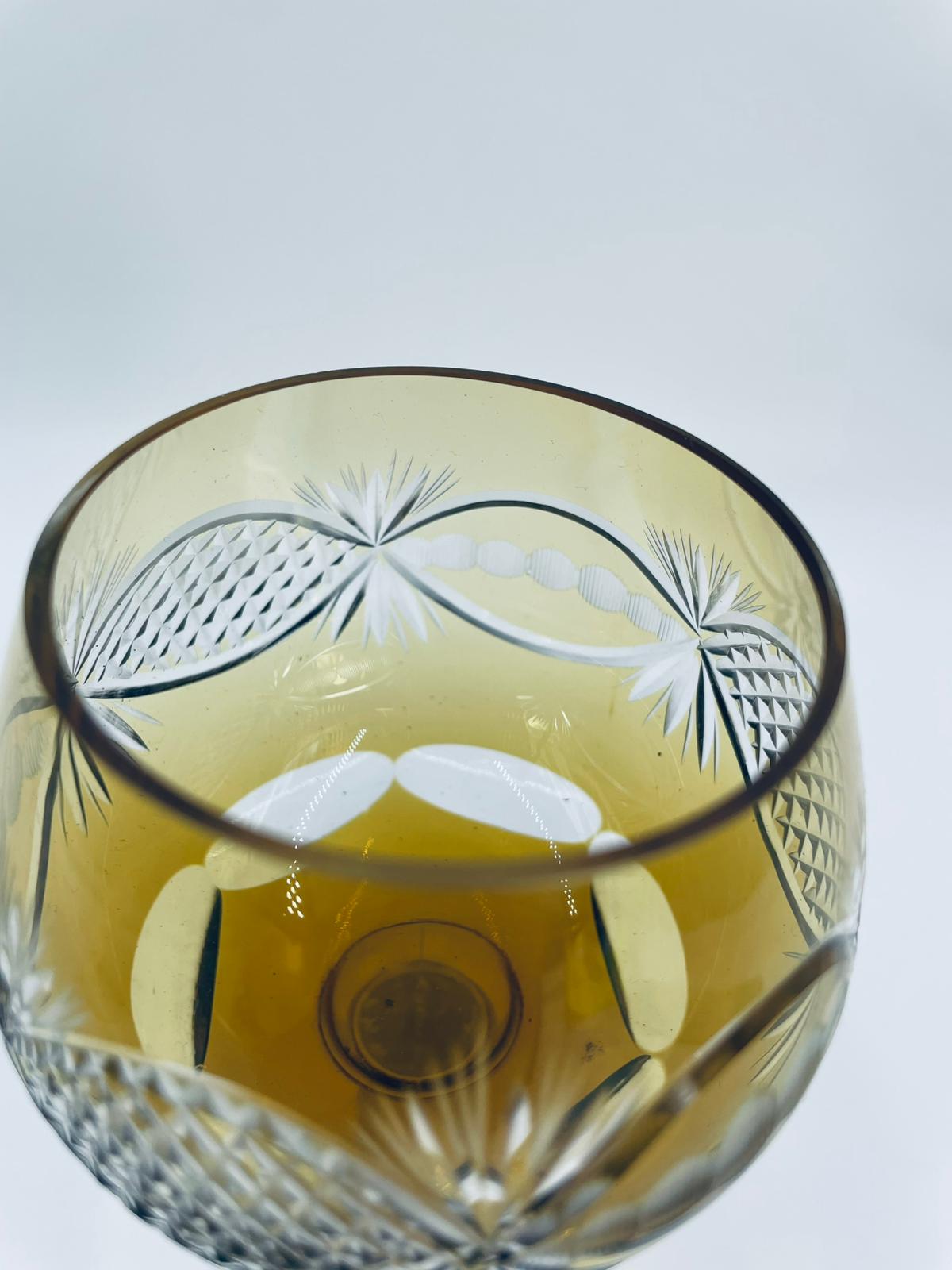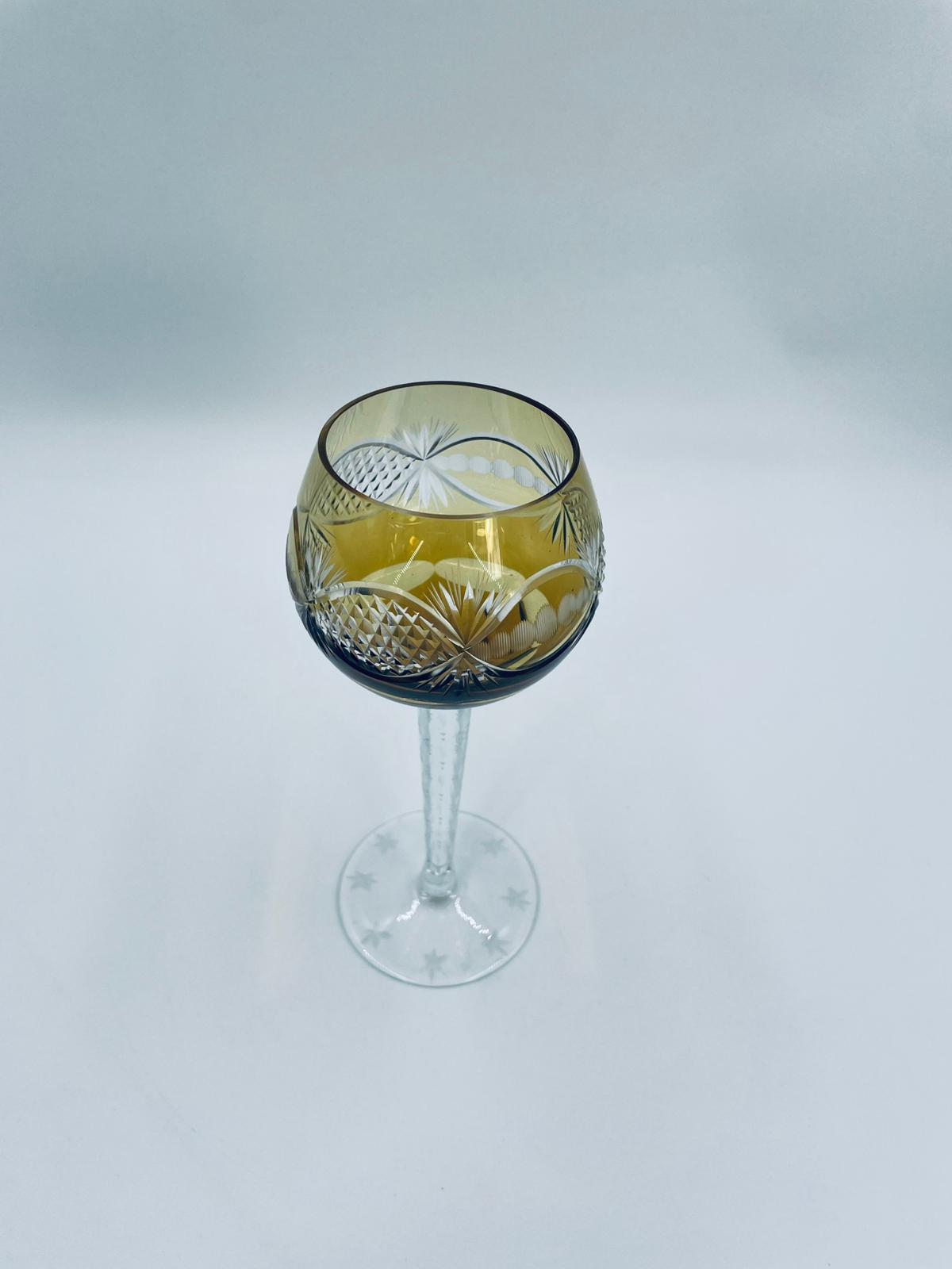 Kieliszek do wina typu Römer w stylu Vintage, z czasów PRL-u, wykonany z wysokiej jakości szkła kryształowego. Kieliszek posiada złoto-miodową, dwuwarstwową czarę z ręcznie szlifowanym, ozdobnym wzorem geometrycznym, smukłą i ozdobną nóżkę oraz ozdobną podstawę z precyzyjnym szlifem w kształcie gwiazdek.