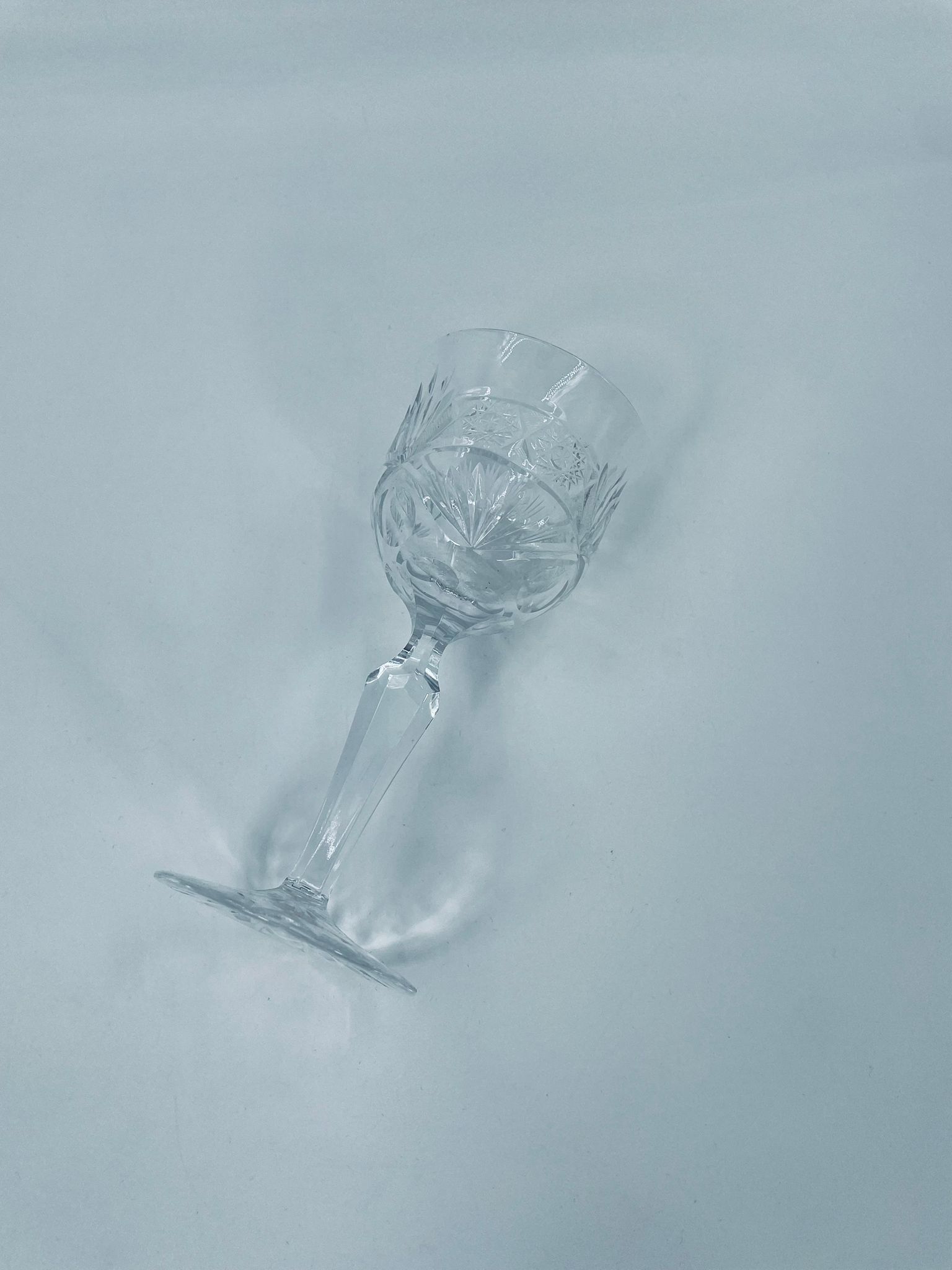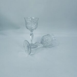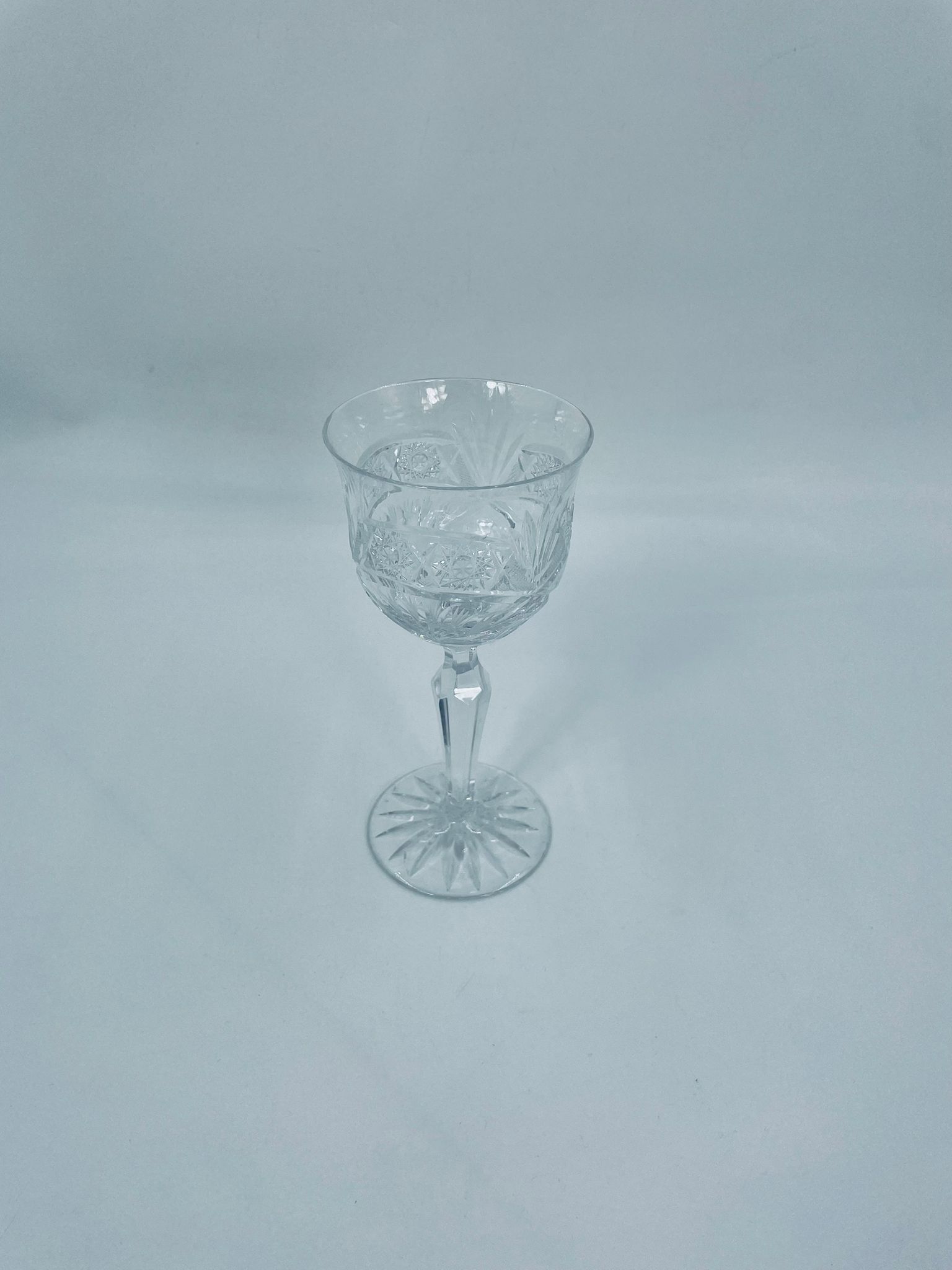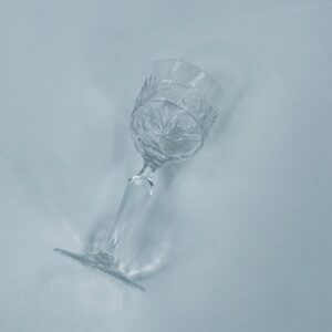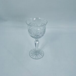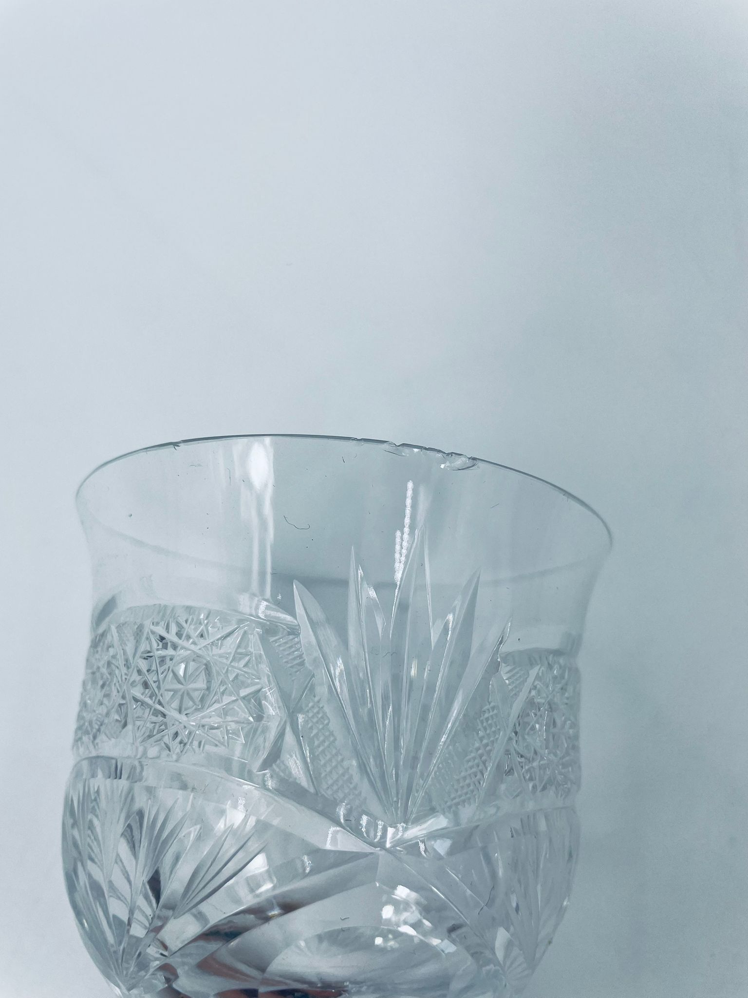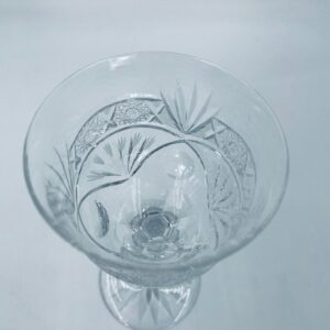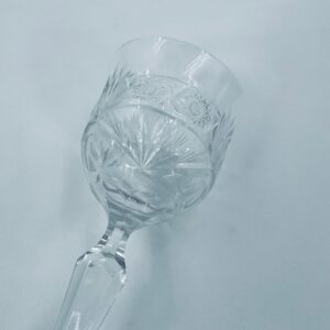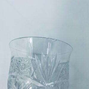 Kieliszek do wina w stylu Vintage, wykonany z wysokiej jakości szkła kryształowego. Kieliszek posiada bogate, grawerowane, geometryczne zdobienia na czarce, nóżka ozdobna fasetowana oraz ozdobna podstawa ze wzorem gwiazdy. Jeden kieliszek posiada uszczerbek na górnym rancie.