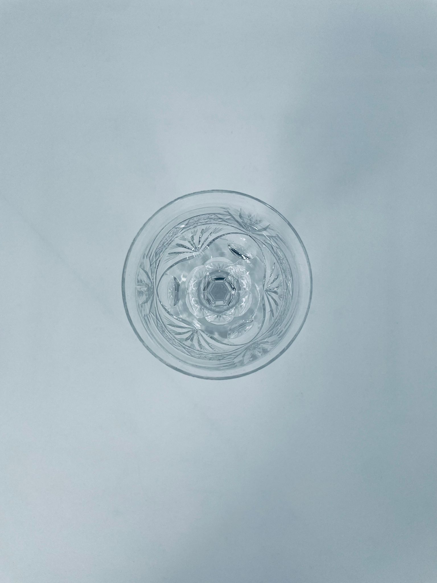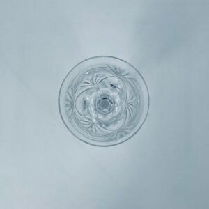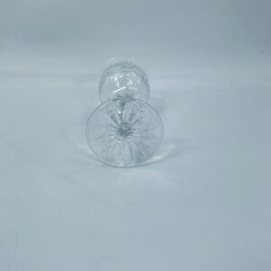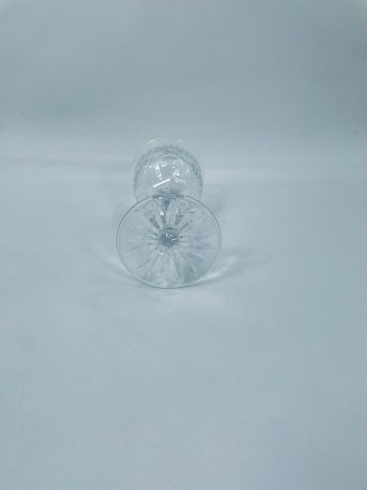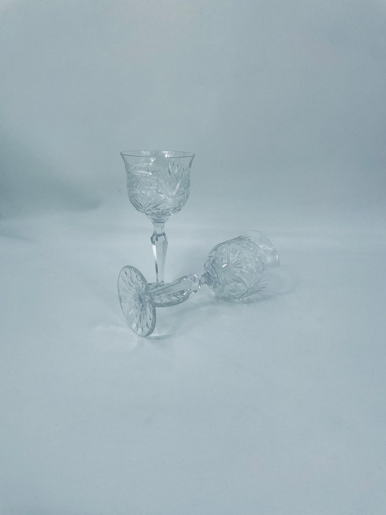 Kieliszek do wina w stylu Vintage, wykonany z wysokiej jakości szkła kryształowego. Kieliszek posiada bogate, grawerowane, geometryczne zdobienia na czarce, nóżka ozdobna fasetowana oraz ozdobna podstawa ze wzorem gwiazdy. Jeden kieliszek posiada uszczerbek na górnym rancie.