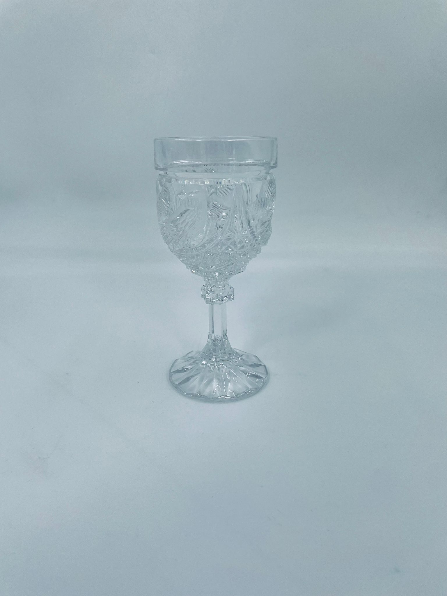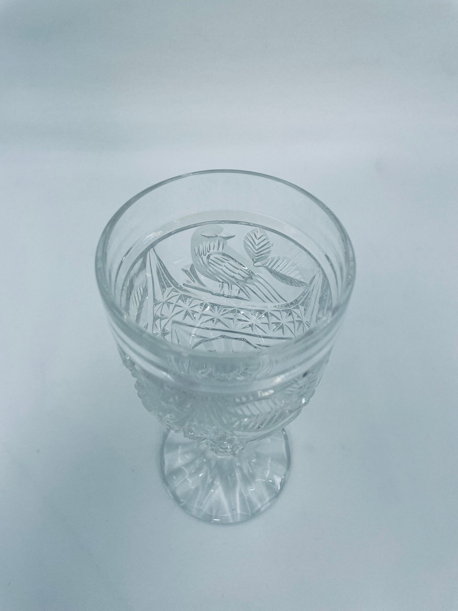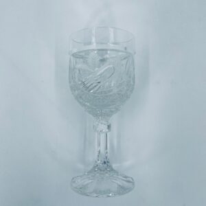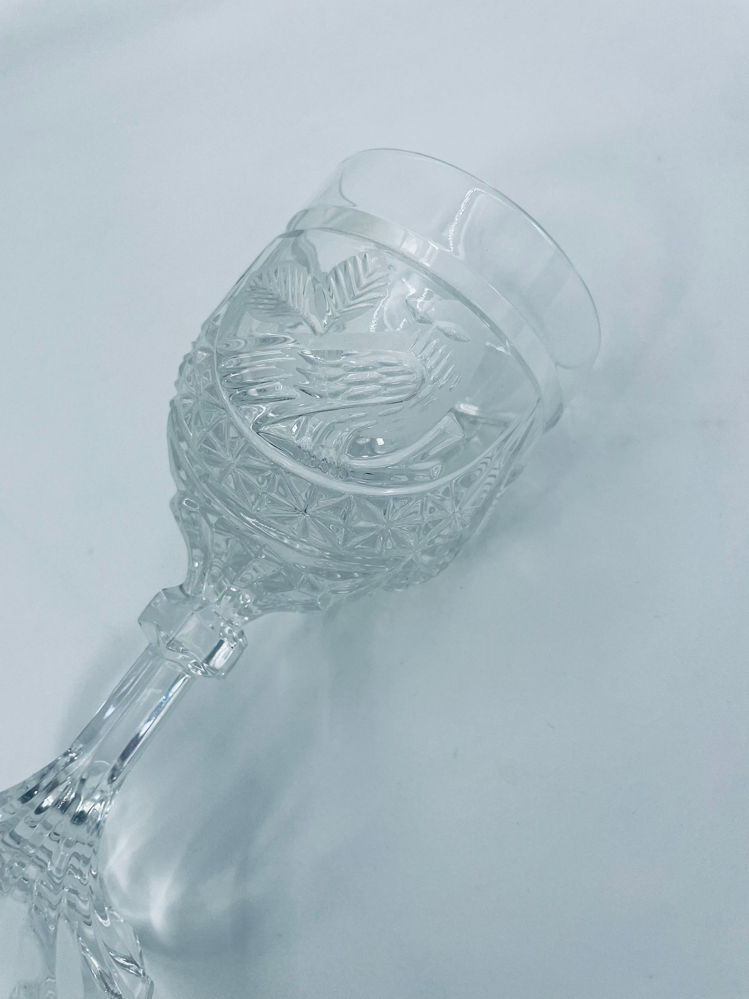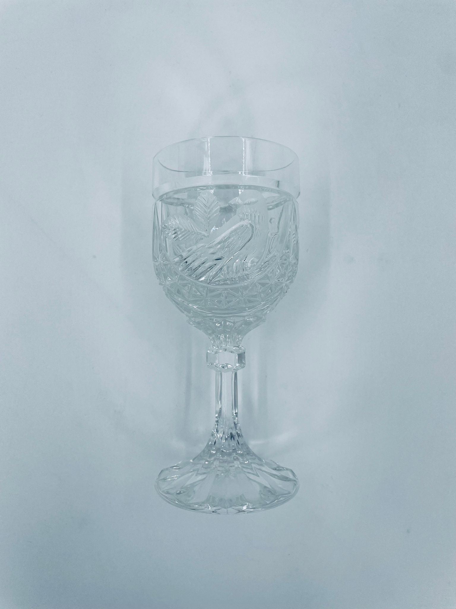 Kieliszek do wina wytwórni Hofbauer kolekcji The Byrdes, wykonany z wysokiej jakości ciężkiego, grubego szkła kryształowego. Charakteryzuje się wytłoczonym wzorem stylizowanego ptaka siedzącego na gałązce z liśćmi. Nóżka fasetowana z ozdobą w kształcie gwiazdki, podstawa wytłoczona z wzorem optycznym.