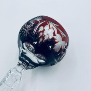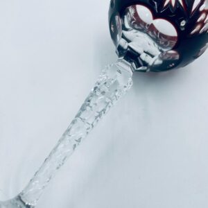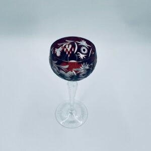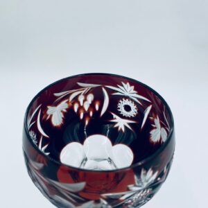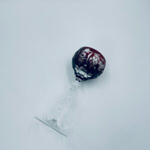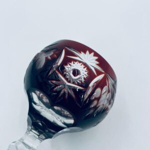 Kieliszek do wina typu Römer, wytwórni Natchmann we wzorze Traube, wykonany z wysokiej jakości szkła kryształowego. Kieliszek w kolorze rubinowym, posiada dwuwarstwową czarę z ręcznie szlifowanym , ozdobnym wzorem winogron, liści, wachlarzy i gwiazd, smukłą ozdobną nóżkę oraz podstawę z ozdobnym szlifem.