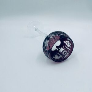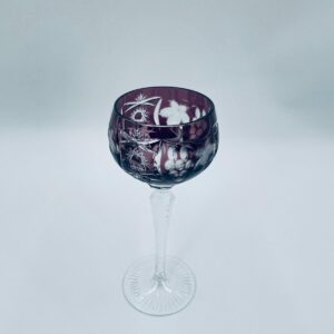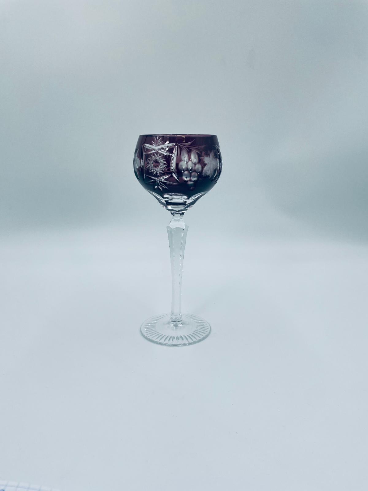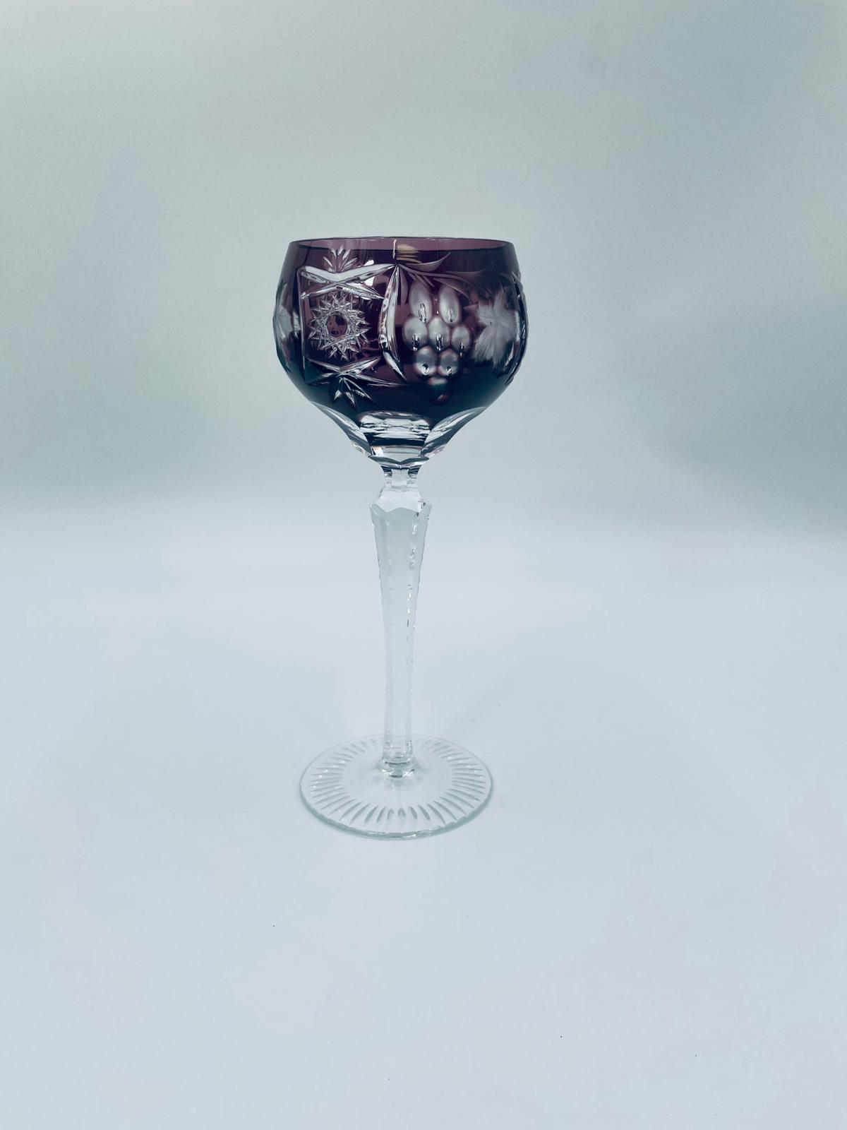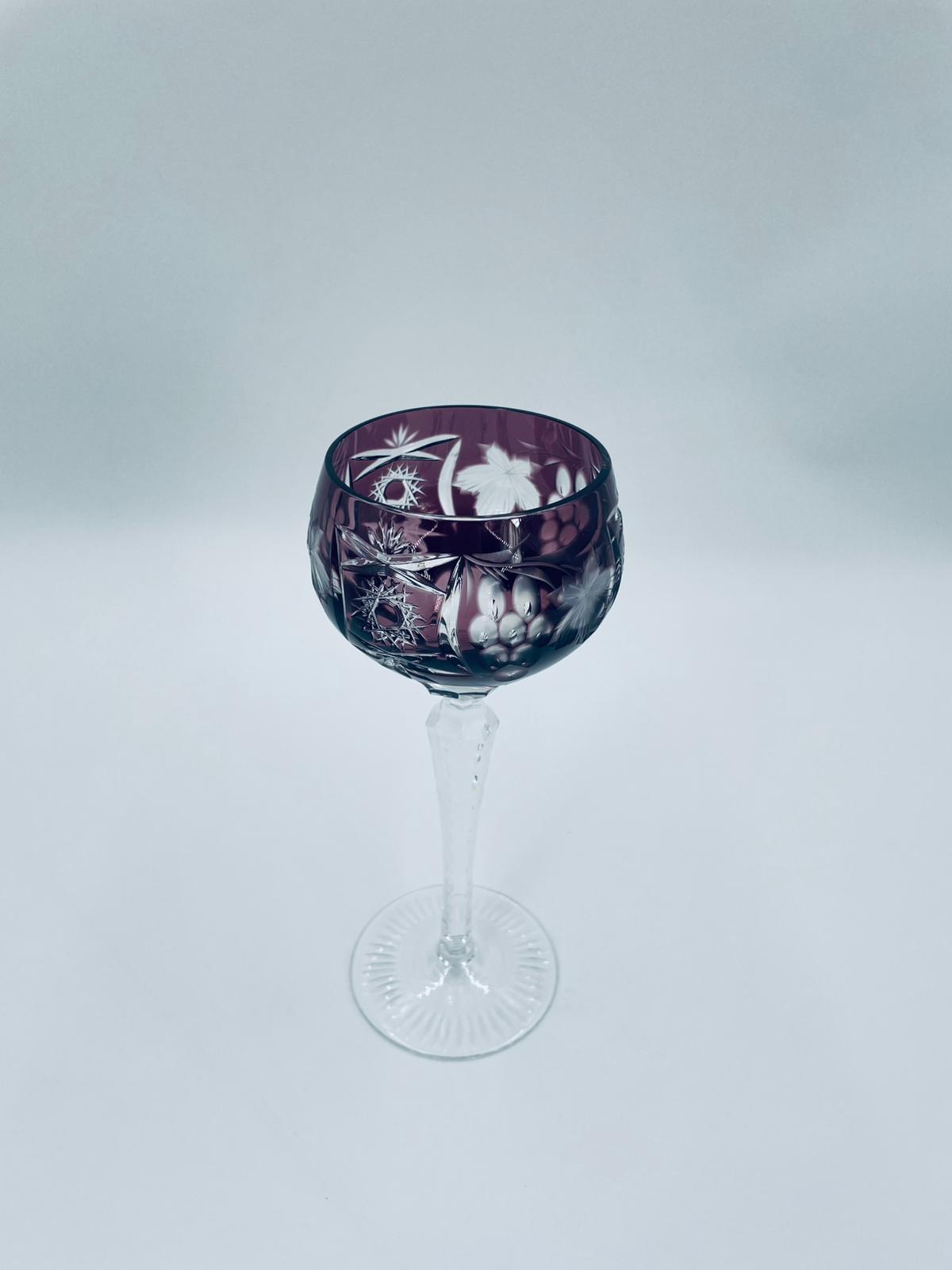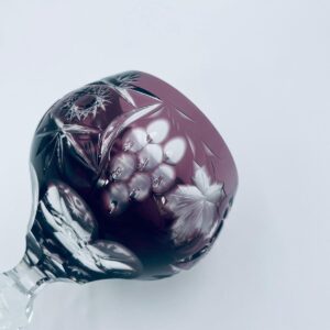 Kieliszek do wina typu Römer, wytwórni Natchmann we wzorze Traube, wykonany z wysokiej jakości szkła kryształowego. Kieliszek w kolorze ametystowym, posiada dwuwarstwową czarę z ręcznie szlifowanym , ozdobnym wzorem winogron, liści, wachlarzy i gwiazd, smukłą ozdobną nóżkę oraz podstawę z ozdobnym szlifem.