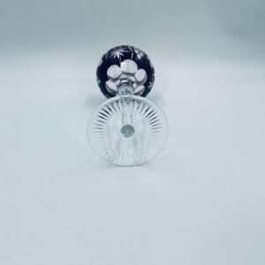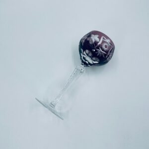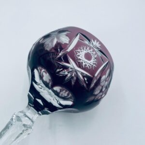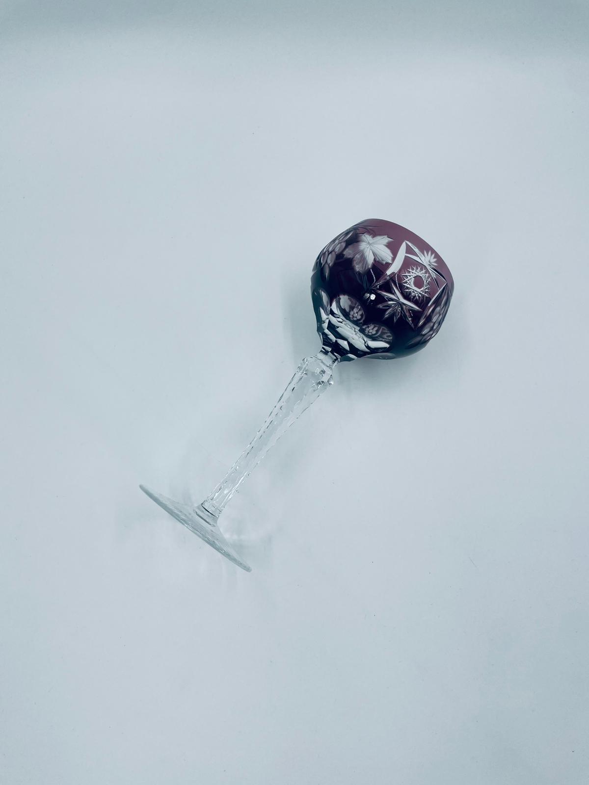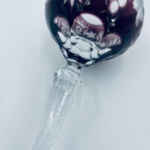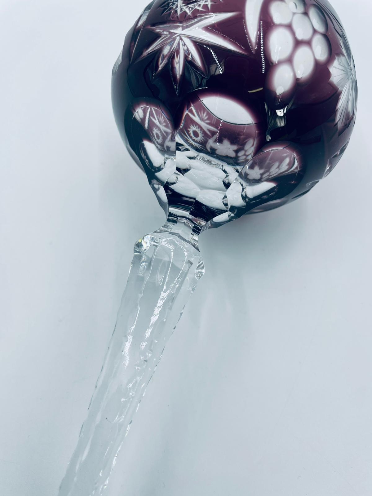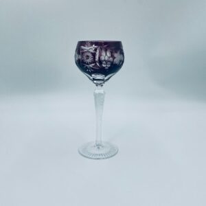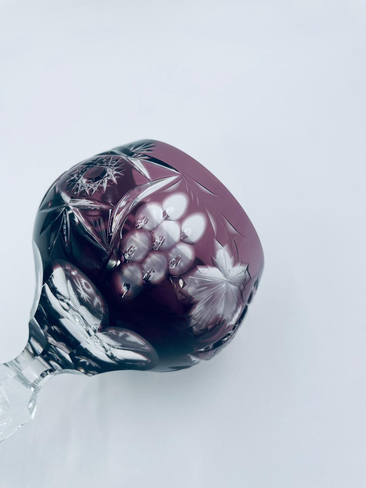 Kieliszek do wina typu Römer, wytwórni Natchmann we wzorze Traube, wykonany z wysokiej jakości szkła kryształowego. Kieliszek w kolorze ametystowym, posiada dwuwarstwową czarę z ręcznie szlifowanym , ozdobnym wzorem winogron, liści, wachlarzy i gwiazd, smukłą ozdobną nóżkę oraz podstawę z ozdobnym szlifem.