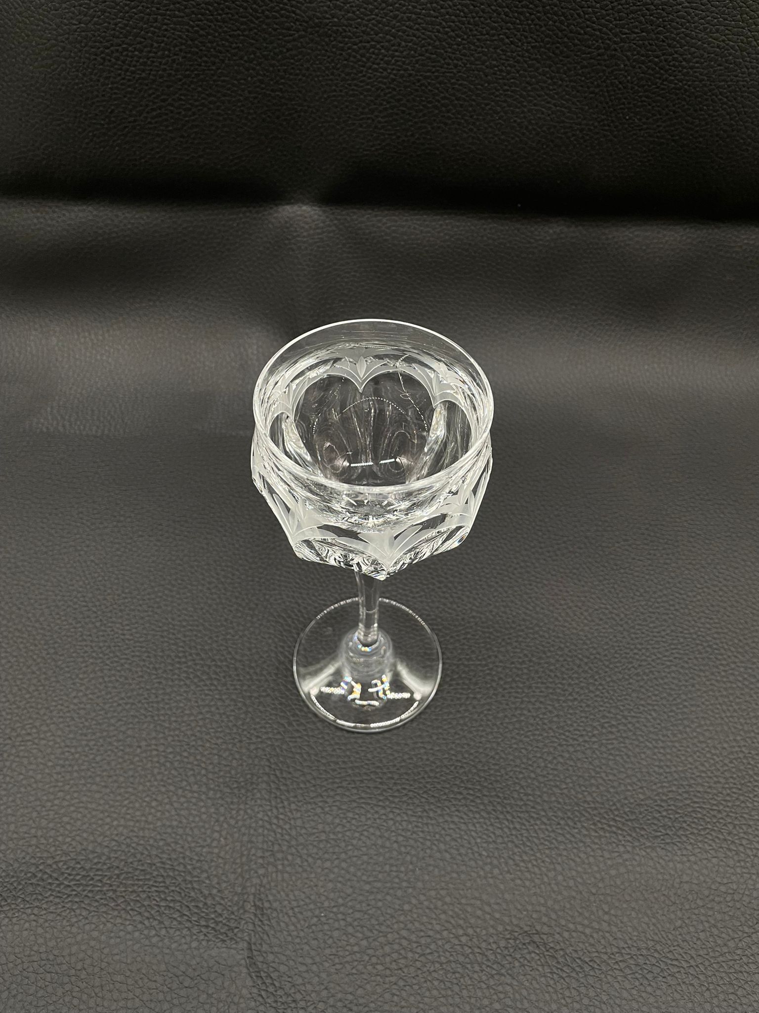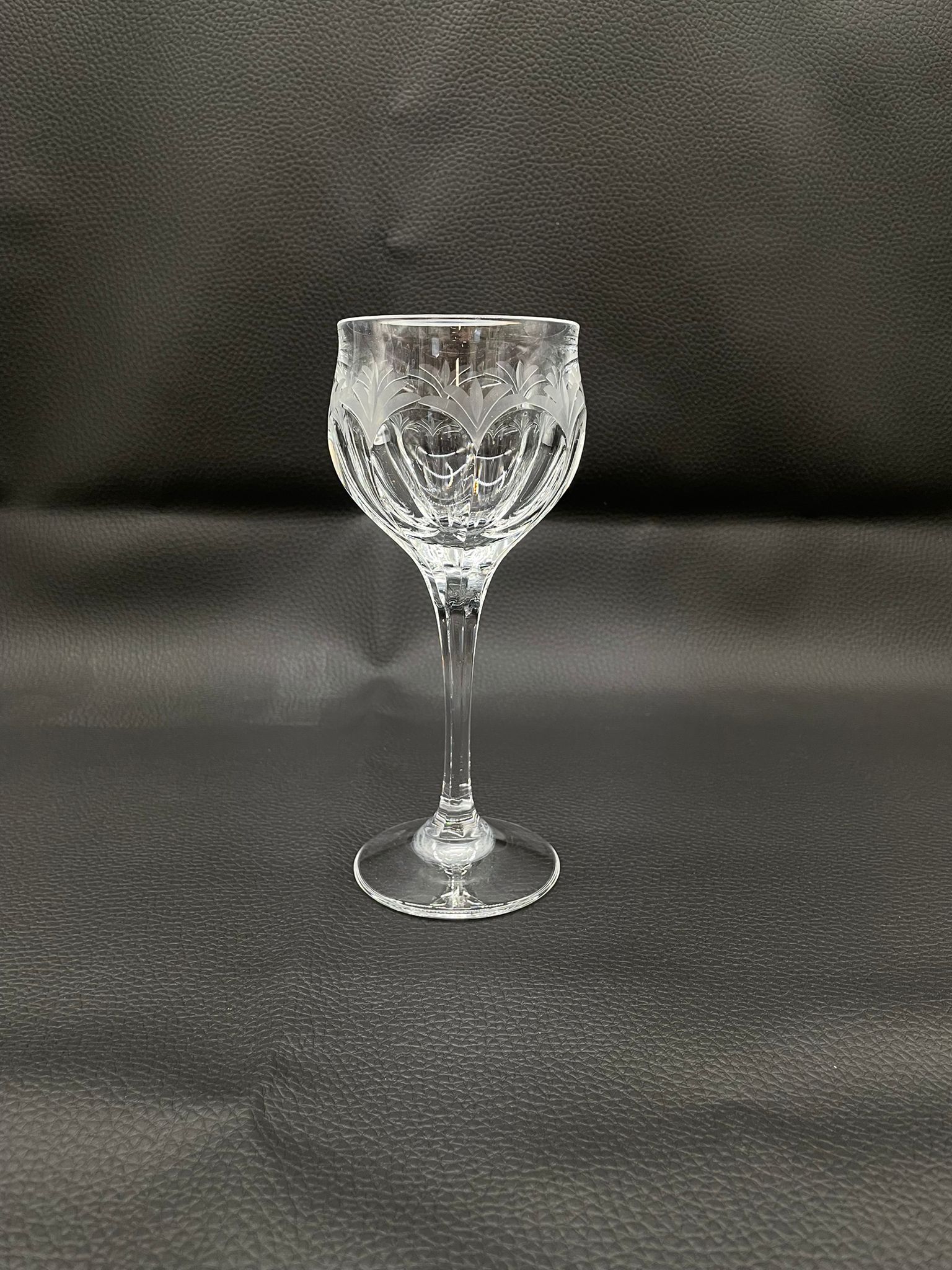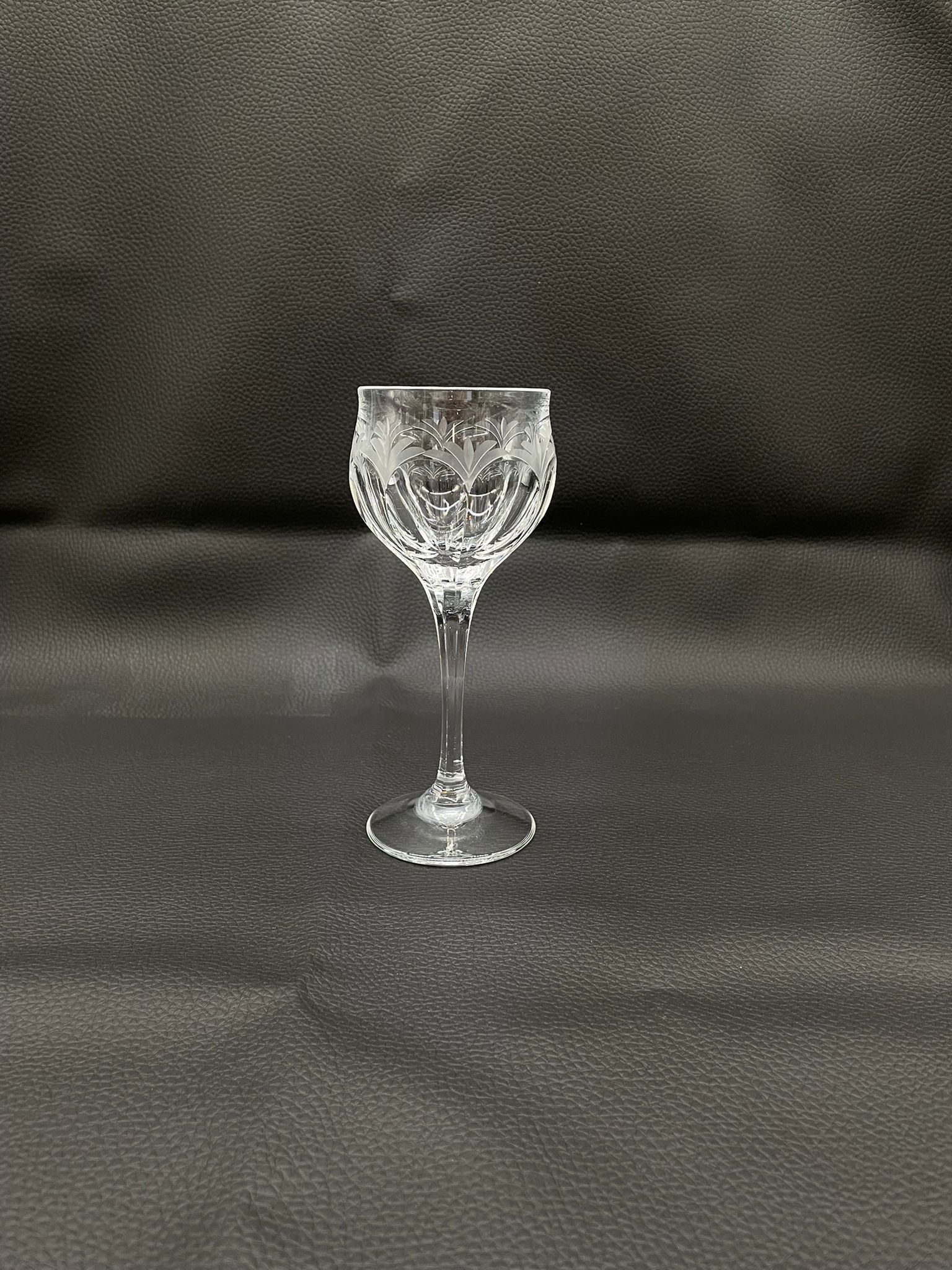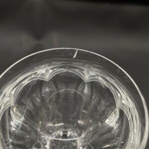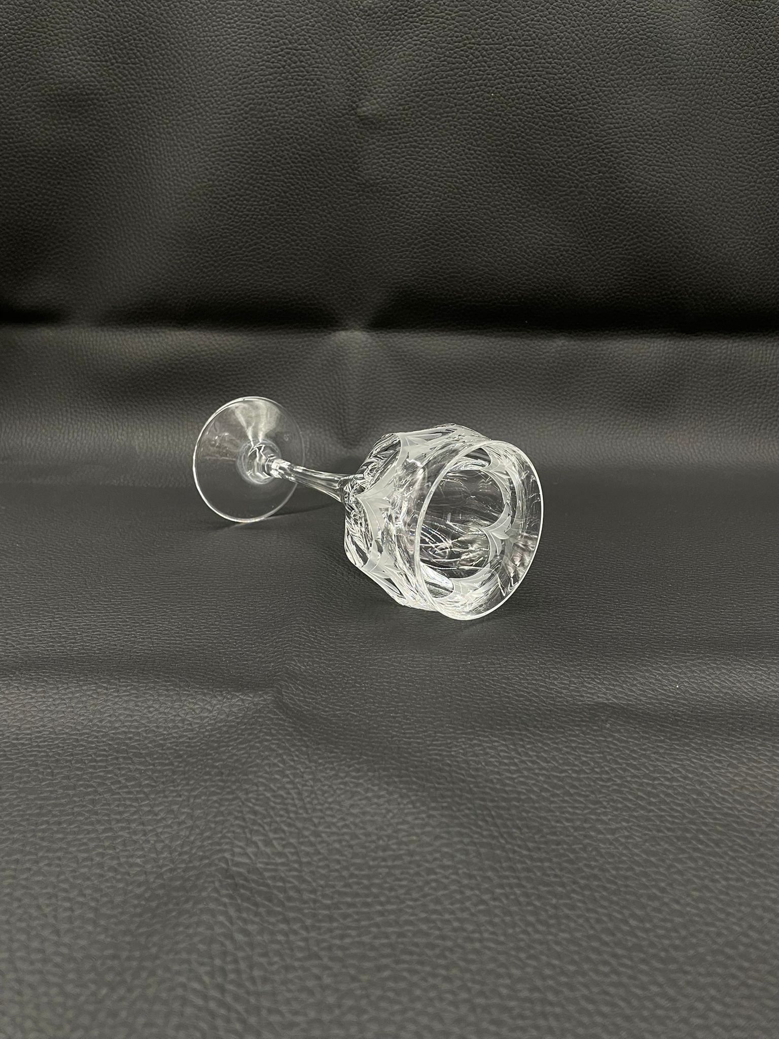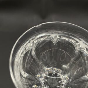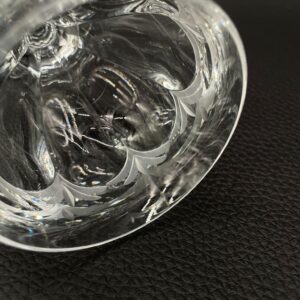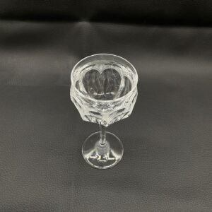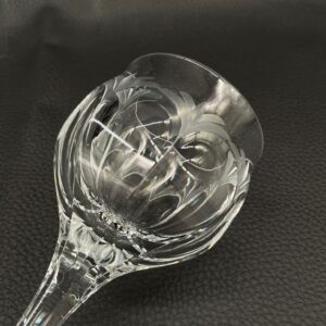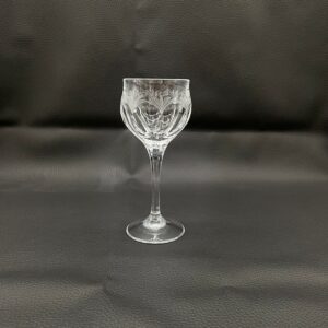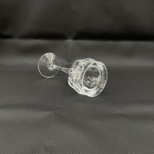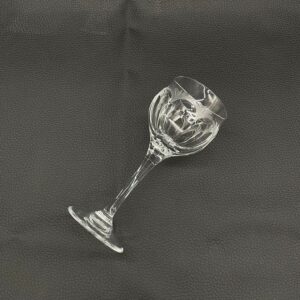 Kieliszek do wina wyprodukowany przez Niemiecka hutę szkła Peill & Putzler z serii „Diana” z lat 70tych., wykonany z wysokiej jakości szkła kryształowego ołowiowego. Kieliszek charakteryzuje się przezroczystą czarą z pięknym, ręcznie szlifowanym, geometrycznym wzorem przypominającym liście, smukłą nóżką i stabilną podstawą. Trzy kieliszki posiadają mały uszczerbek.