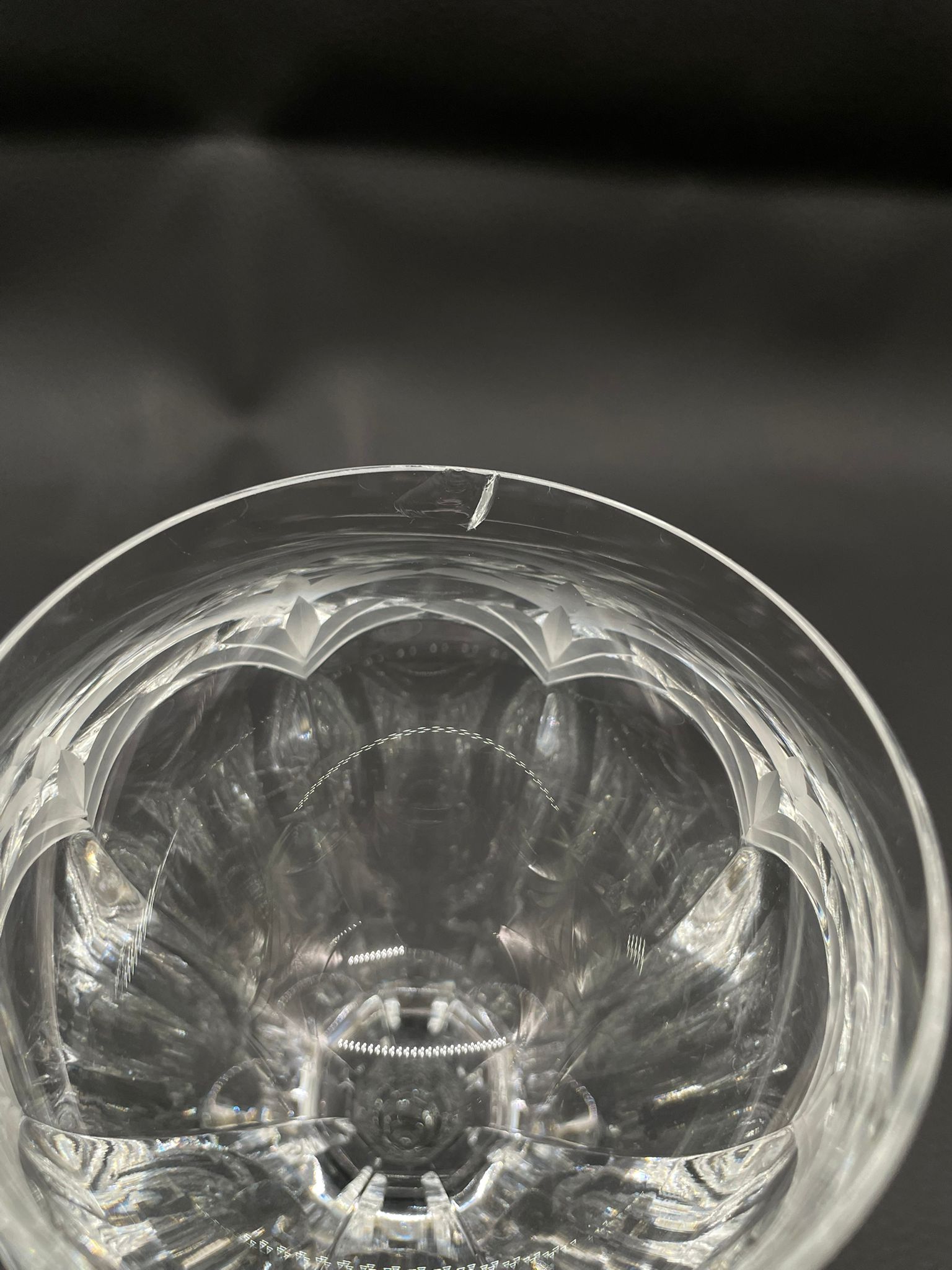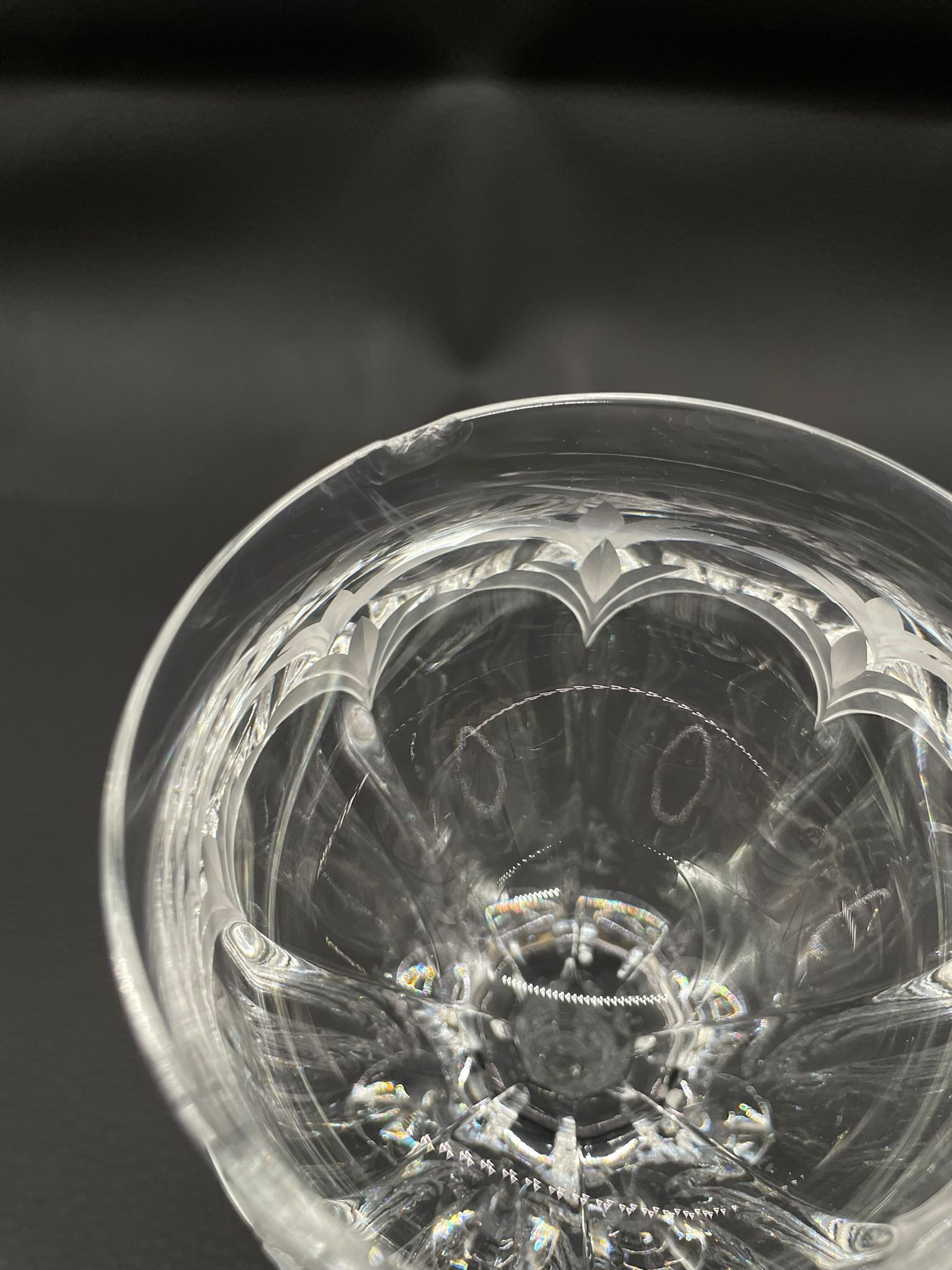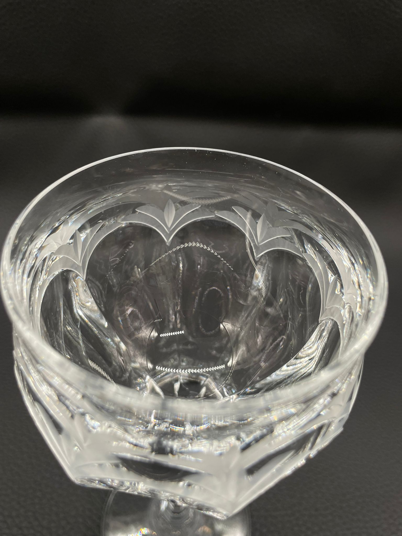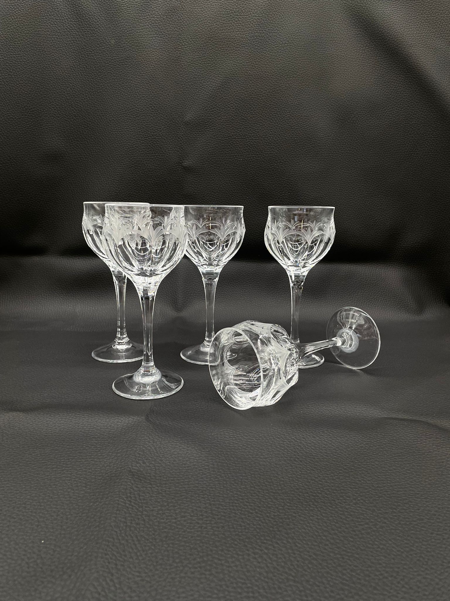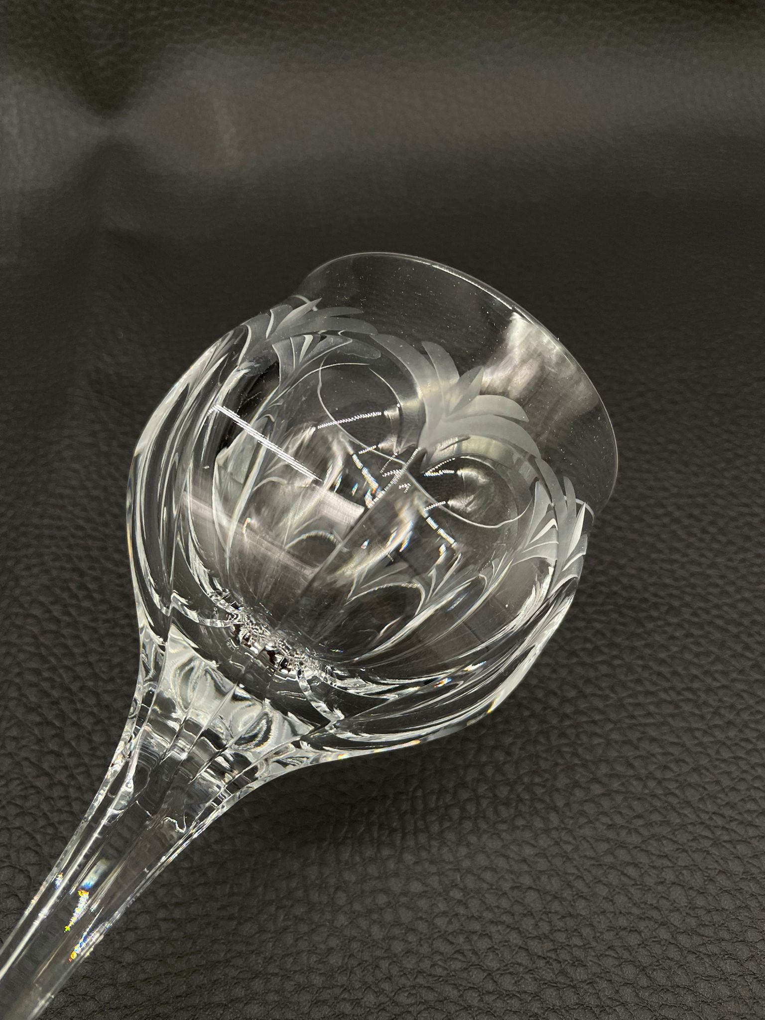 Kieliszek do wina wyprodukowany przez Niemiecka hutę szkła Peill & Putzler z serii „Diana” z lat 70tych., wykonany z wysokiej jakości szkła kryształowego ołowiowego. Kieliszek charakteryzuje się przezroczystą czarą z pięknym, ręcznie szlifowanym, geometrycznym wzorem przypominającym liście, smukłą nóżką i stabilną podstawą. Trzy kieliszki posiadają mały uszczerbek.
