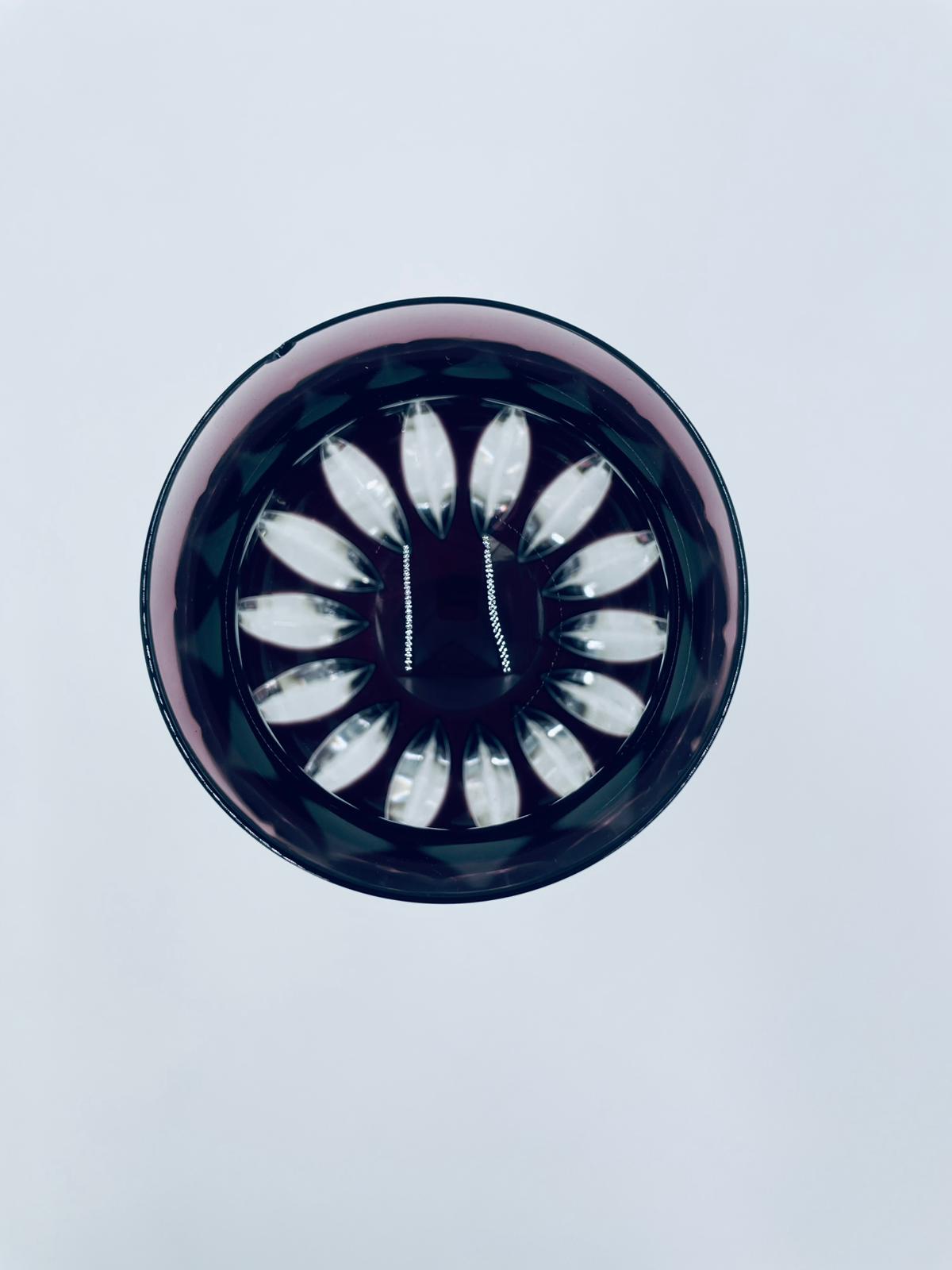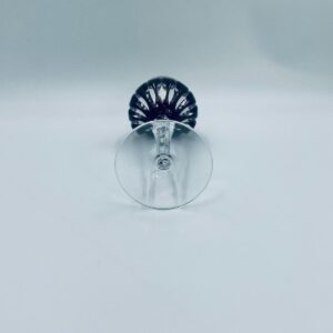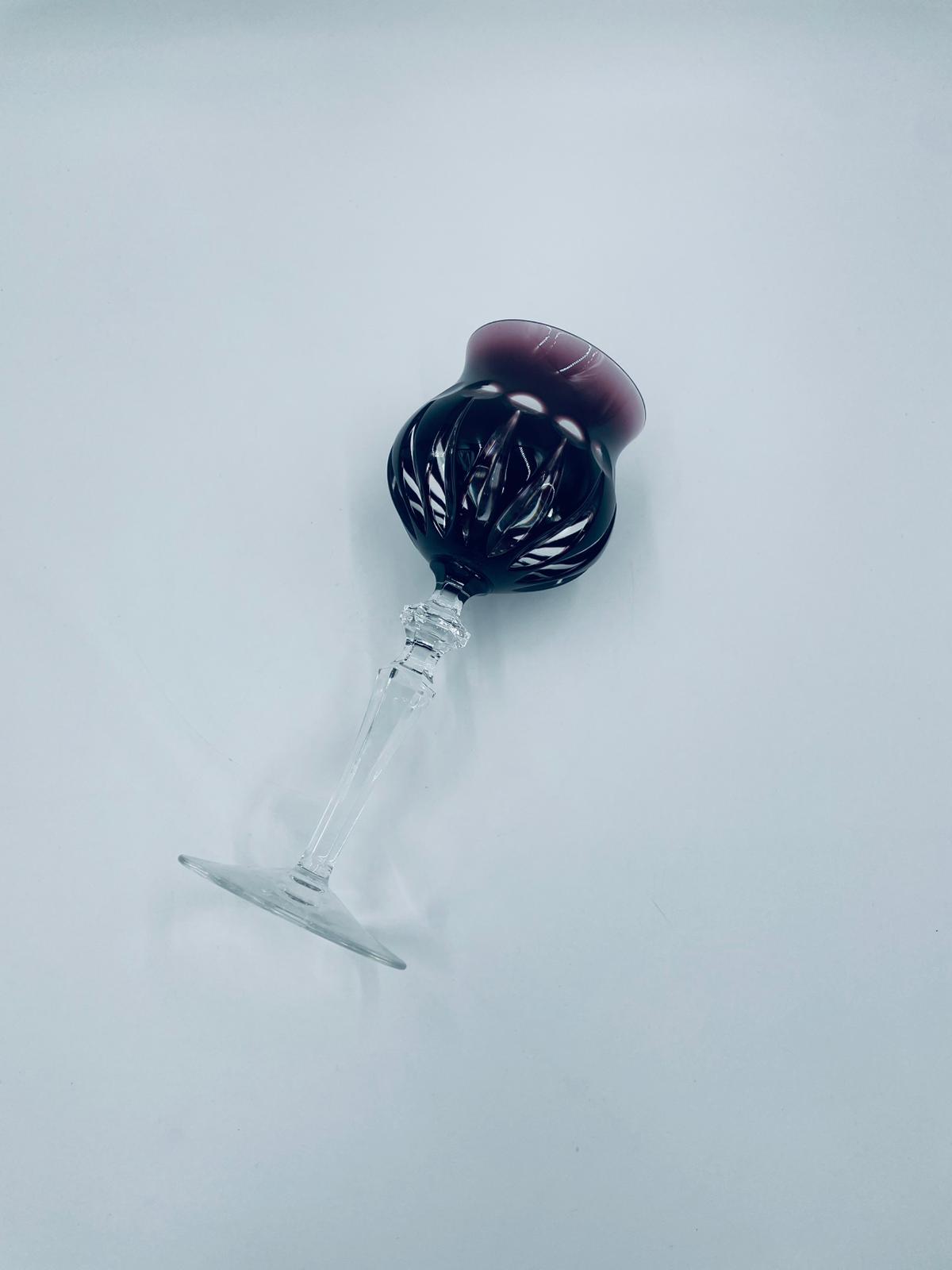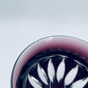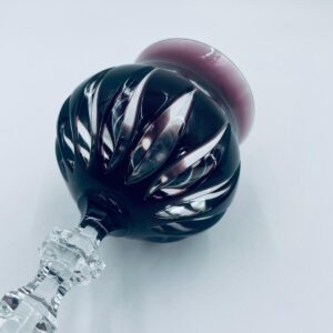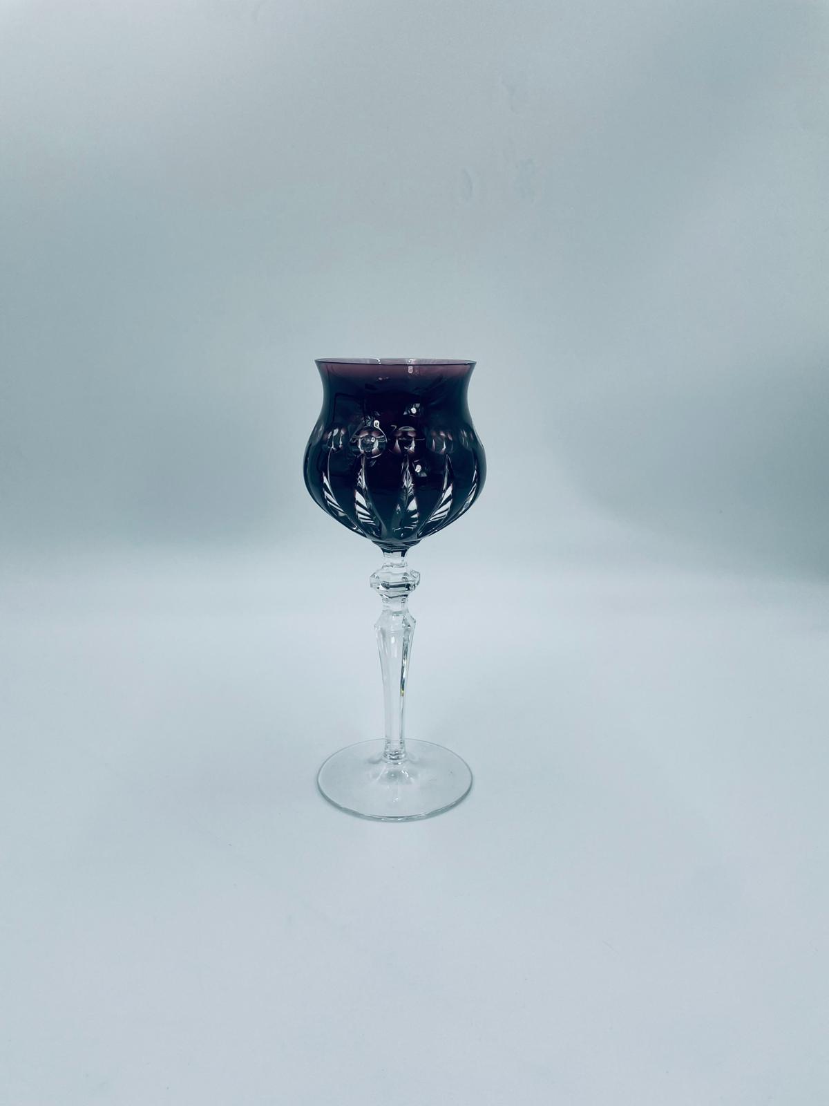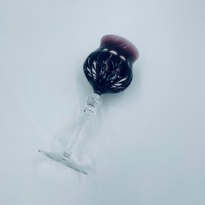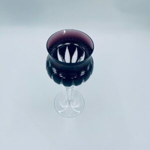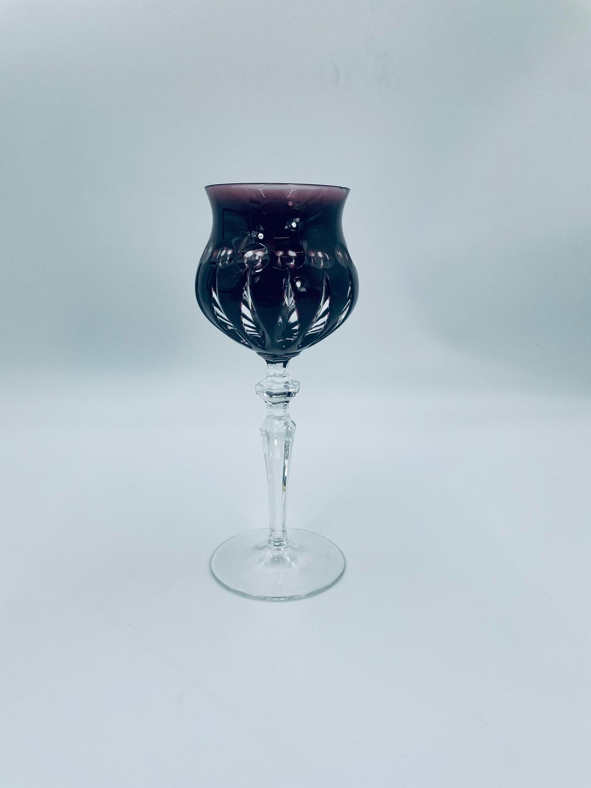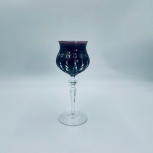 Kieliszek do wina typu Römer, wytwórni Natchmann, wykonany z wysokiej jakości szkła kryształowego ołowiowego. Kieliszek we wzorze Marilyn z lat 80tych XX wieku. Charakteryzuje się barwiona w masie na kolor fioletowy czaszą z głębokimi szlifami, ozdobna fasetowana nóżka oraz stabilną podstawą. Posiada mały uszczerbek na górnym rancie.