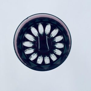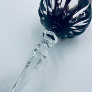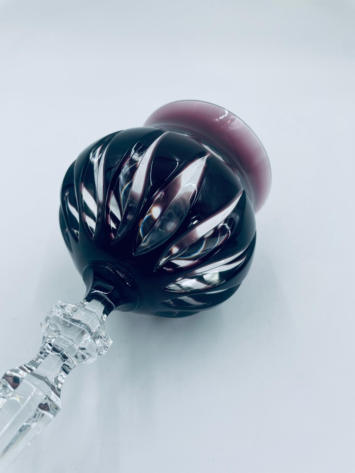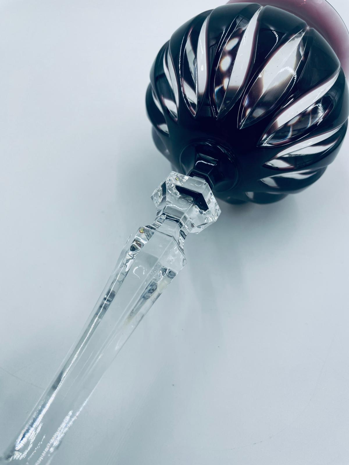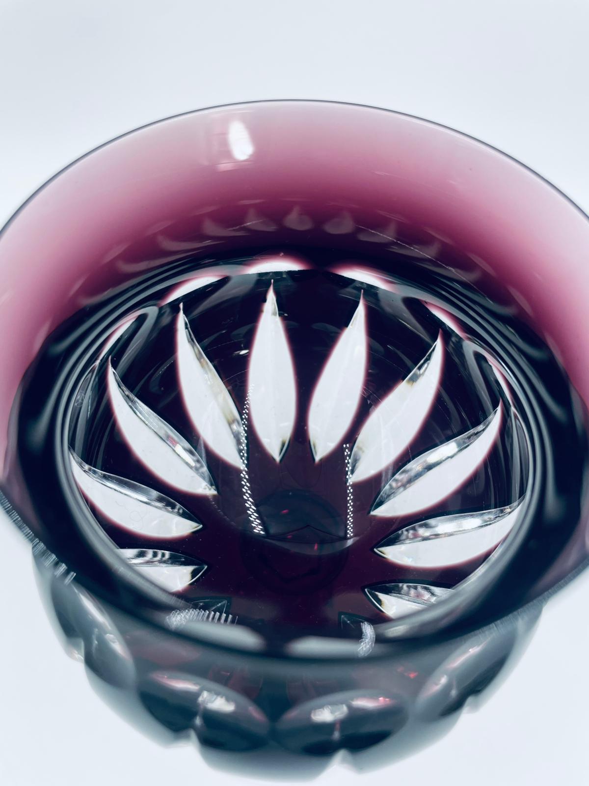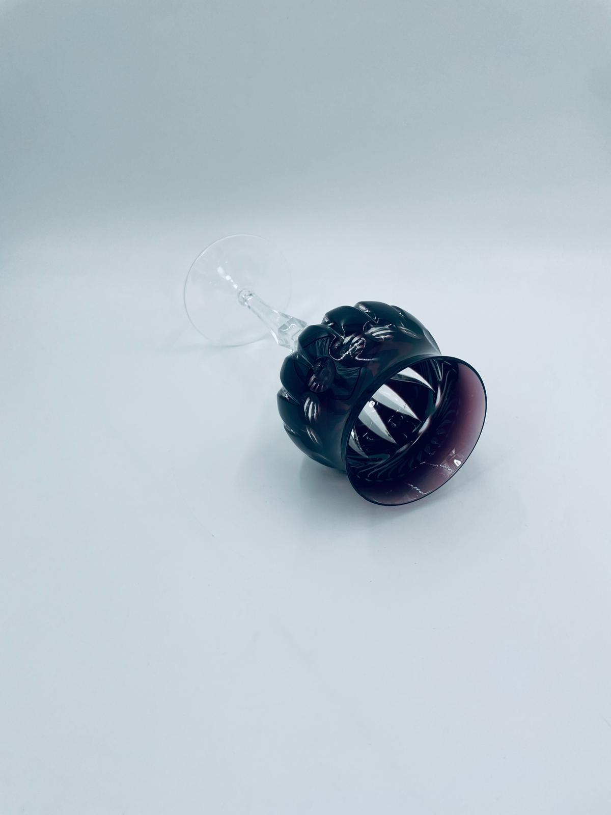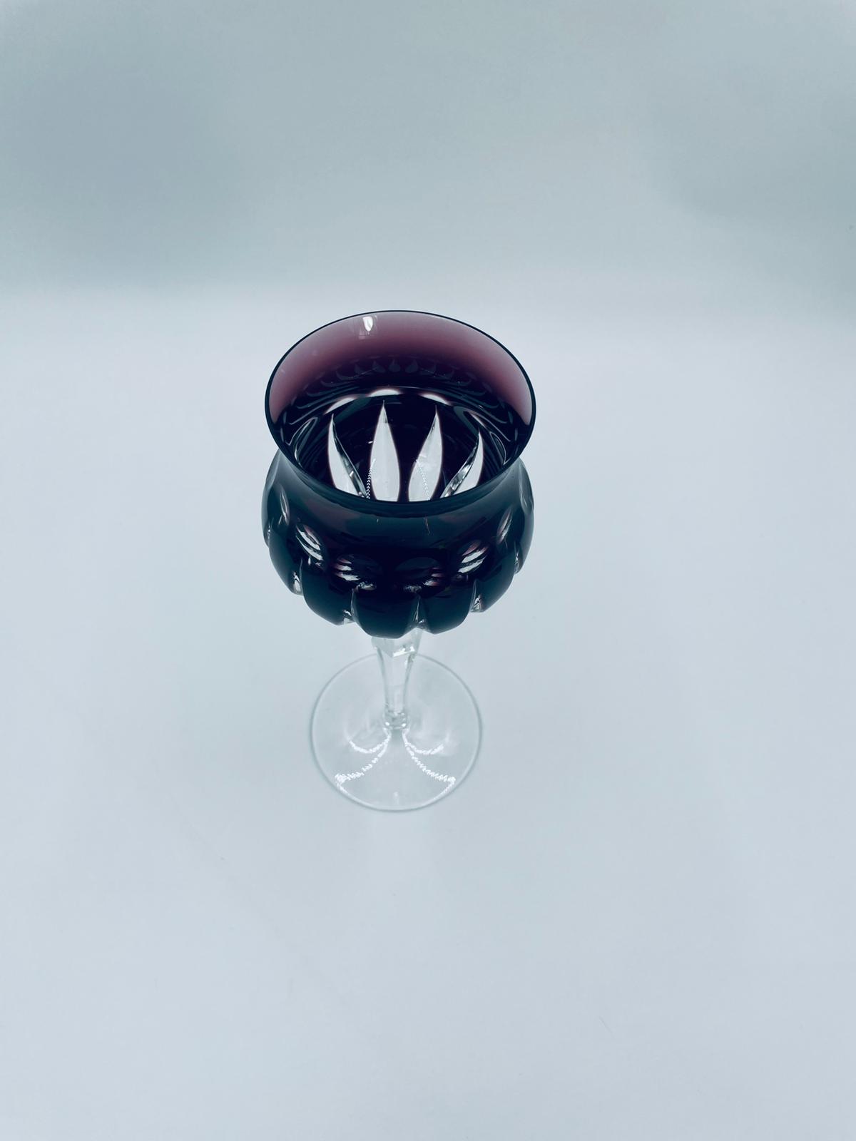 Kieliszek do wina typu Römer, wytwórni Natchmann, wykonany z wysokiej jakości szkła kryształowego ołowiowego. Kieliszek we wzorze Marilyn z lat 80tych XX wieku. Charakteryzuje się barwiona w masie na kolor fioletowy czaszą z głębokimi szlifami, ozdobna fasetowana nóżka oraz stabilną podstawą. Posiada mały uszczerbek na górnym rancie.