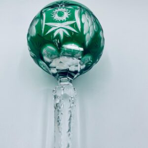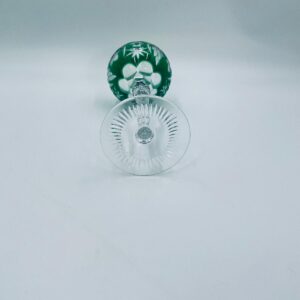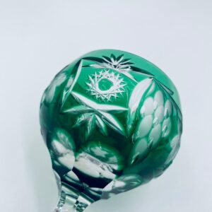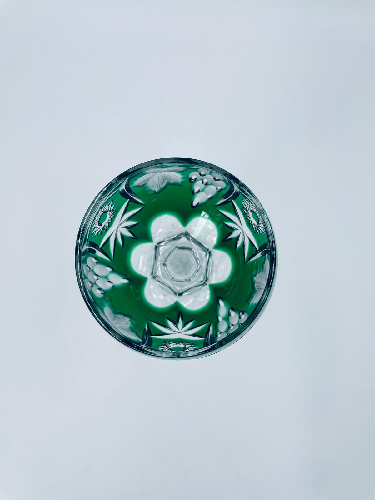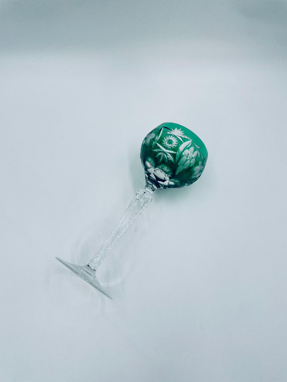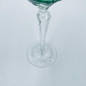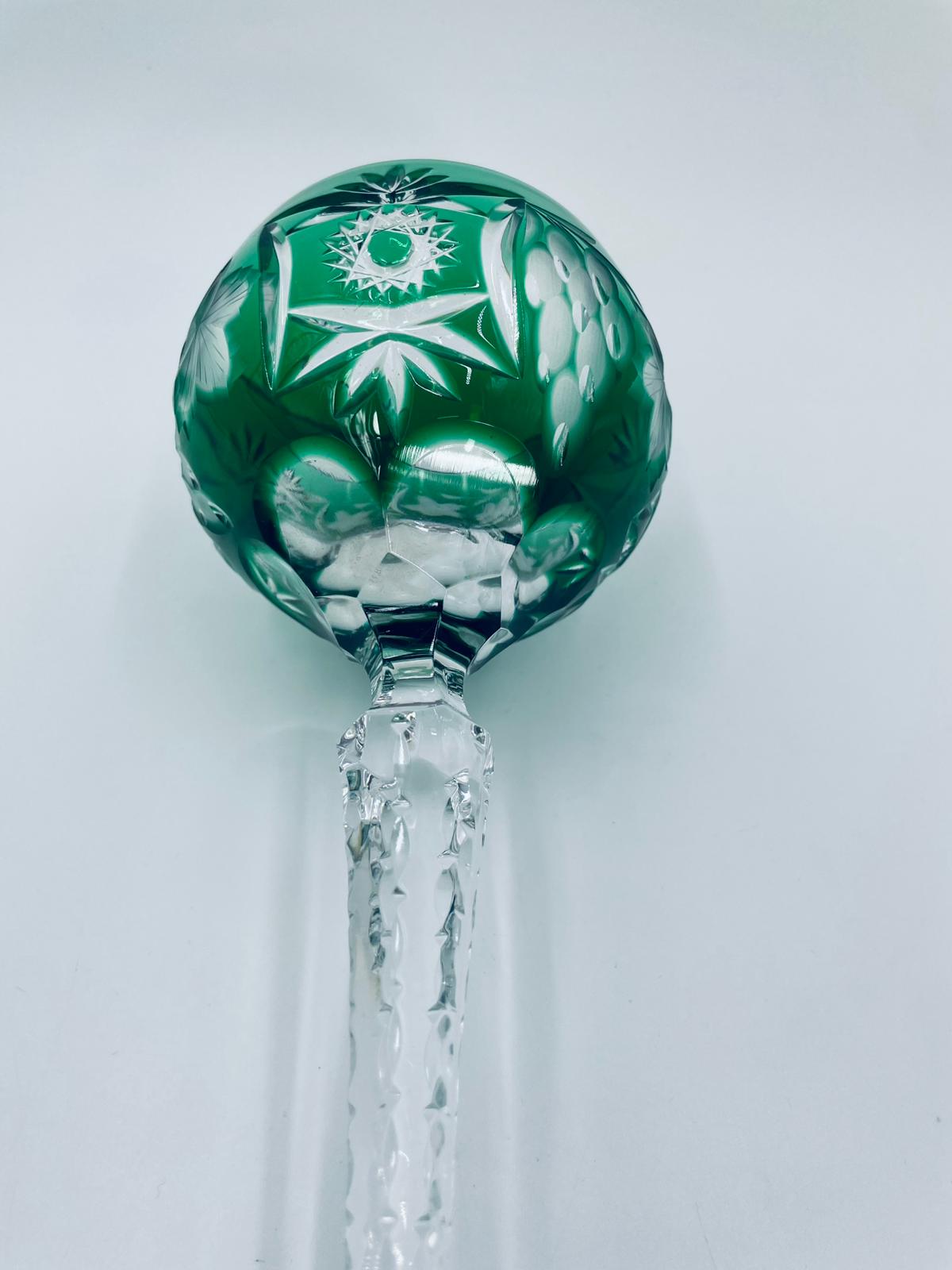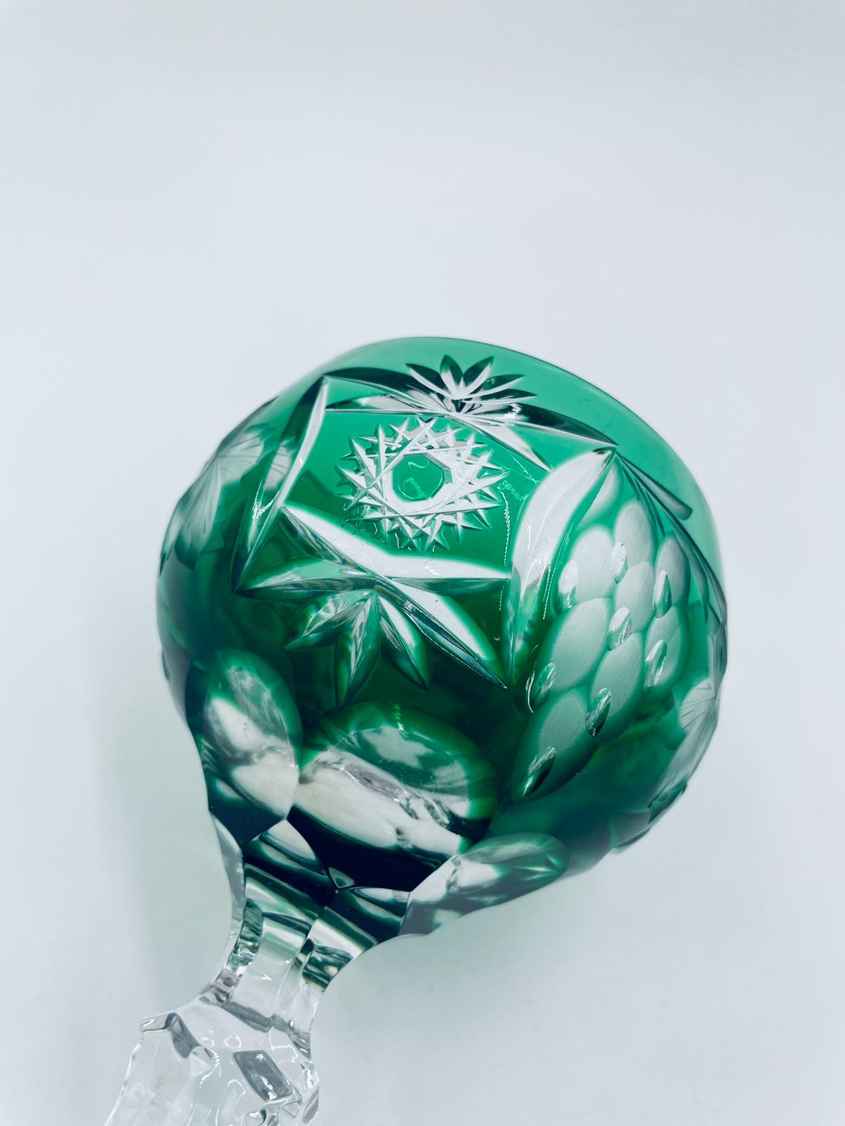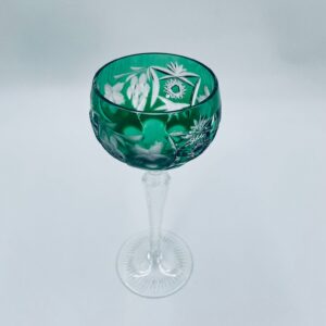 Kieliszek do wina typu Römer, wytwórni Natchmann we wzorze Traube, wykonany z wysokiej jakości szkła kryształowego. Kieliszek posiada szmaragdową, dwuwarstwową czarę z ręcznie szlifowanym , ozdobnym wzorem winogron, liści, wachlarzy i gwiazd, smukłą ozdobną nóżkę oraz podstawę z ozdobnym szlifem.
