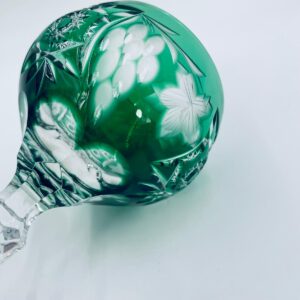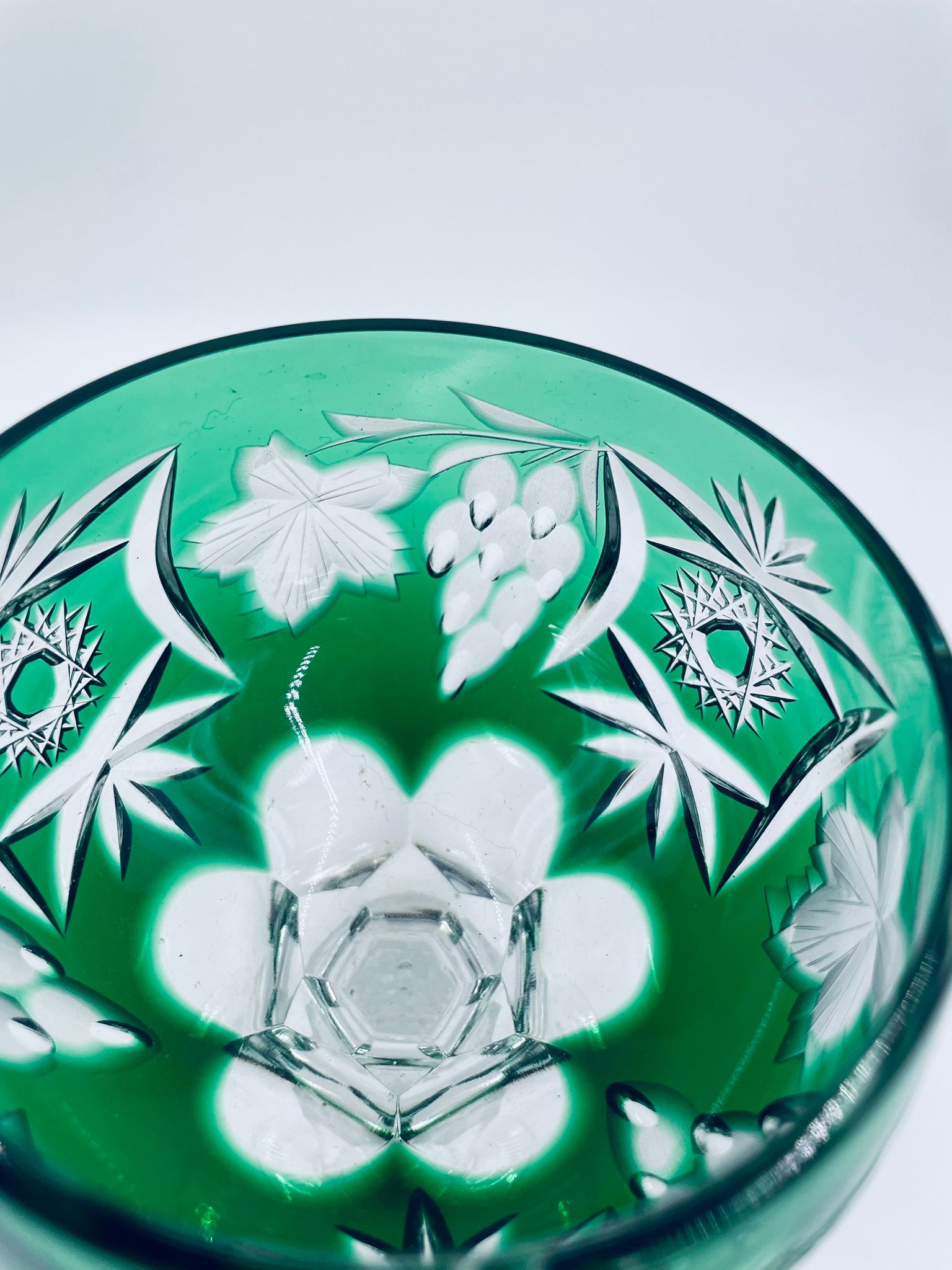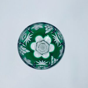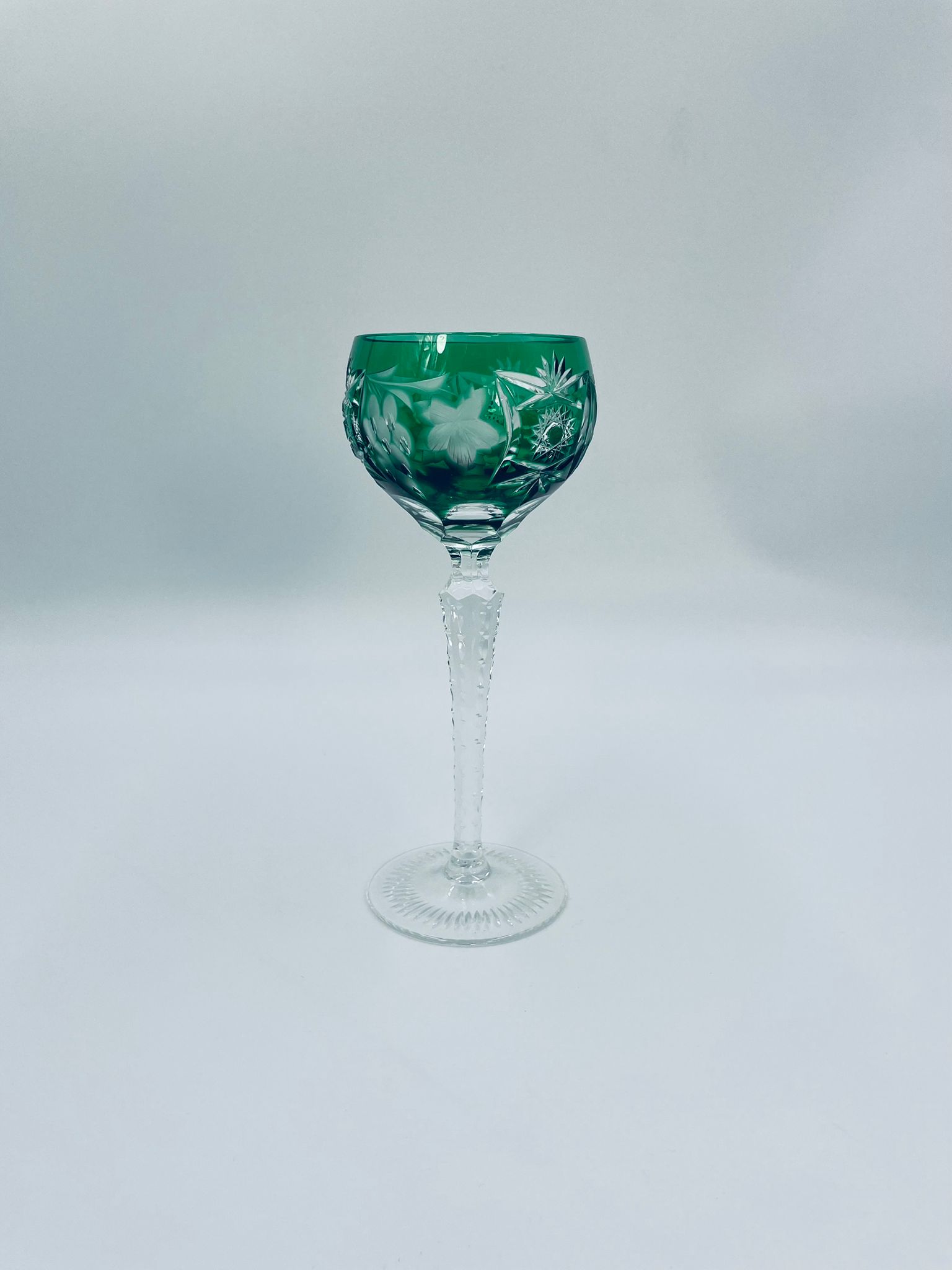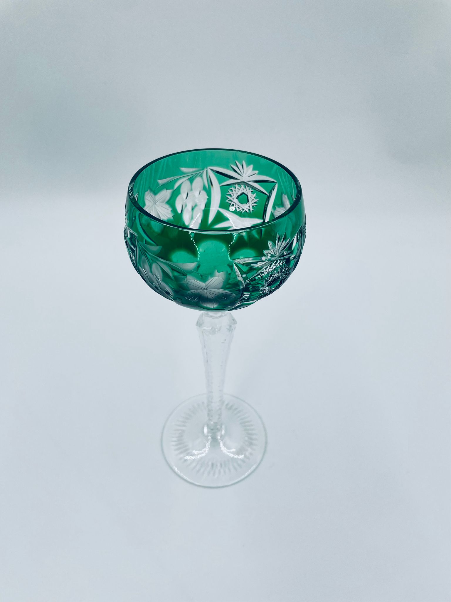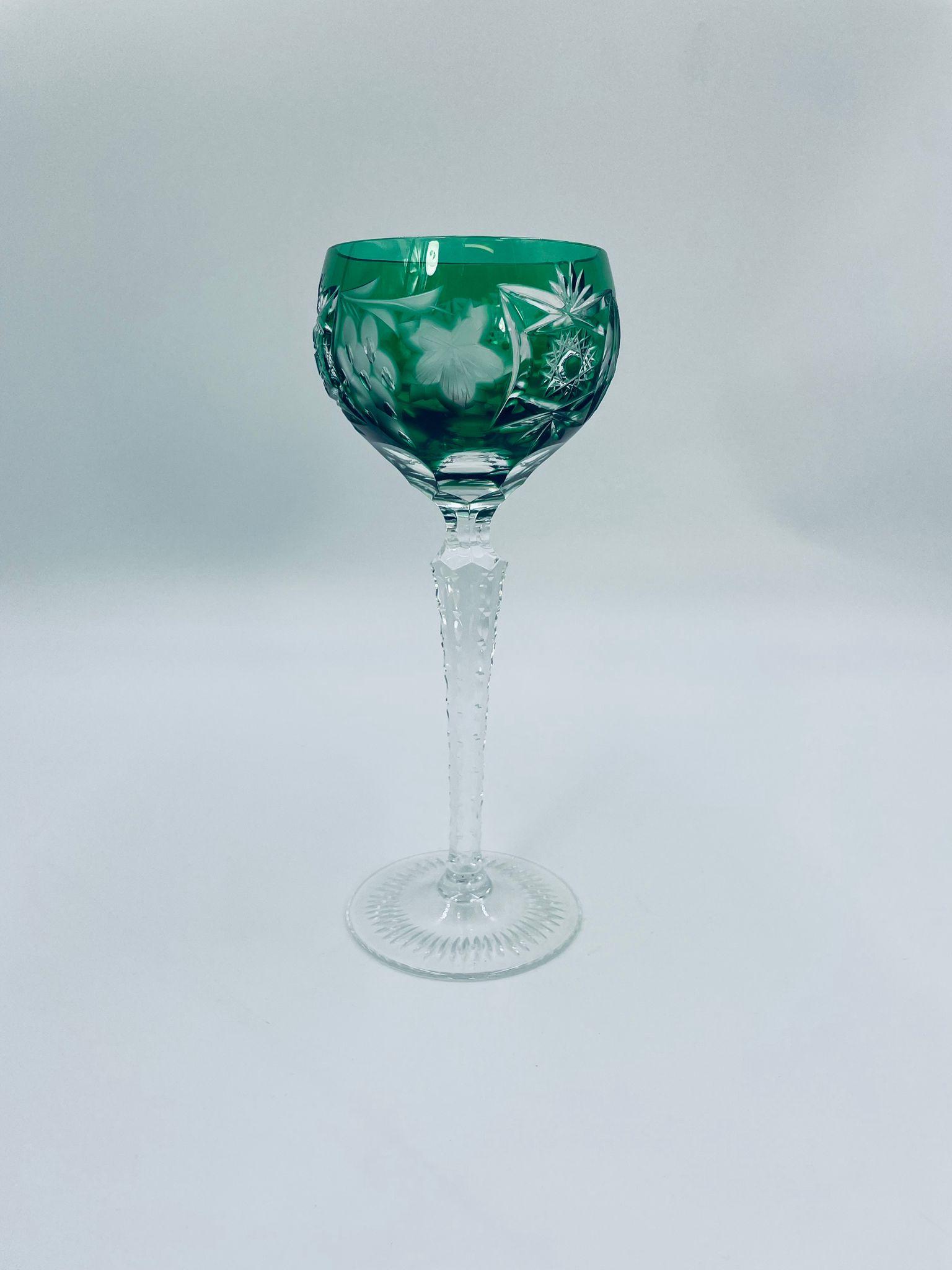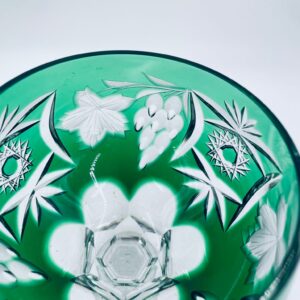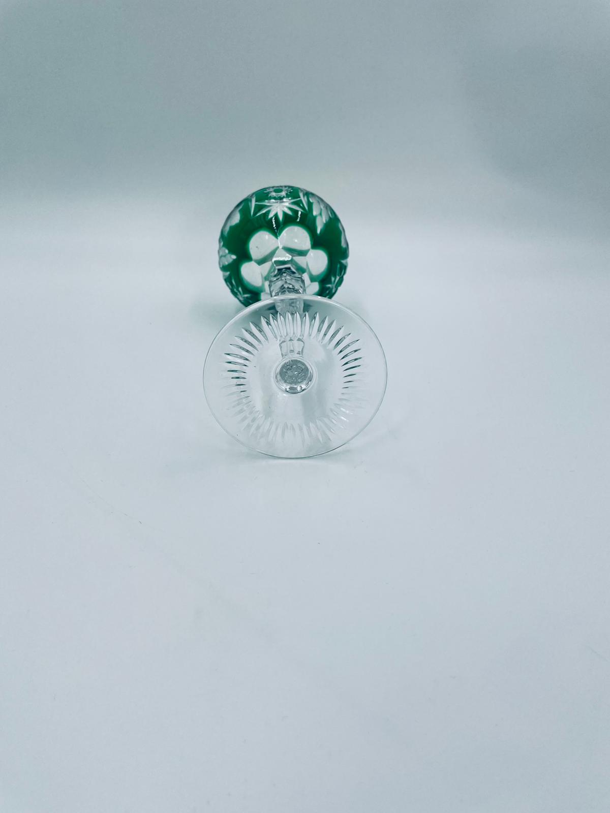 Kieliszek do wina typu Römer, wytwórni Natchmann we wzorze Traube, wykonany z wysokiej jakości szkła kryształowego. Kieliszek posiada szmaragdową, dwuwarstwową czarę z ręcznie szlifowanym , ozdobnym wzorem winogron, liści, wachlarzy i gwiazd, smukłą ozdobną nóżkę oraz podstawę z ozdobnym szlifem.