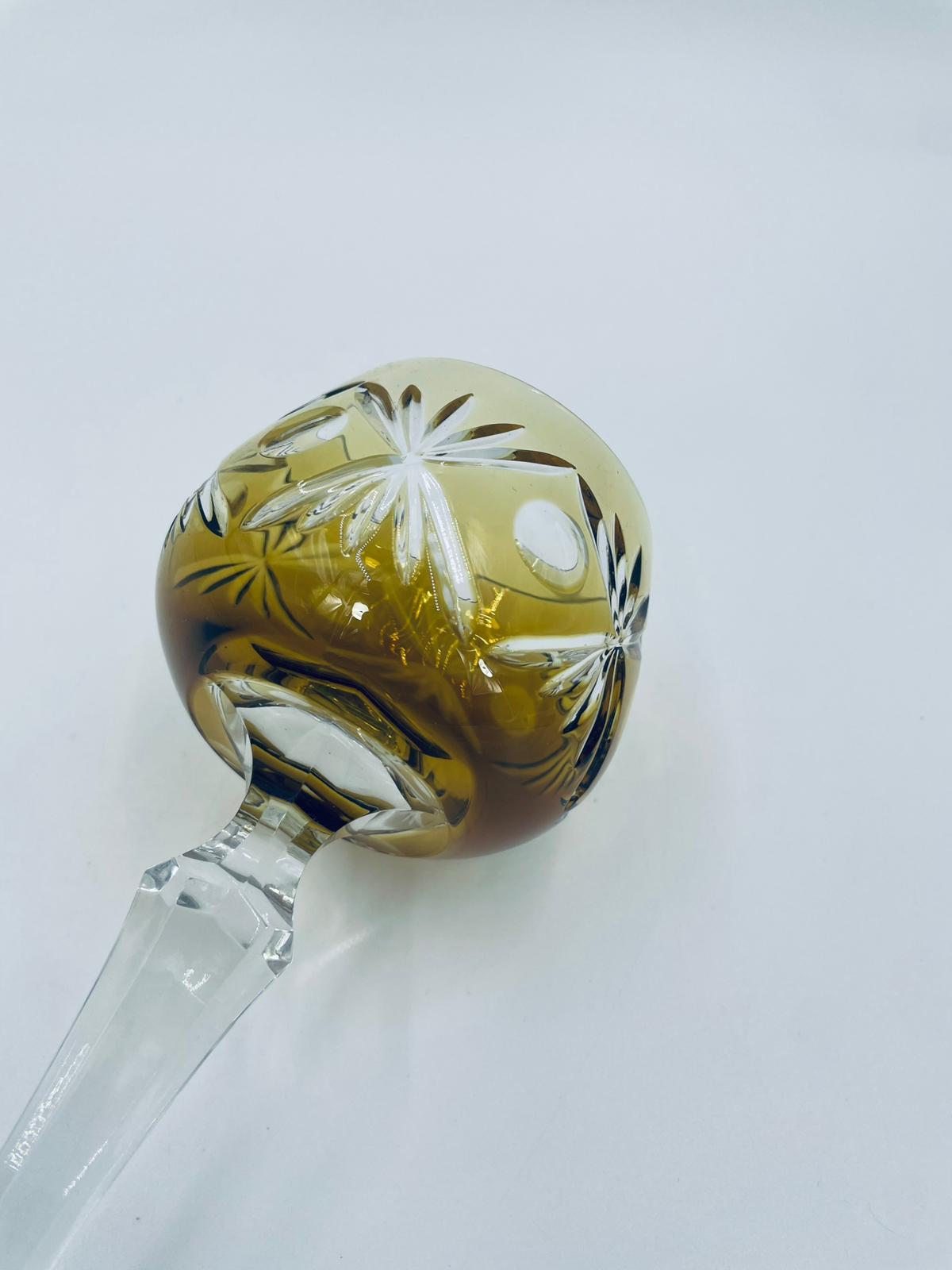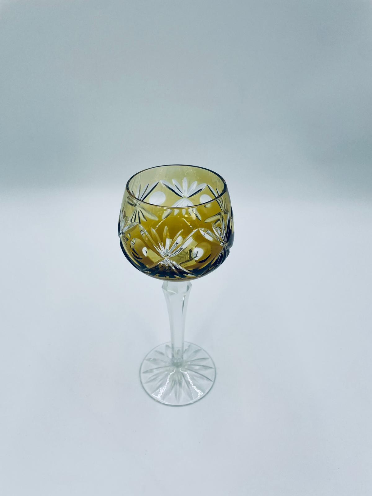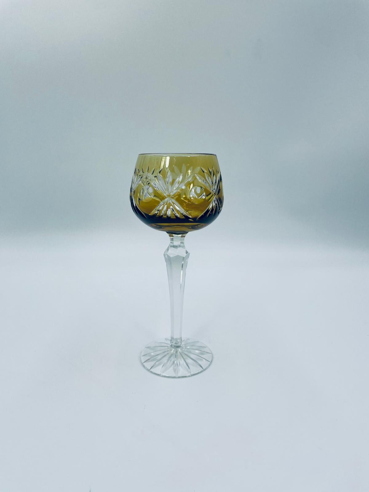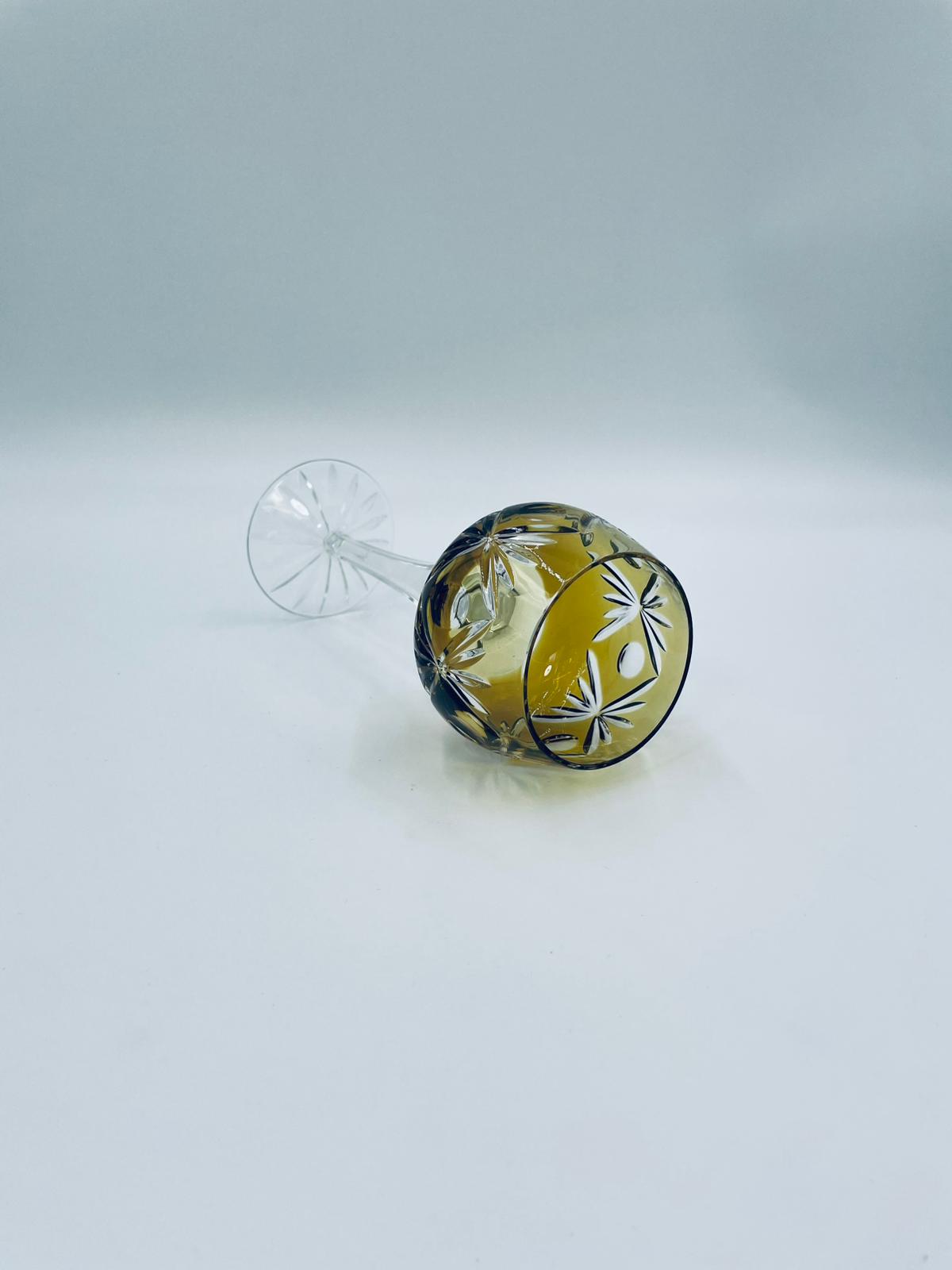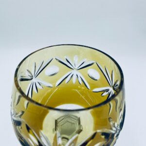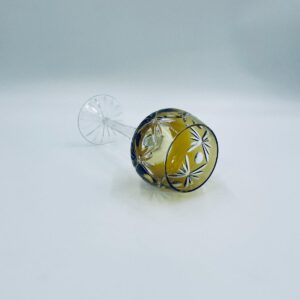 Kieliszek do wina typu Römer w stylu Vintage, z czasów PRL-u, wykonany z wysokiej jakości szkła kryształowego. Kieliszek posiada złoto-miodową, dwuwarstwową czarę z ręcznie szlifowanym, ozdobnym wzorem geometrycznym, smukłą i fasetowana nóżkę oraz ozdobną podstawę z precyzyjnym szlifem.