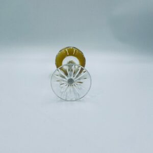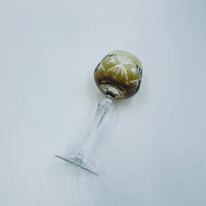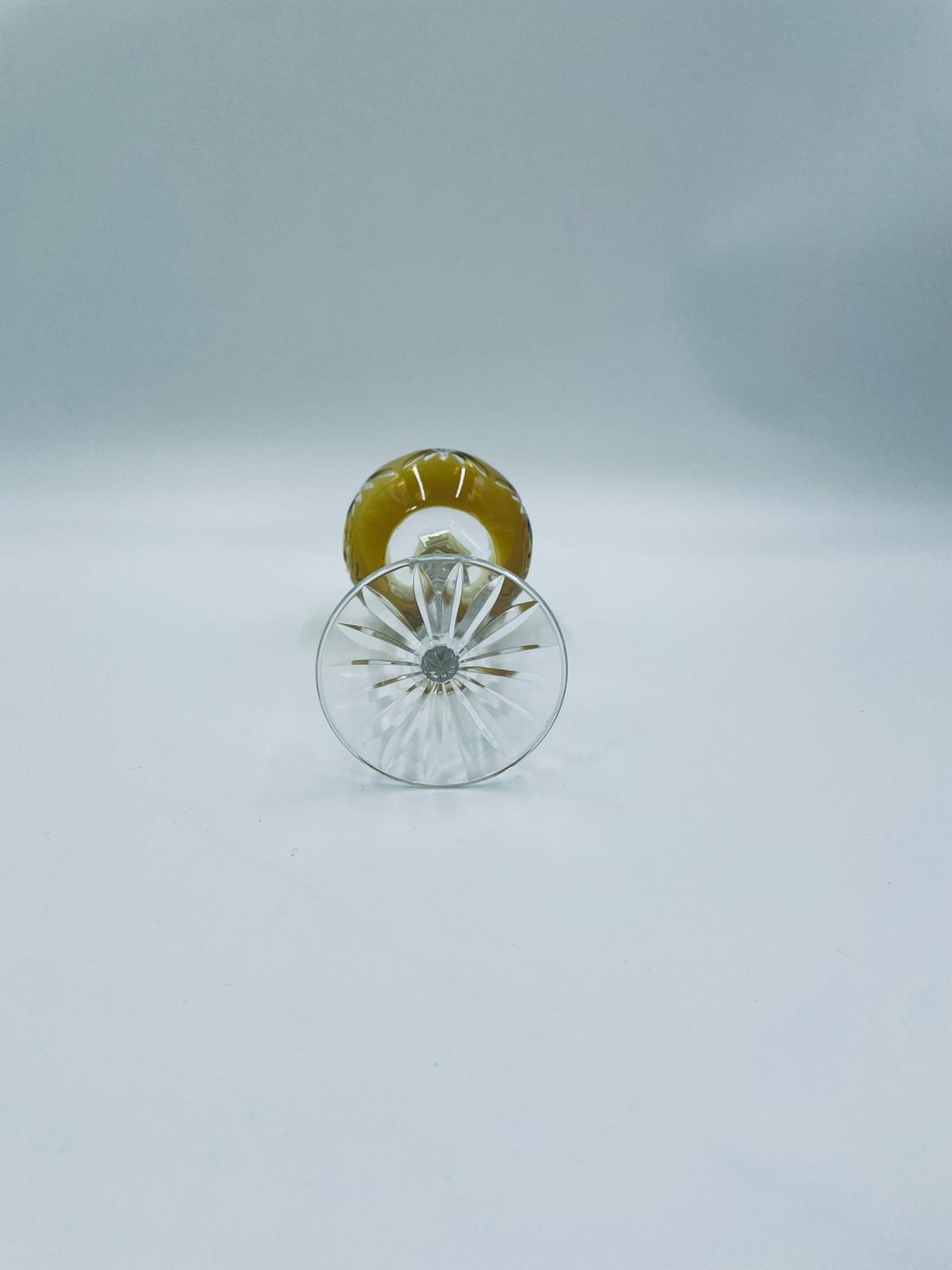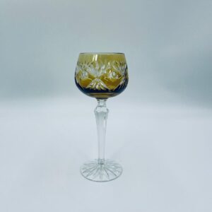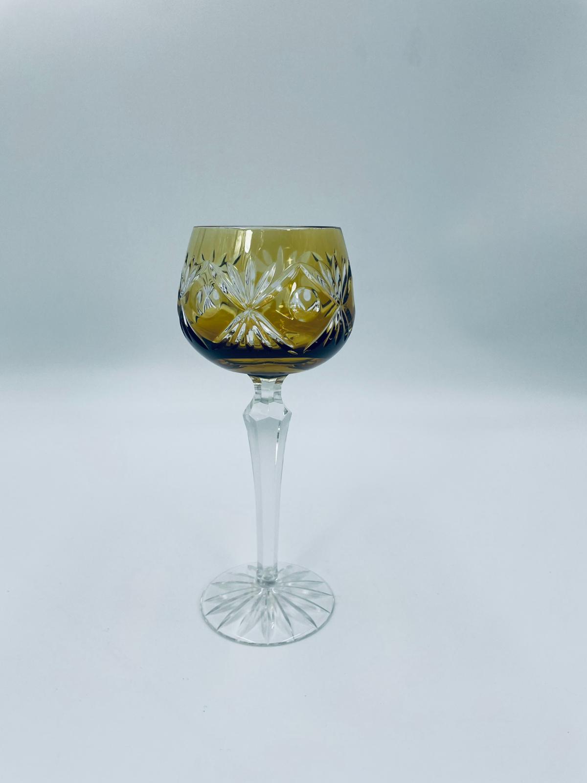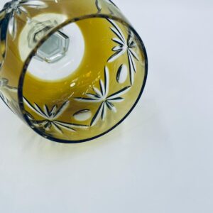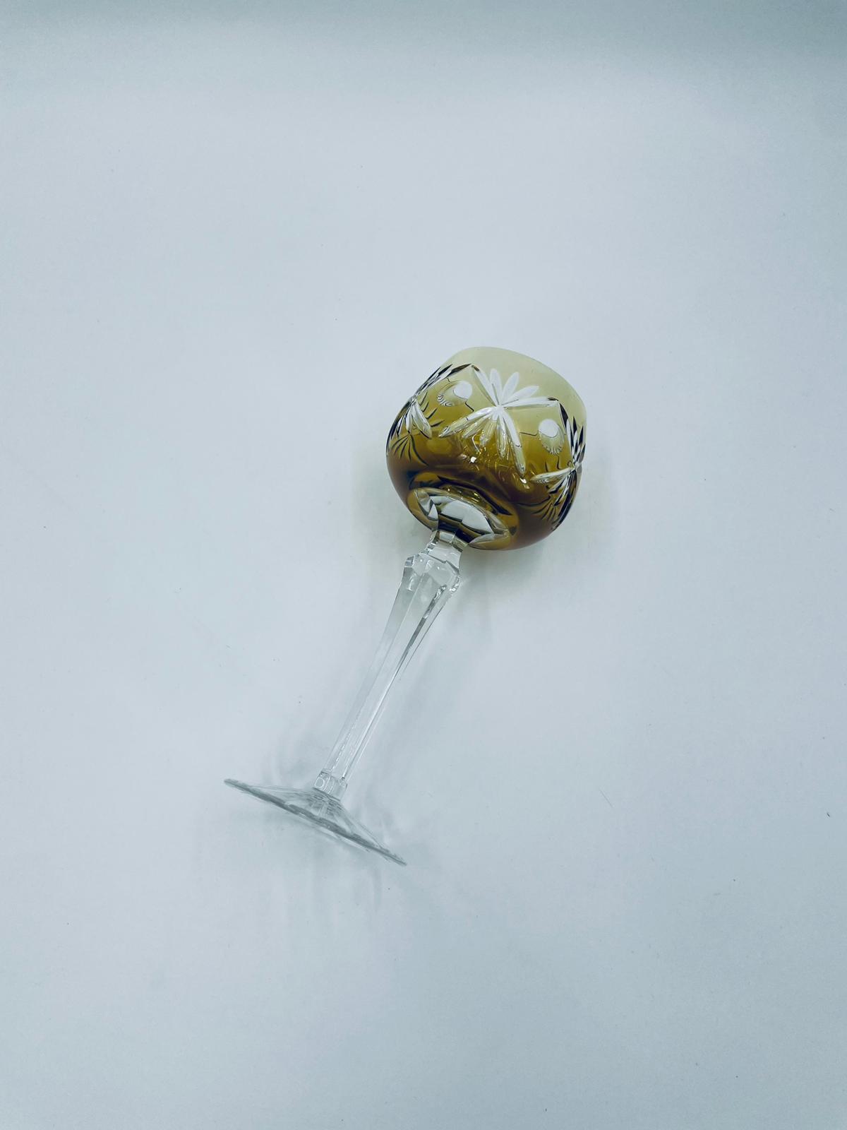 Kieliszek do wina typu Römer w stylu Vintage, z czasów PRL-u, wykonany z wysokiej jakości szkła kryształowego. Kieliszek posiada złoto-miodową, dwuwarstwową czarę z ręcznie szlifowanym, ozdobnym wzorem geometrycznym, smukłą i fasetowana nóżkę oraz ozdobną podstawę z precyzyjnym szlifem.