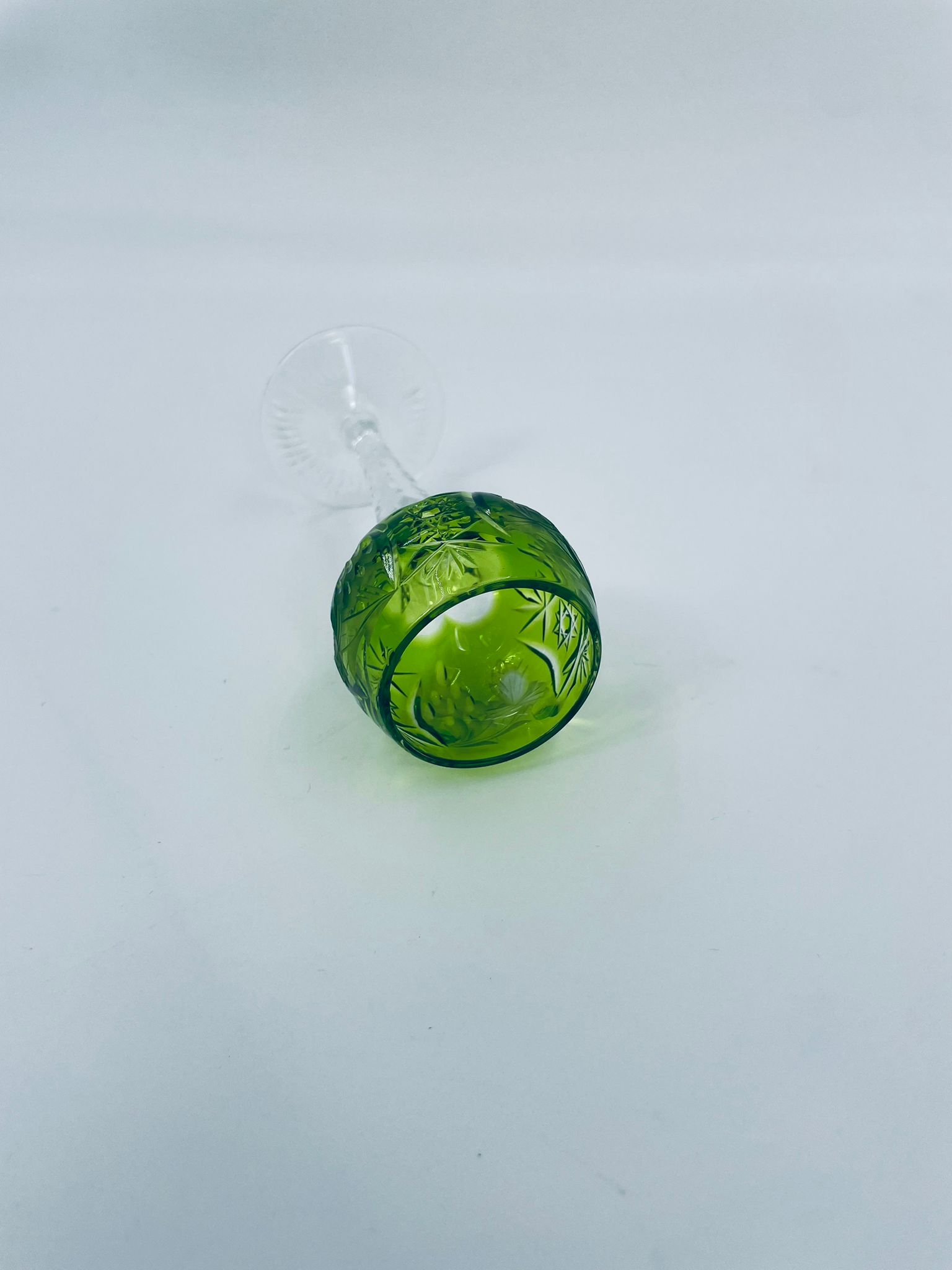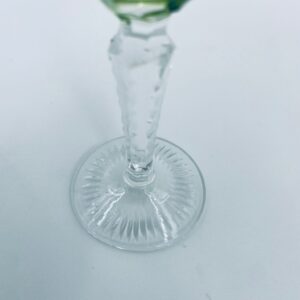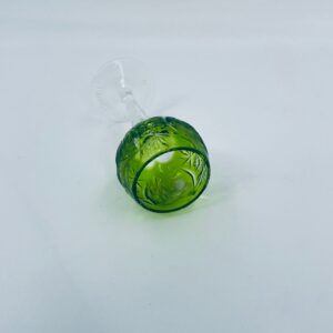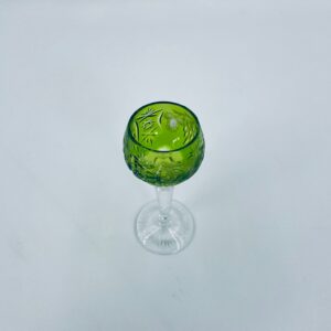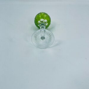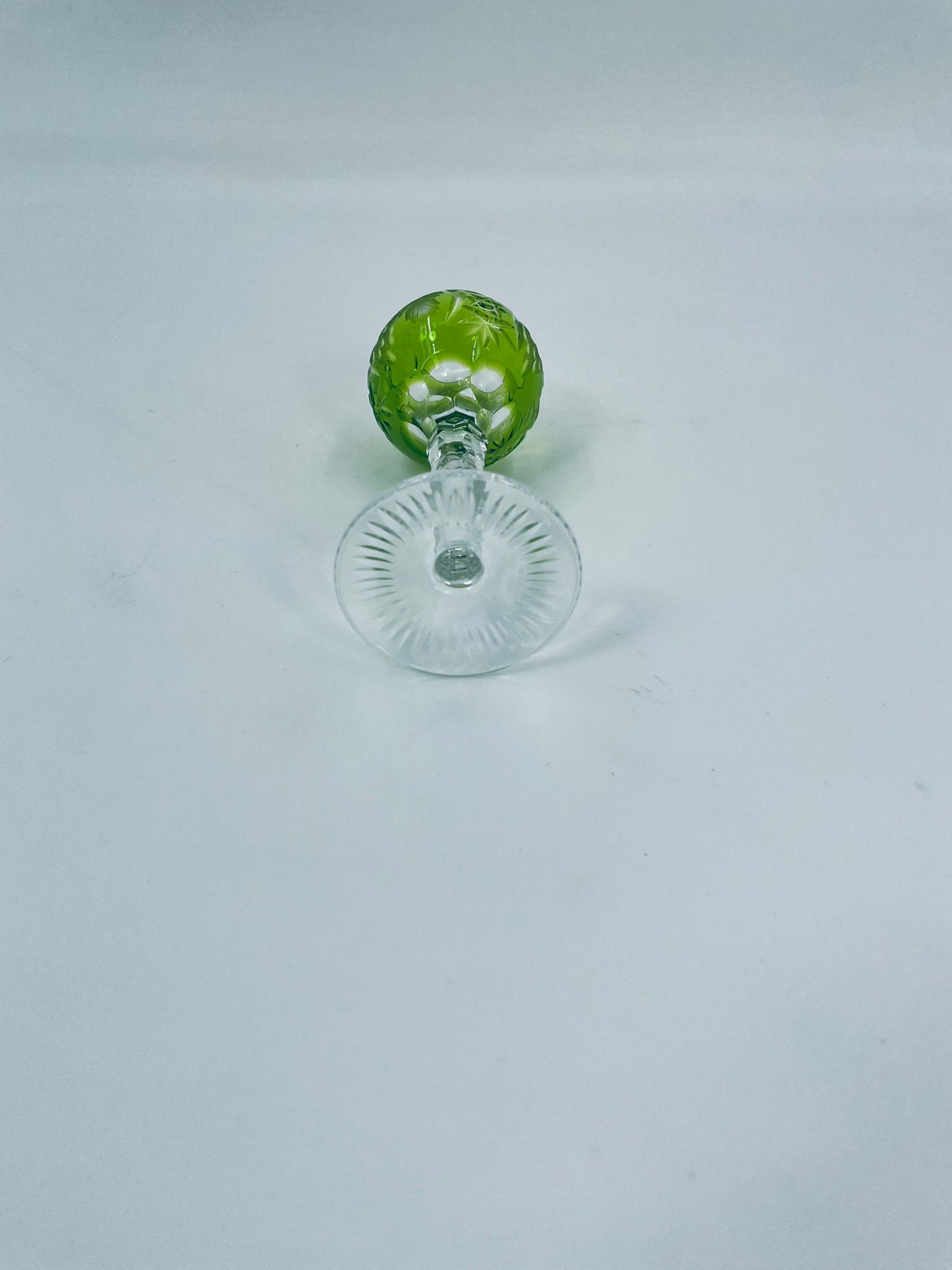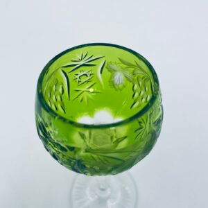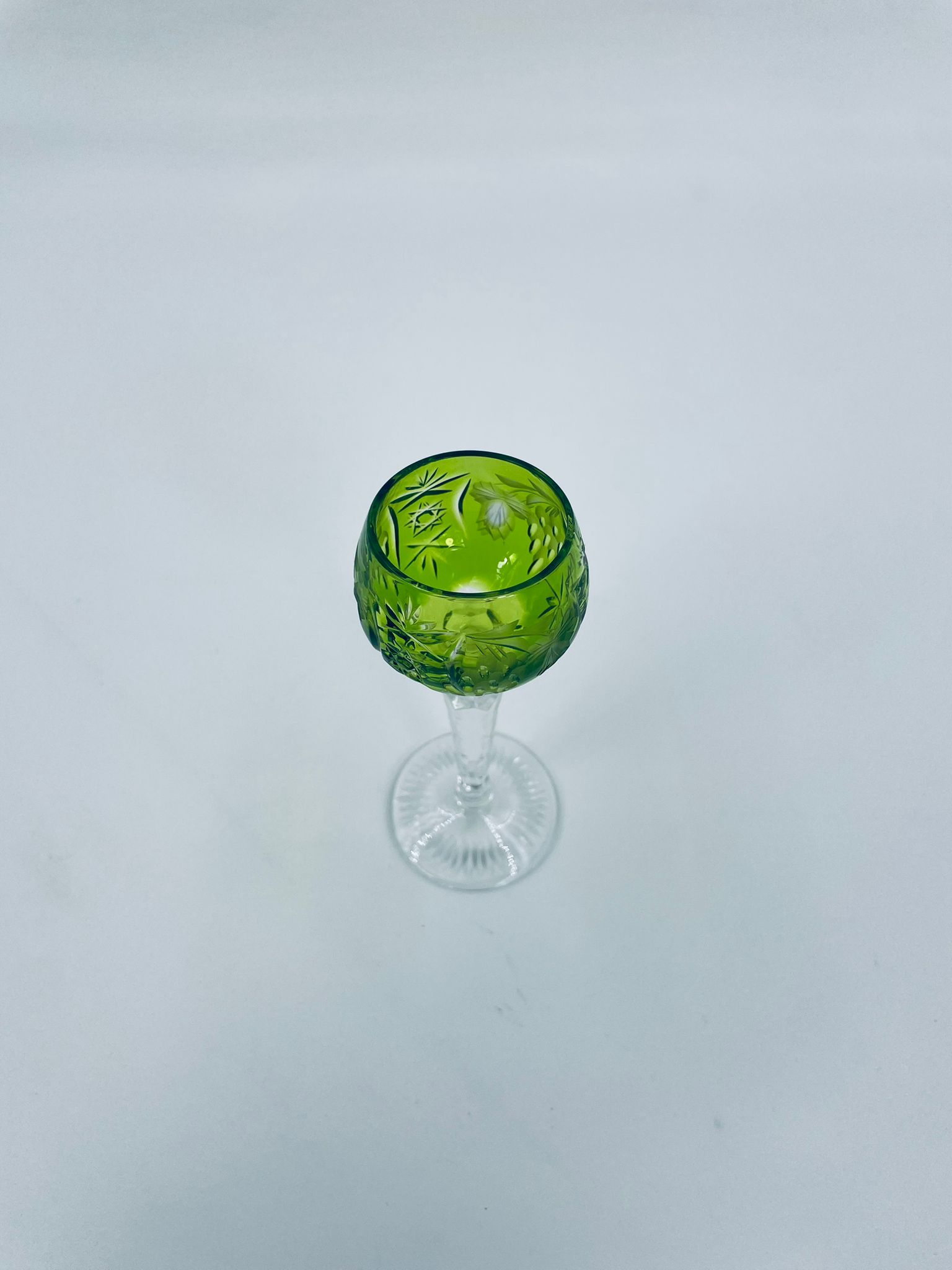 Kieliszek do nalewki Natchmann Traube Amber Cordia Glass, wykonany z wysokiej jakości szkła kryształowego ołowiowego, ciętego z limonkową powłoką. Charakteryzuje się ręcznie dmuchanym i szlifowanym, z ręcznie wycinanymi wzorami z motywem winogron z liśćmi, gwiazd i wachlarzy. Ozdobna nóżka i podstawa przezroczysta.