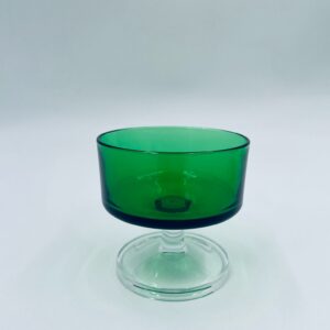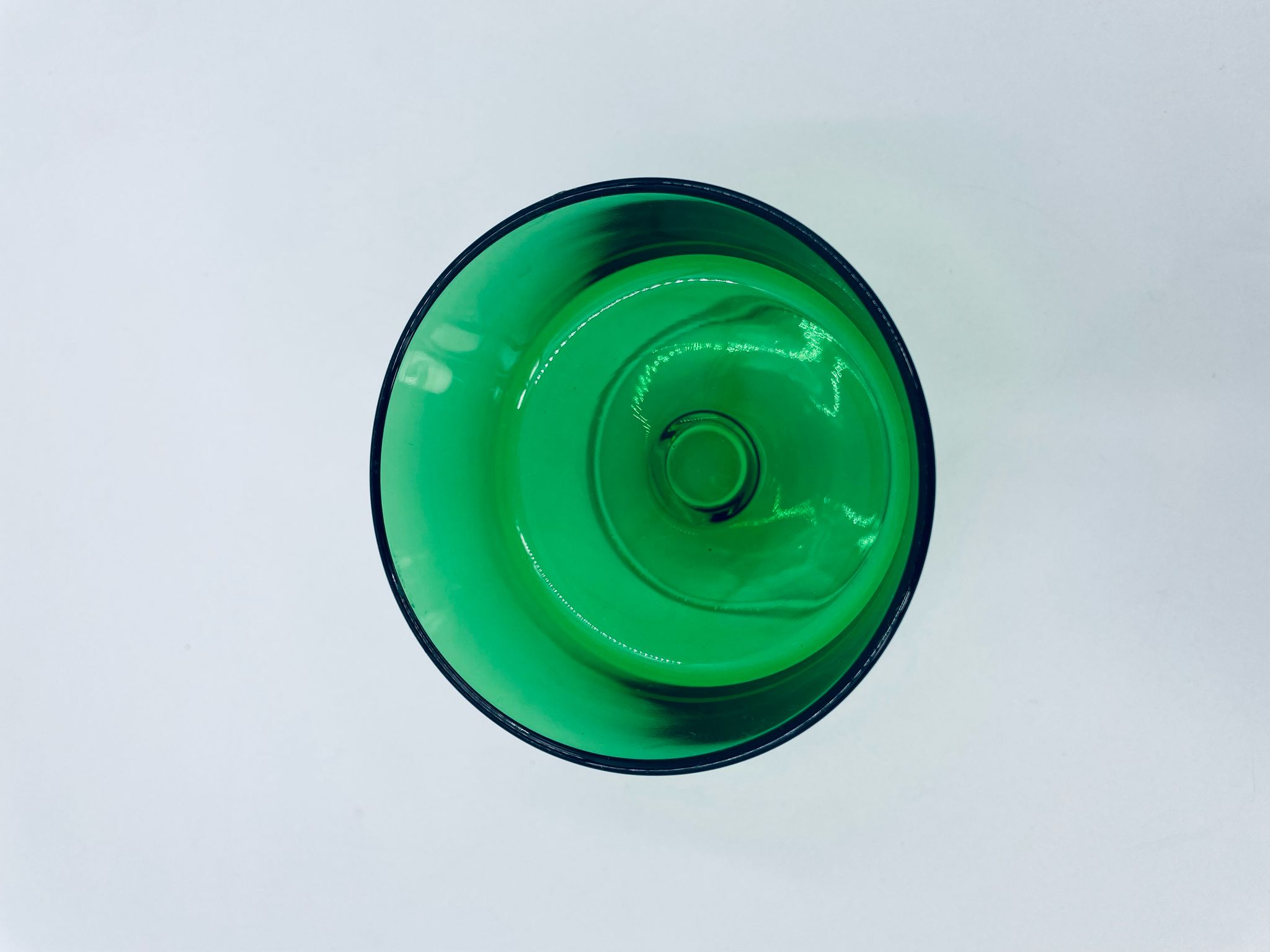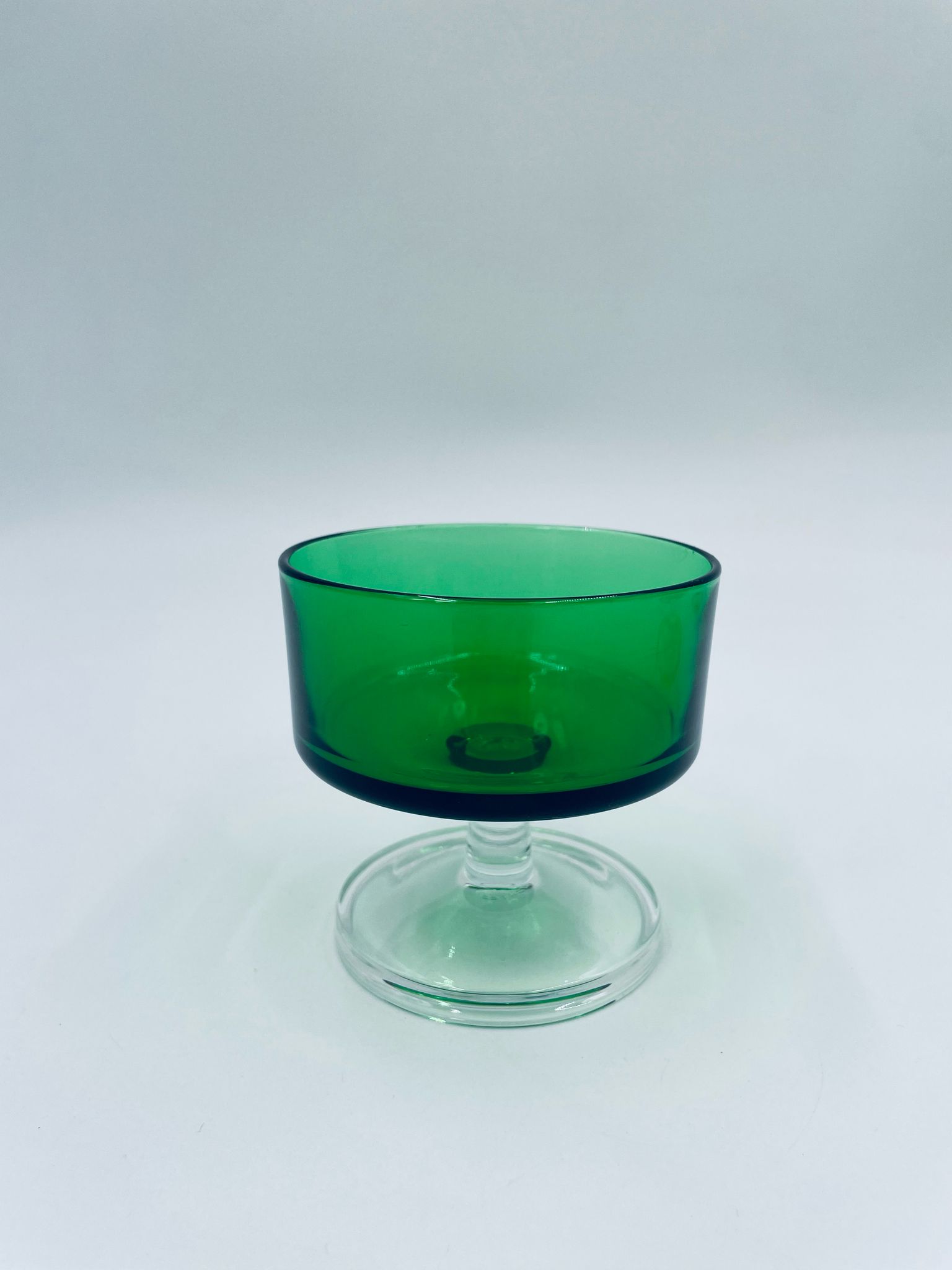 Kieliszek, pucharek szklany w kolorze zielonym wyprodukowany przez francuską firmę w latach 60/70-tych. Na każdym kieliszku na dnie widnienie nazwa FRANCE.