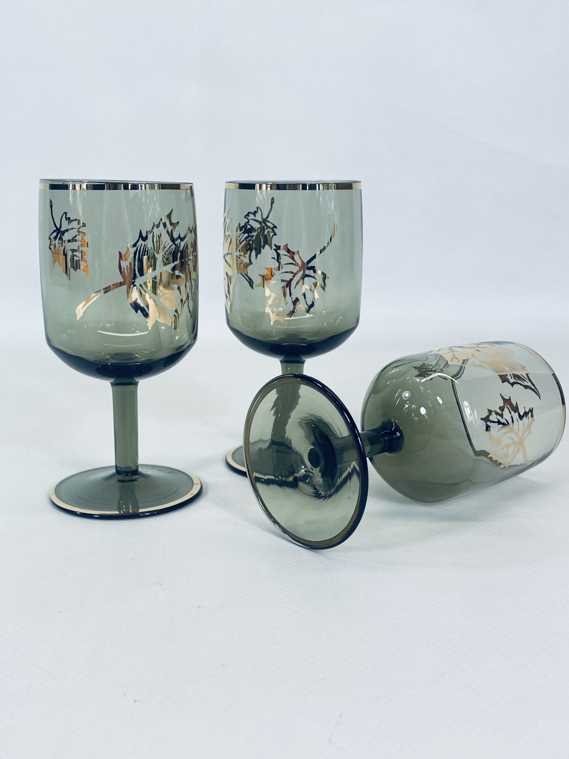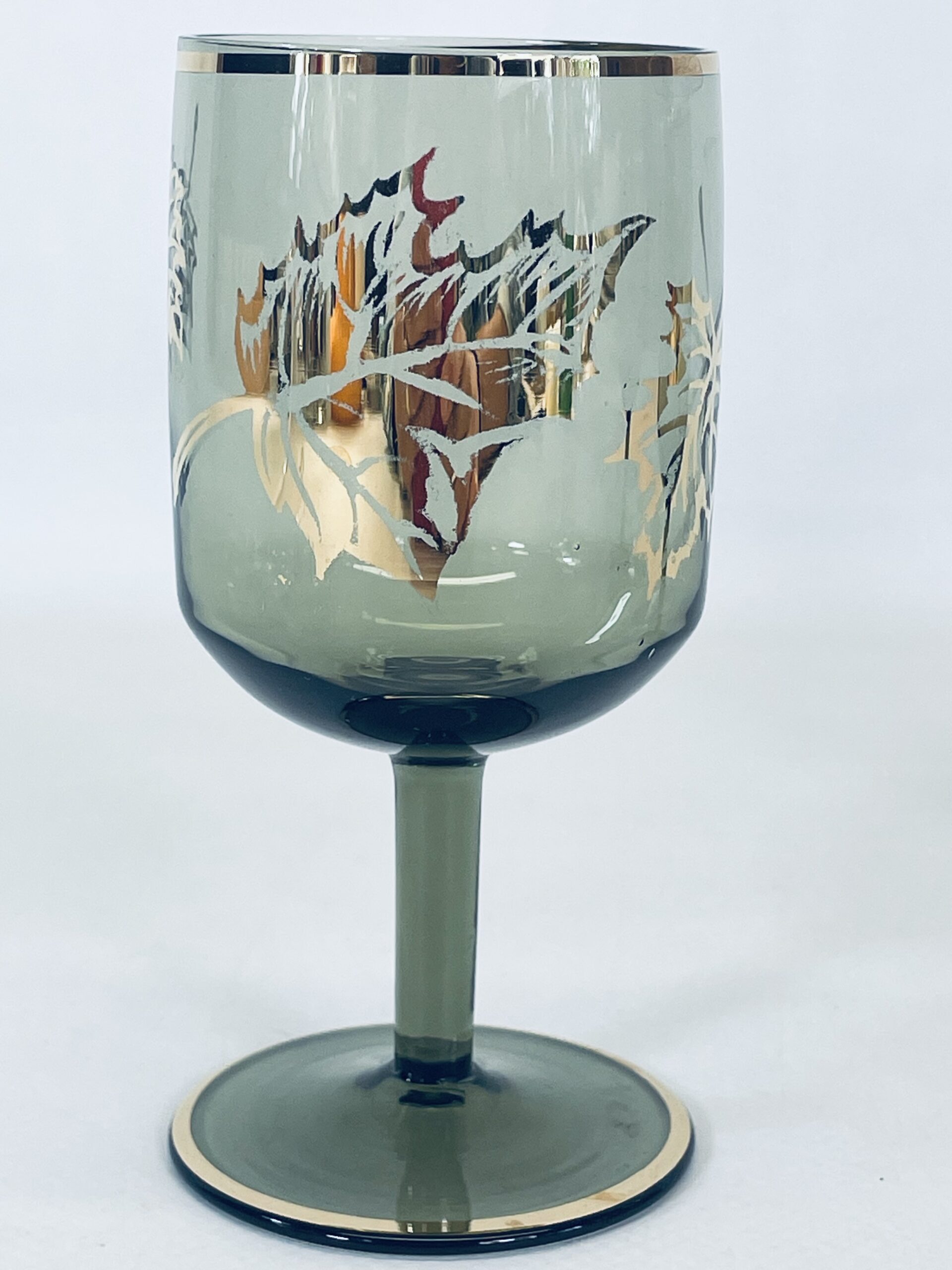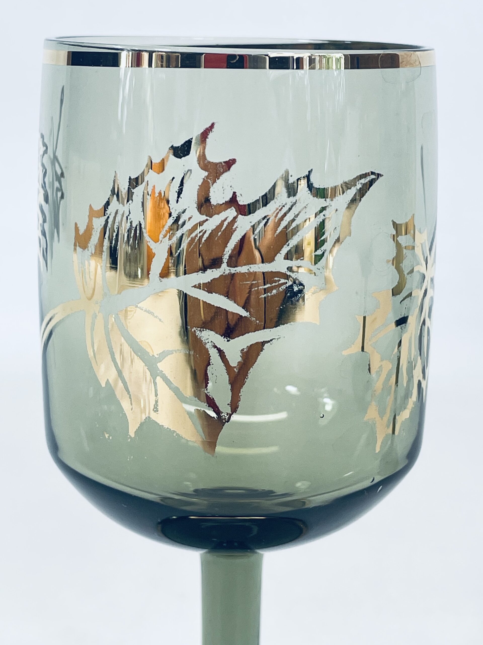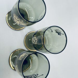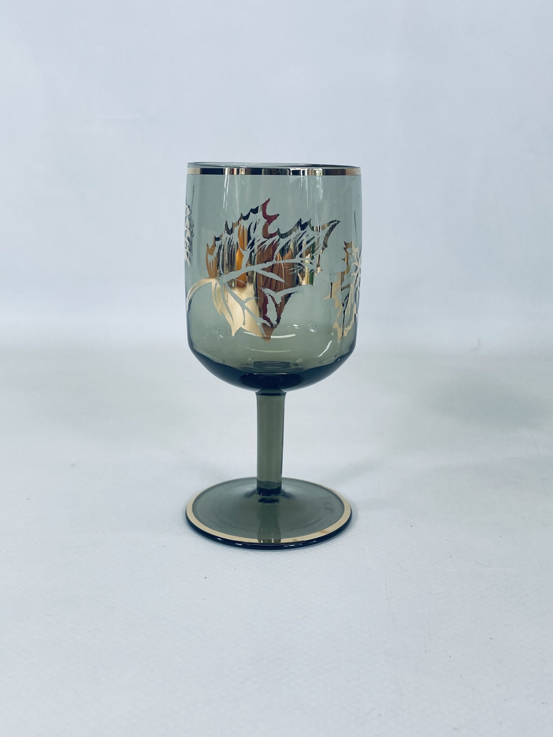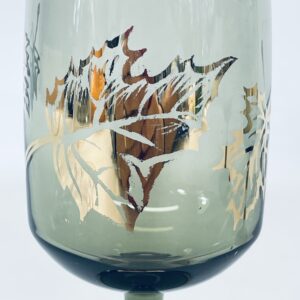 Kieliszek ze szkła dymionego wykończony złotymi brzegami jak również liśćmi.