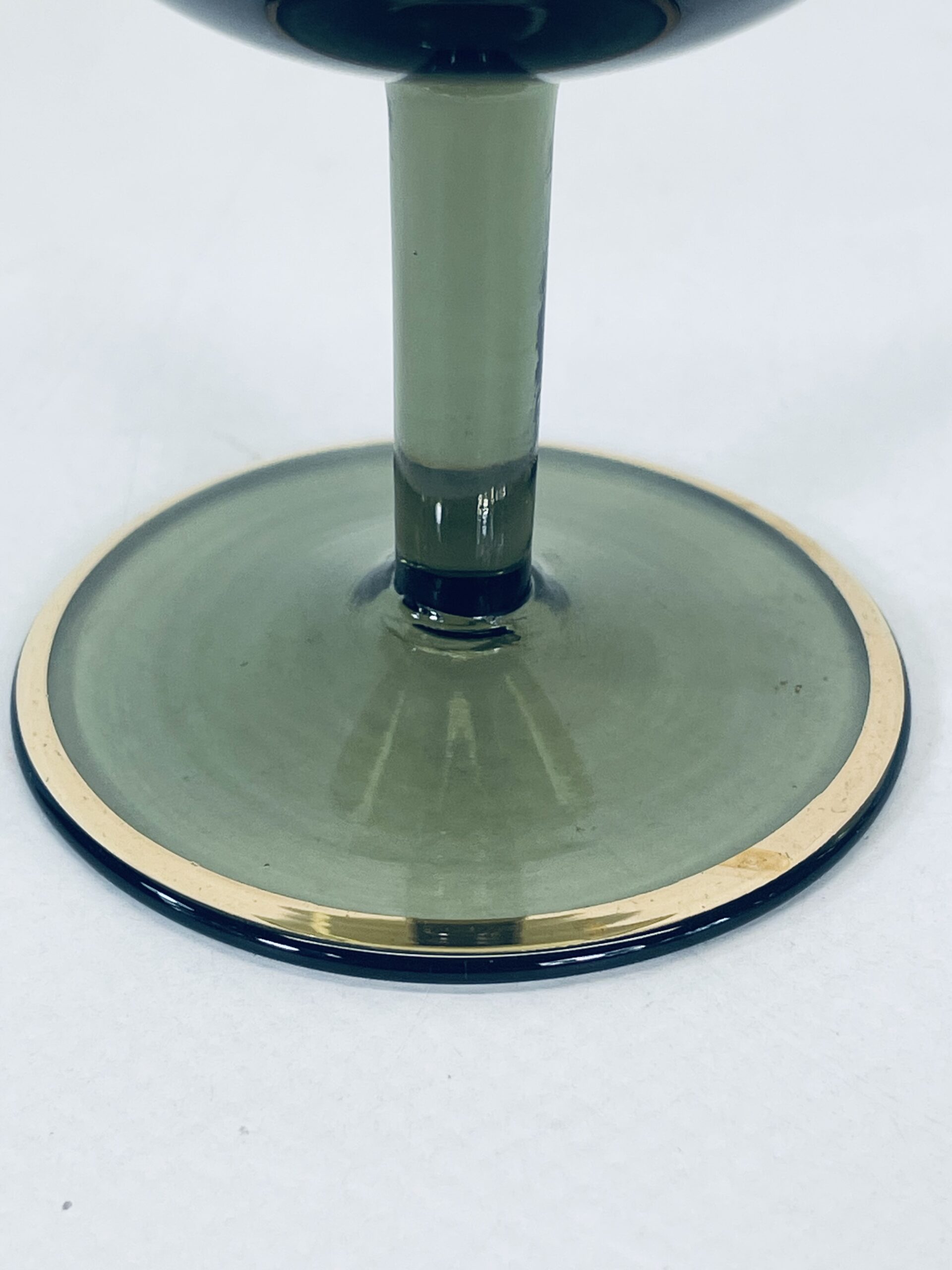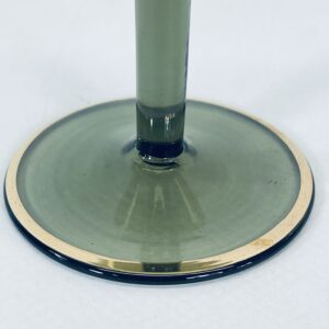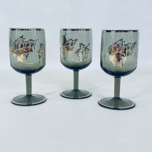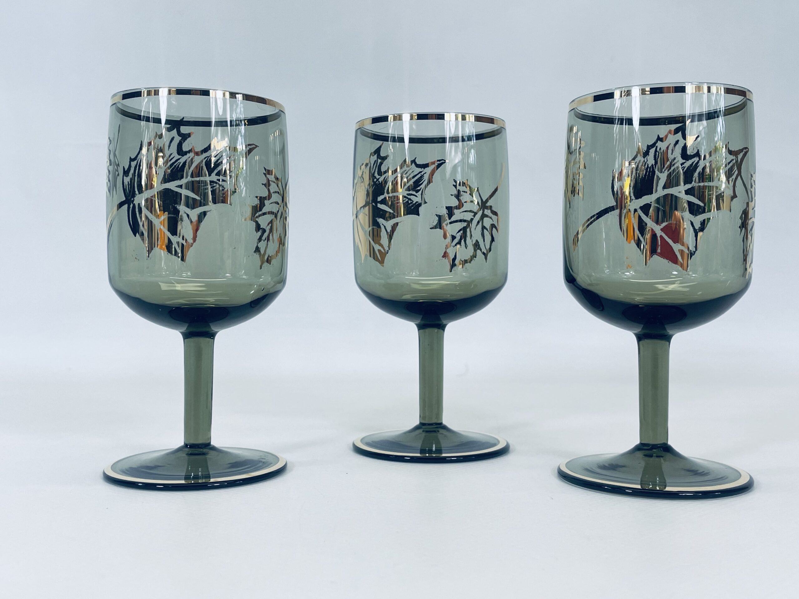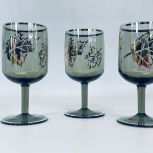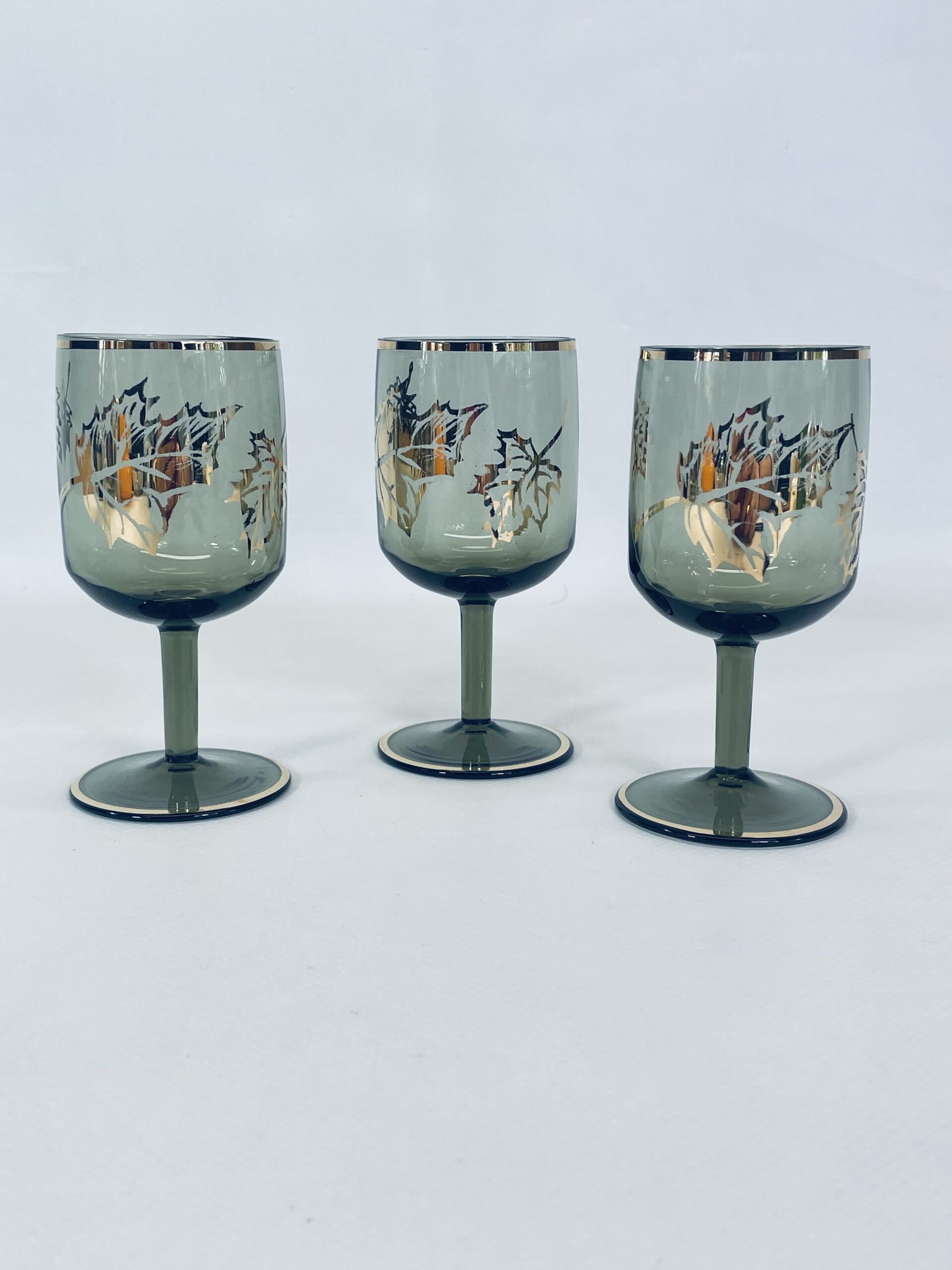 Kieliszek ze szkła dymionego wykończony złotymi brzegami jak również liśćmi.