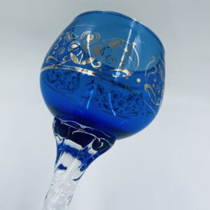 Posiada delikatny dekor złocony na kielichu i na podstawie oraz zakręconą nóżkę.