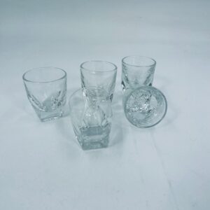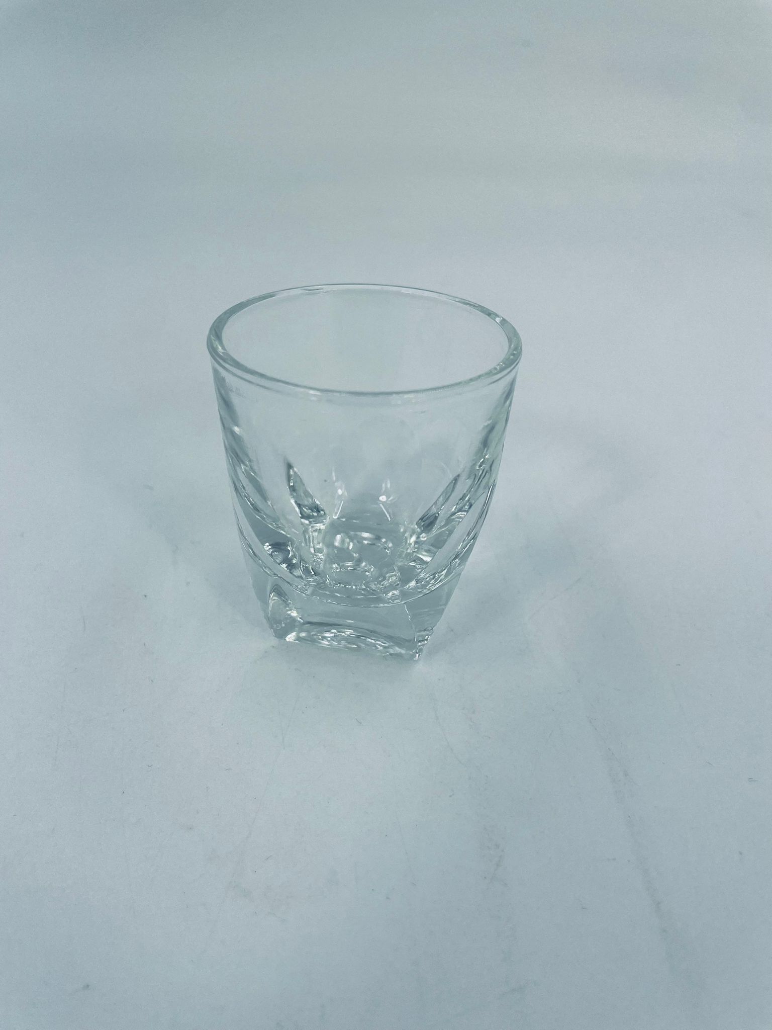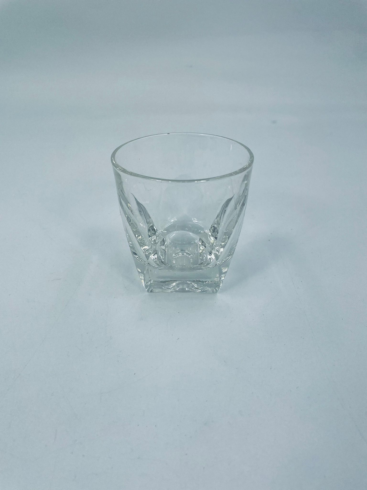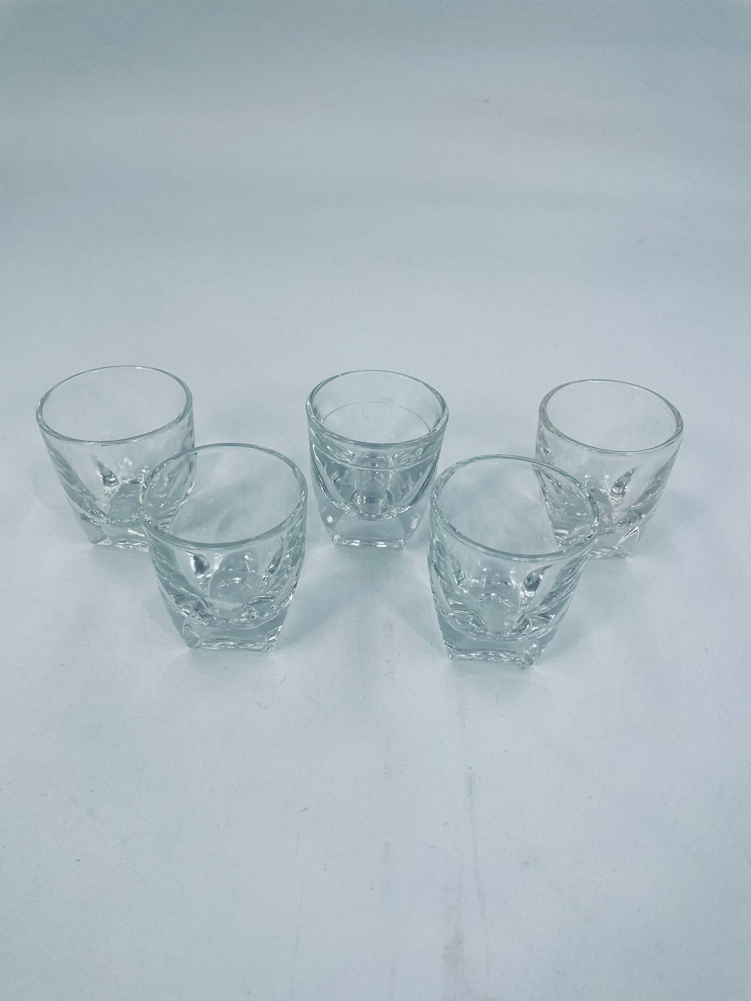 Kolekcjonerskie kieliszki Art Deco. Górna część w kształcie okrągłym, podstawa 4-boczna. Szkło bezbarwne z lat 40tych XXw.