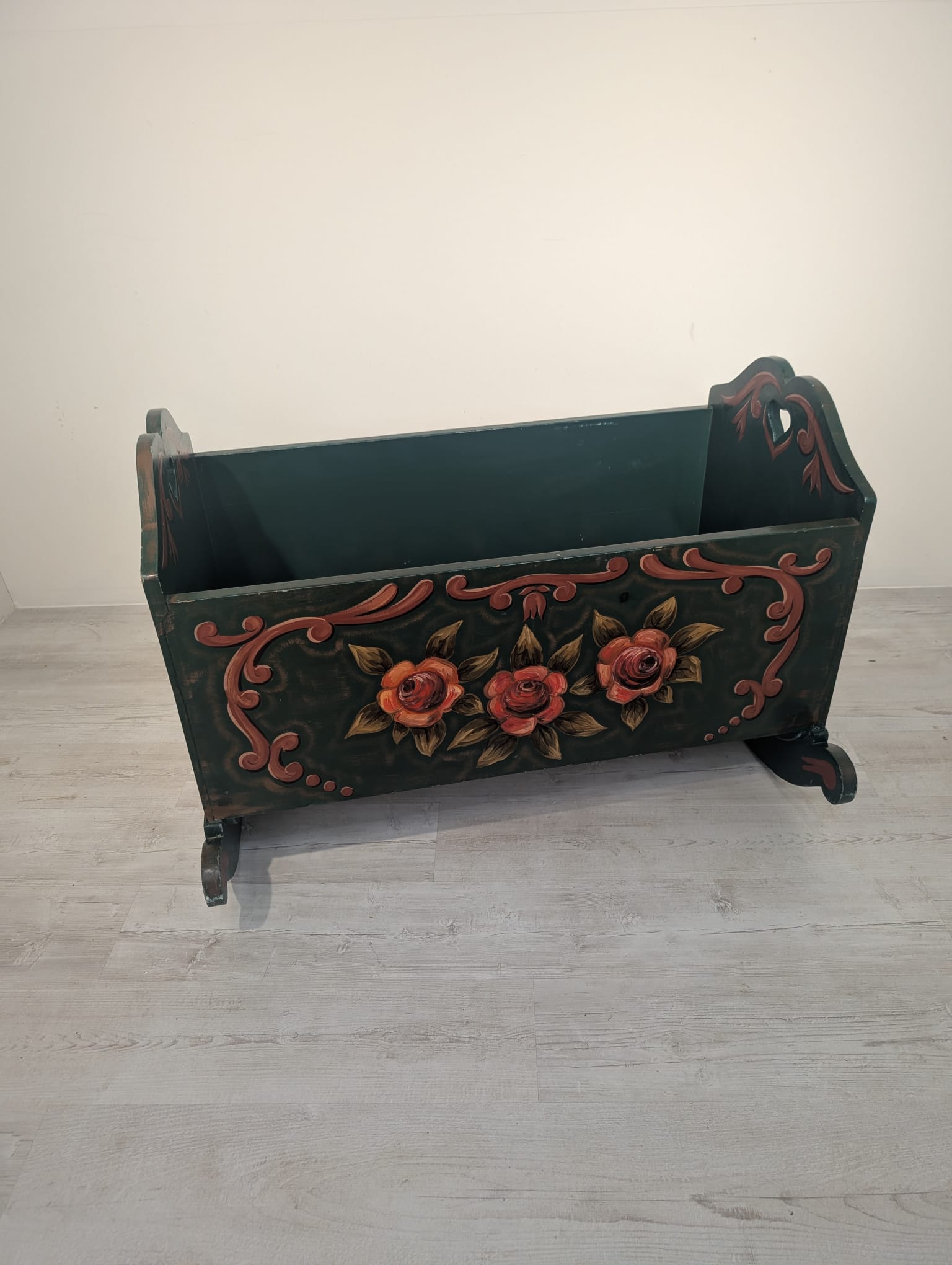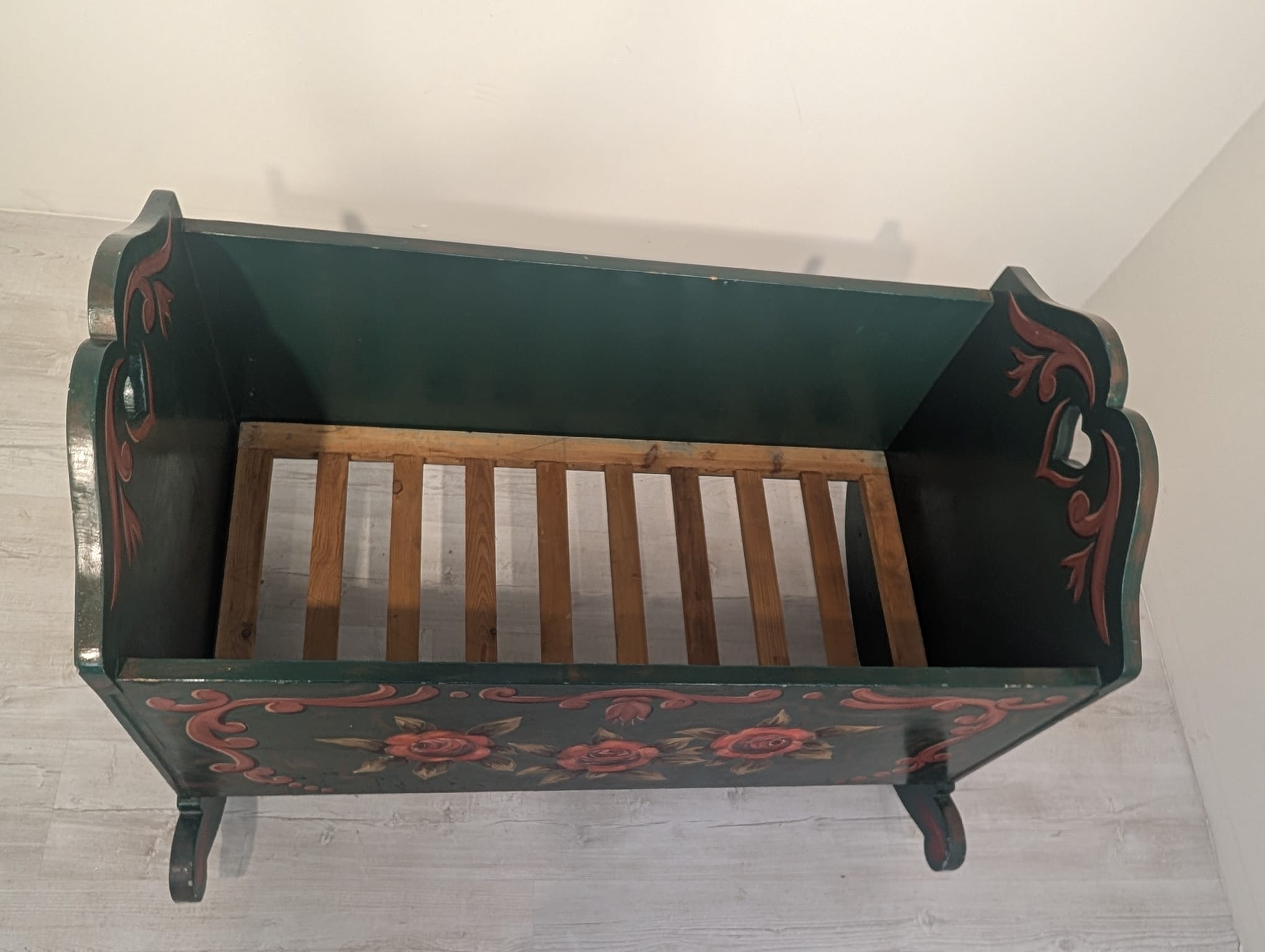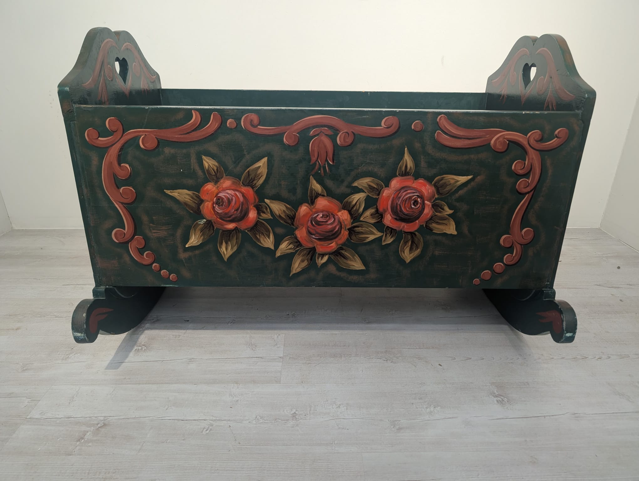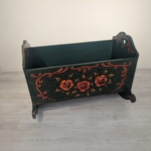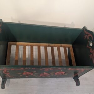 Ręcznie malowana drewniana kołyska z lat 40. XX wieku. Posiada piękne, ręcznie zdobione elementy w ciemnej, zielonej barwie. Kołyska jest w stanie używanym, ale nadal w dobrym stanie.