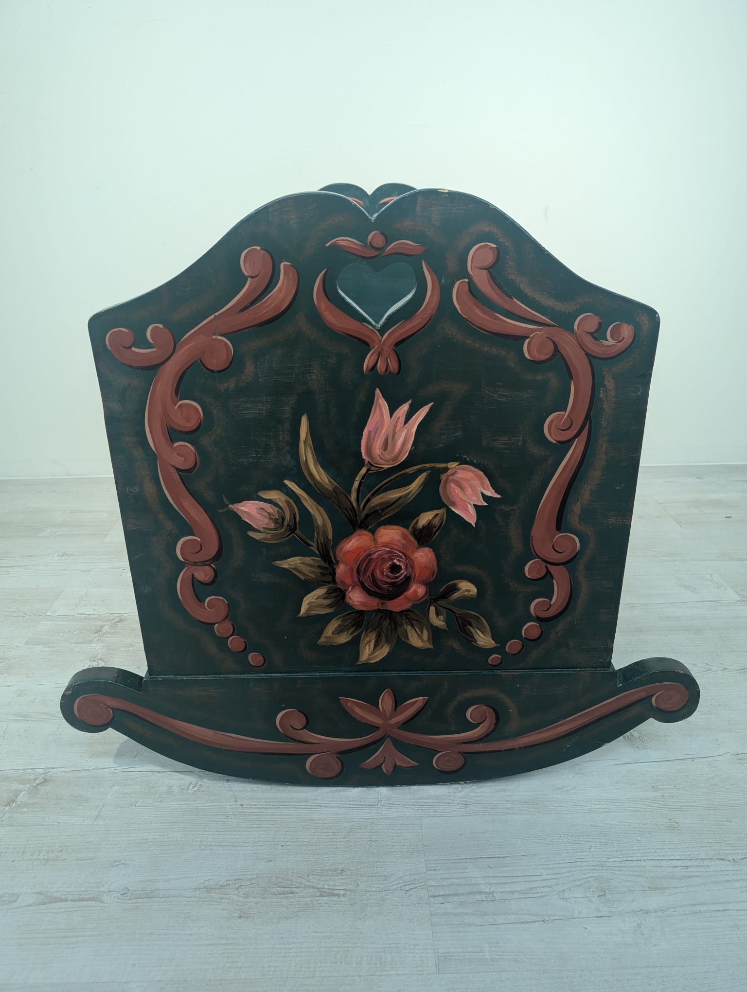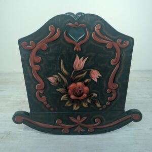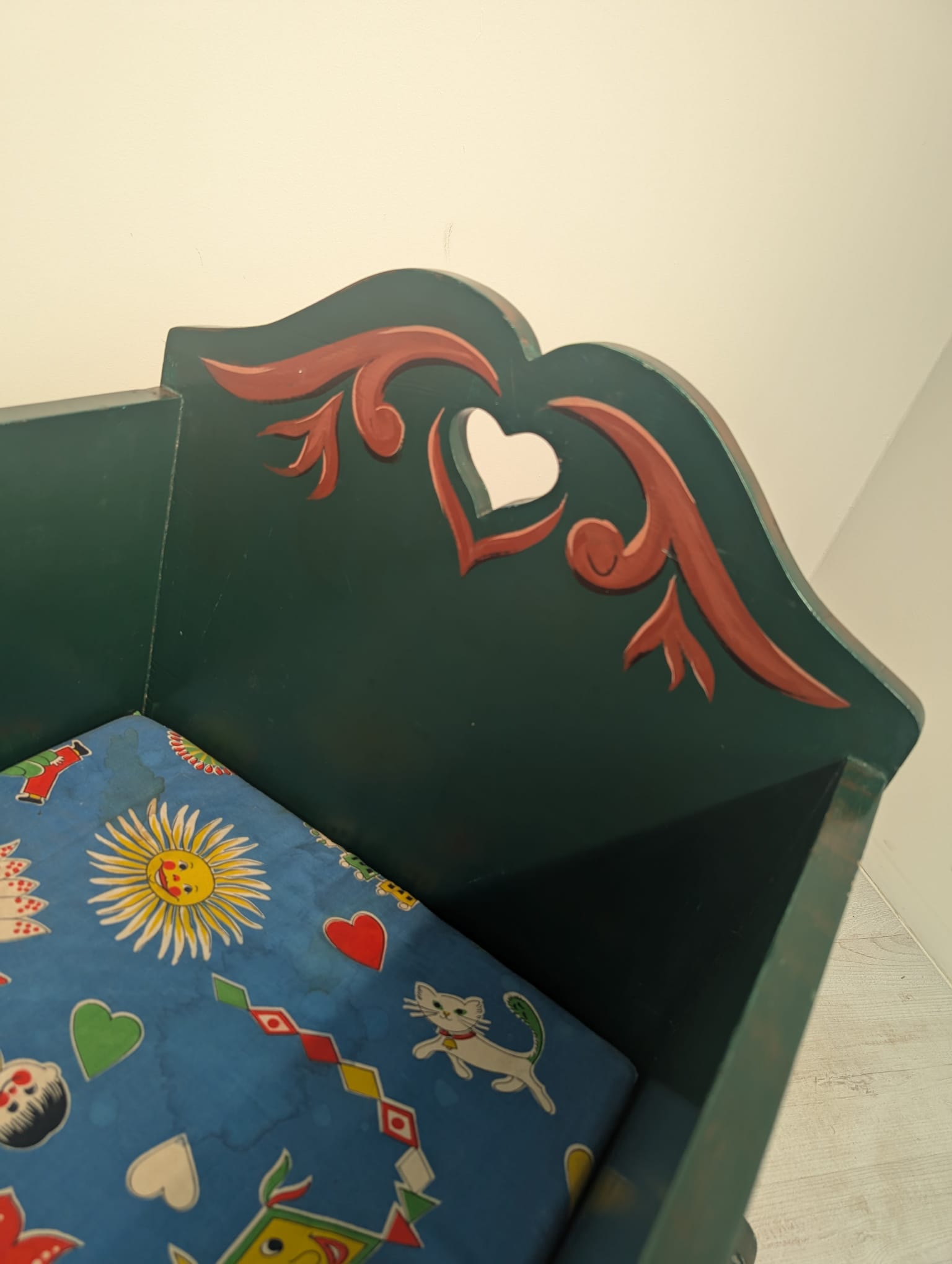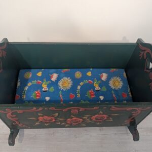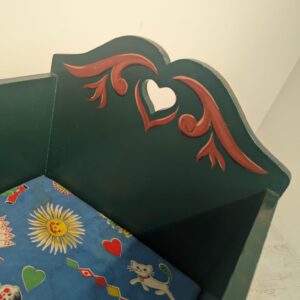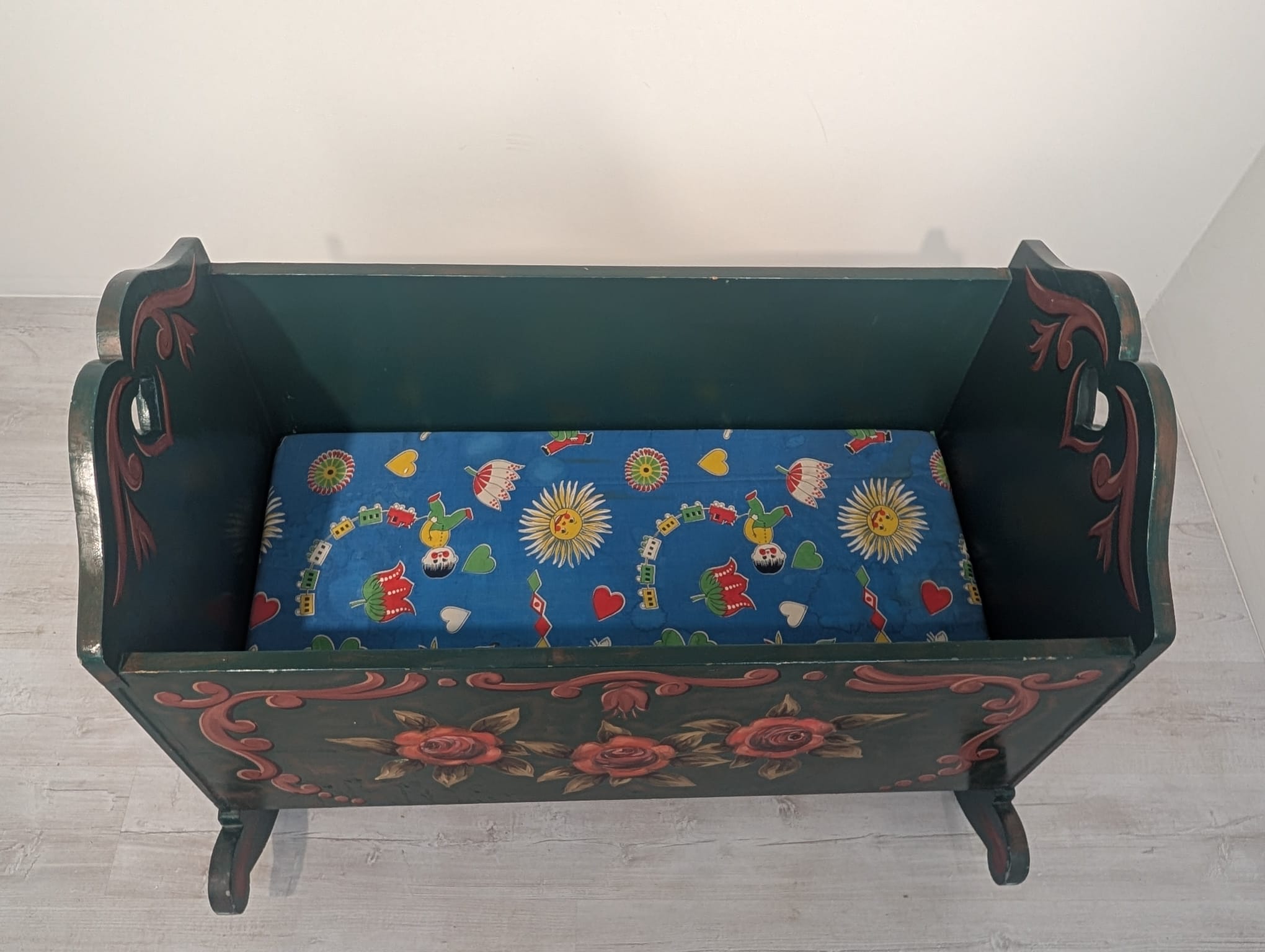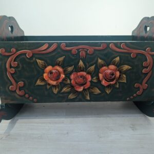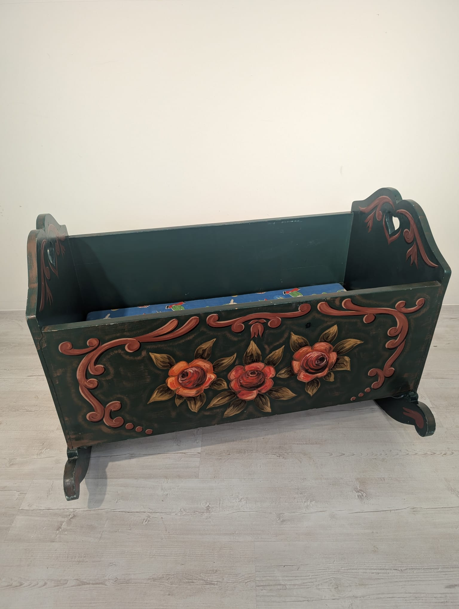 Ręcznie malowana drewniana kołyska z lat 40. XX wieku. Posiada piękne, ręcznie zdobione elementy w ciemnej, zielonej barwie. Kołyska jest w stanie używanym, ale nadal w dobrym stanie.