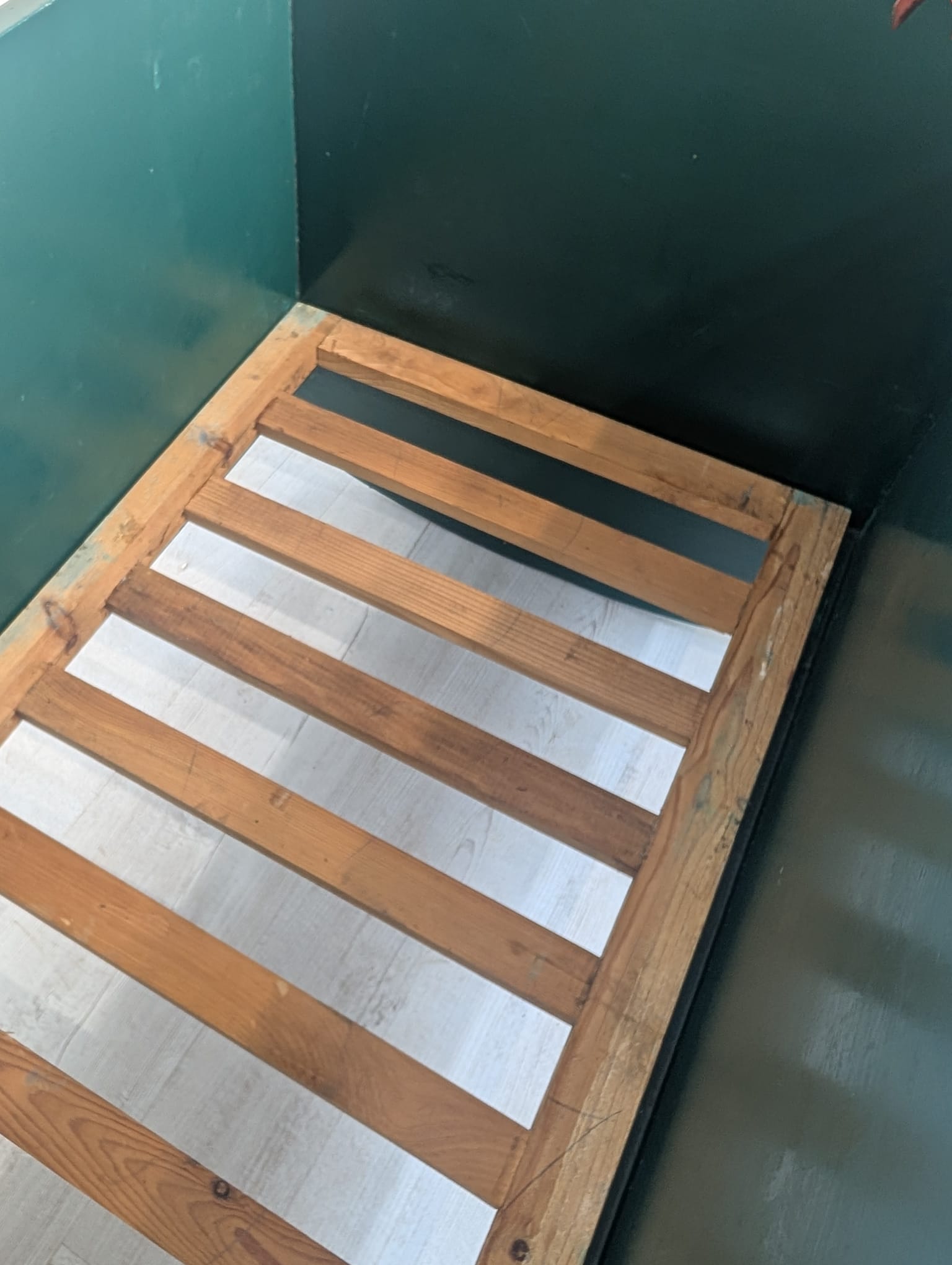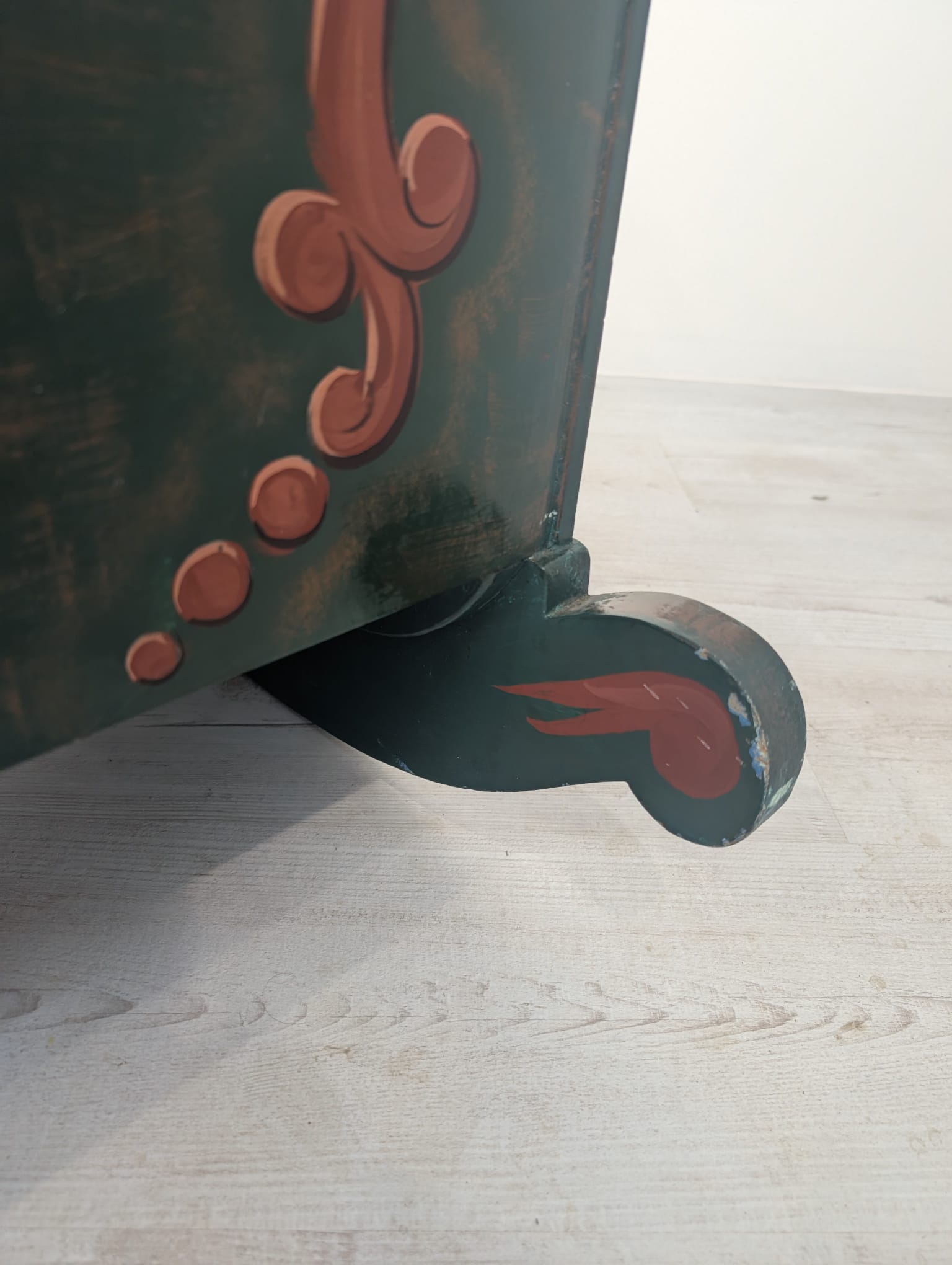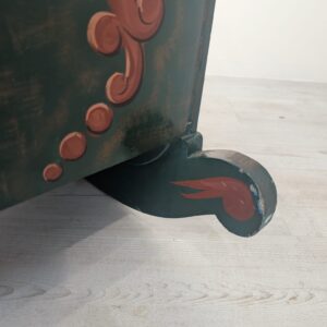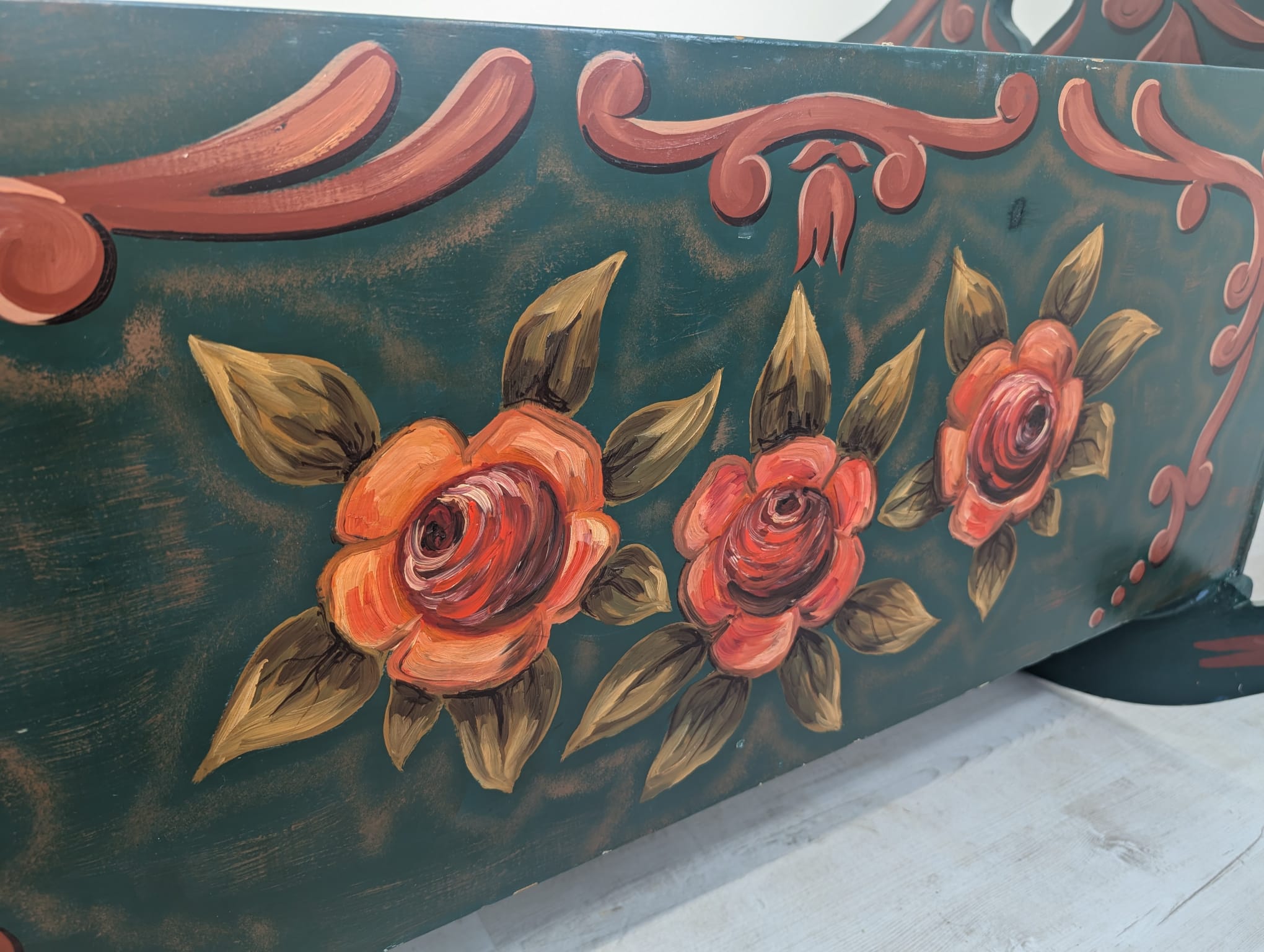 Ręcznie malowana drewniana kołyska z lat 40. XX wieku. Posiada piękne, ręcznie zdobione elementy w ciemnej, zielonej barwie. Kołyska jest w stanie używanym, ale nadal w dobrym stanie.
