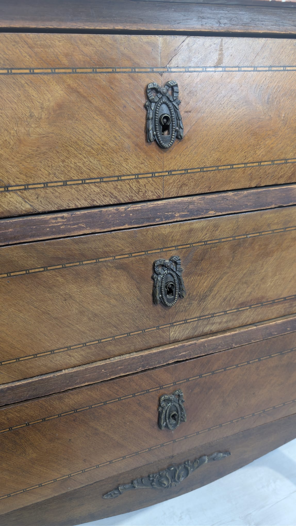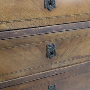 Komoda posiada ślady czasu oraz nadpęknięty blat ale jest cały.