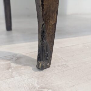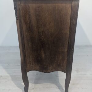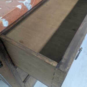 Stylowy, zabytkowy kredens w stylu neokocowym z czerwonym marmurowym blatem. Mebel posiada trzy szuflady, które zapewniają dodatkową przestrzeń do przechowywania. Drewniana konstrukcja w ciemnym odcieniu nadaje mu elegancki wygląd. Idealny do klasycznego lub vintage’owego wnętrza.
