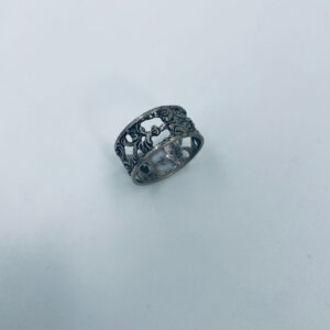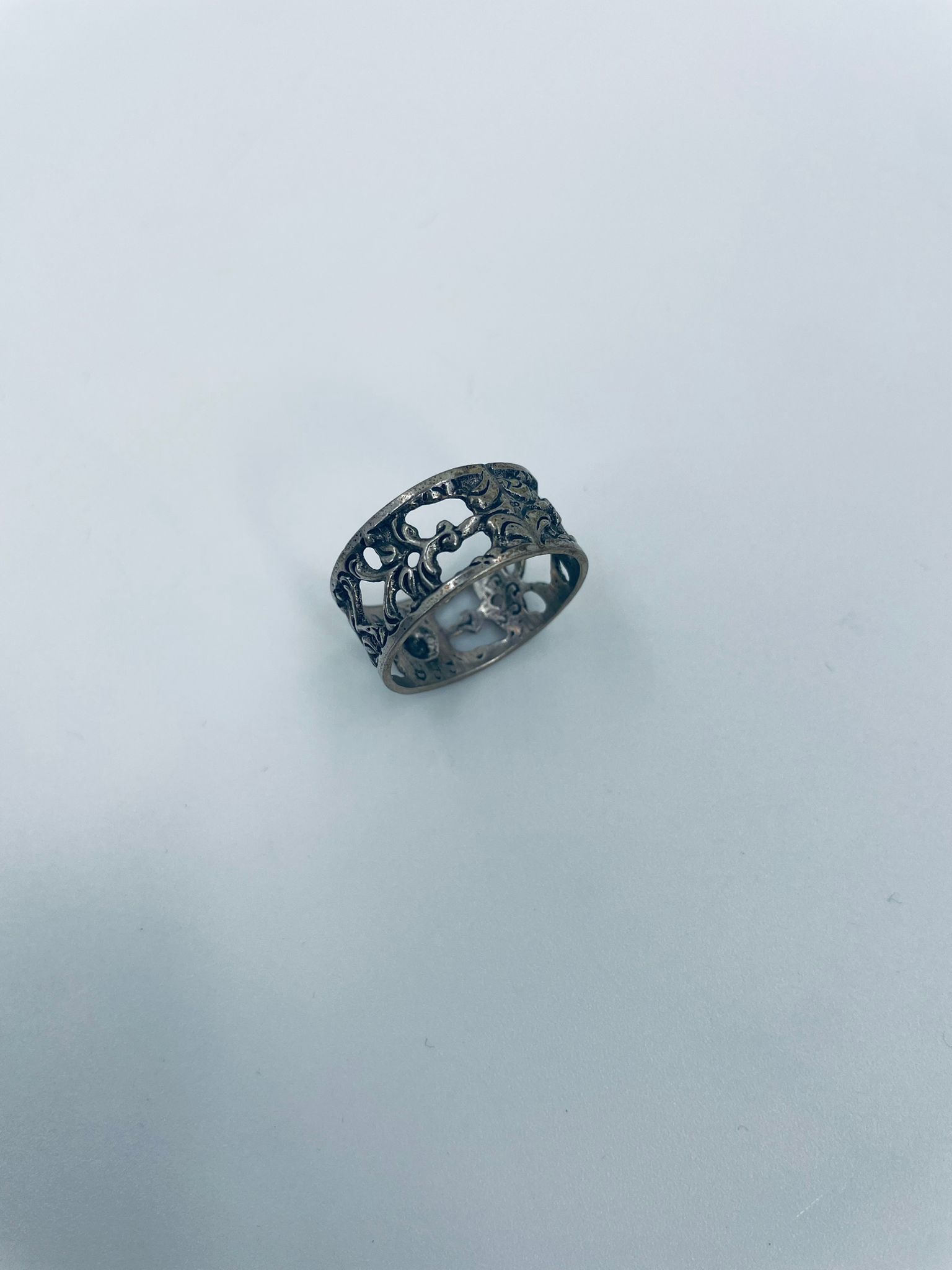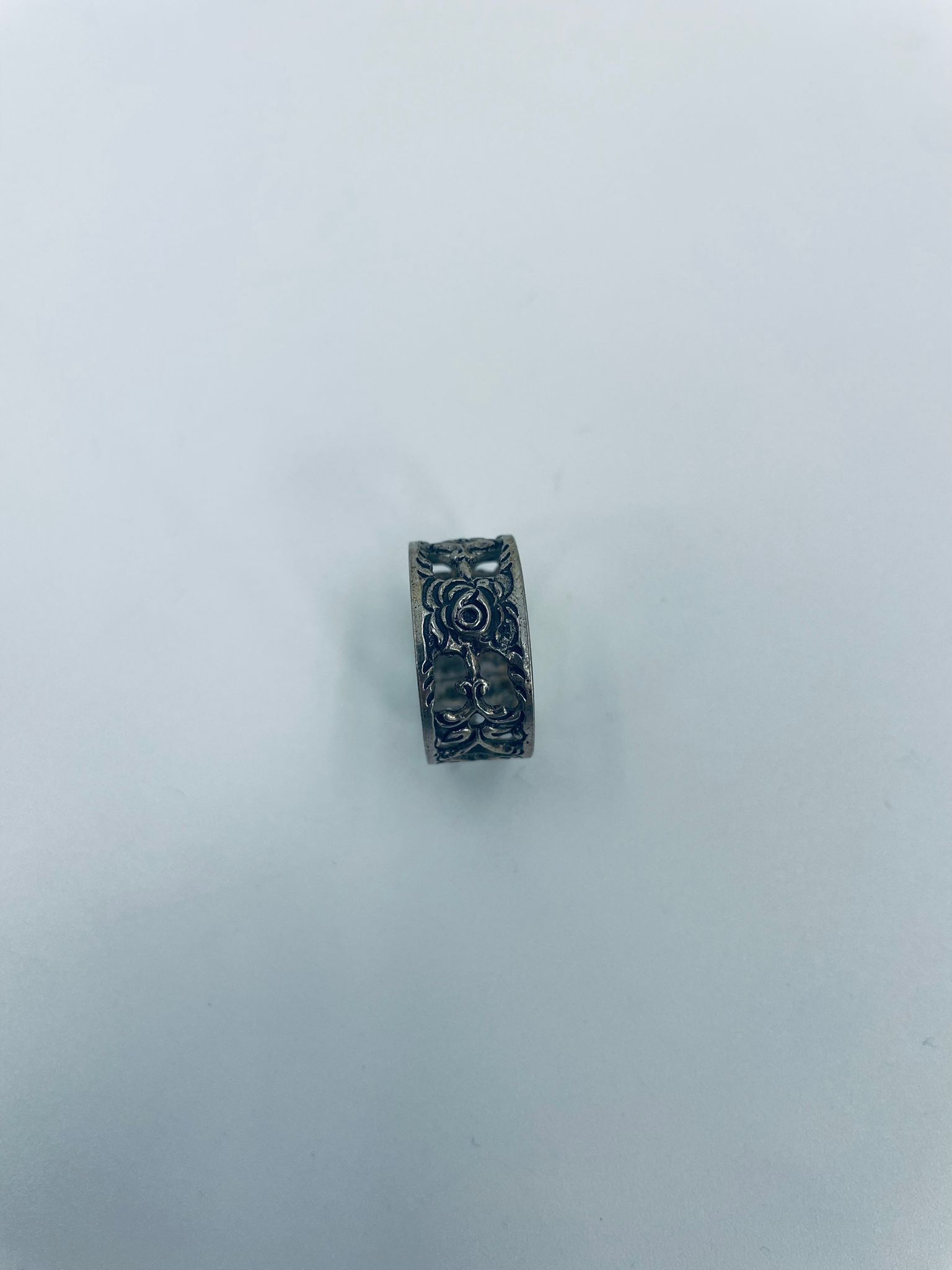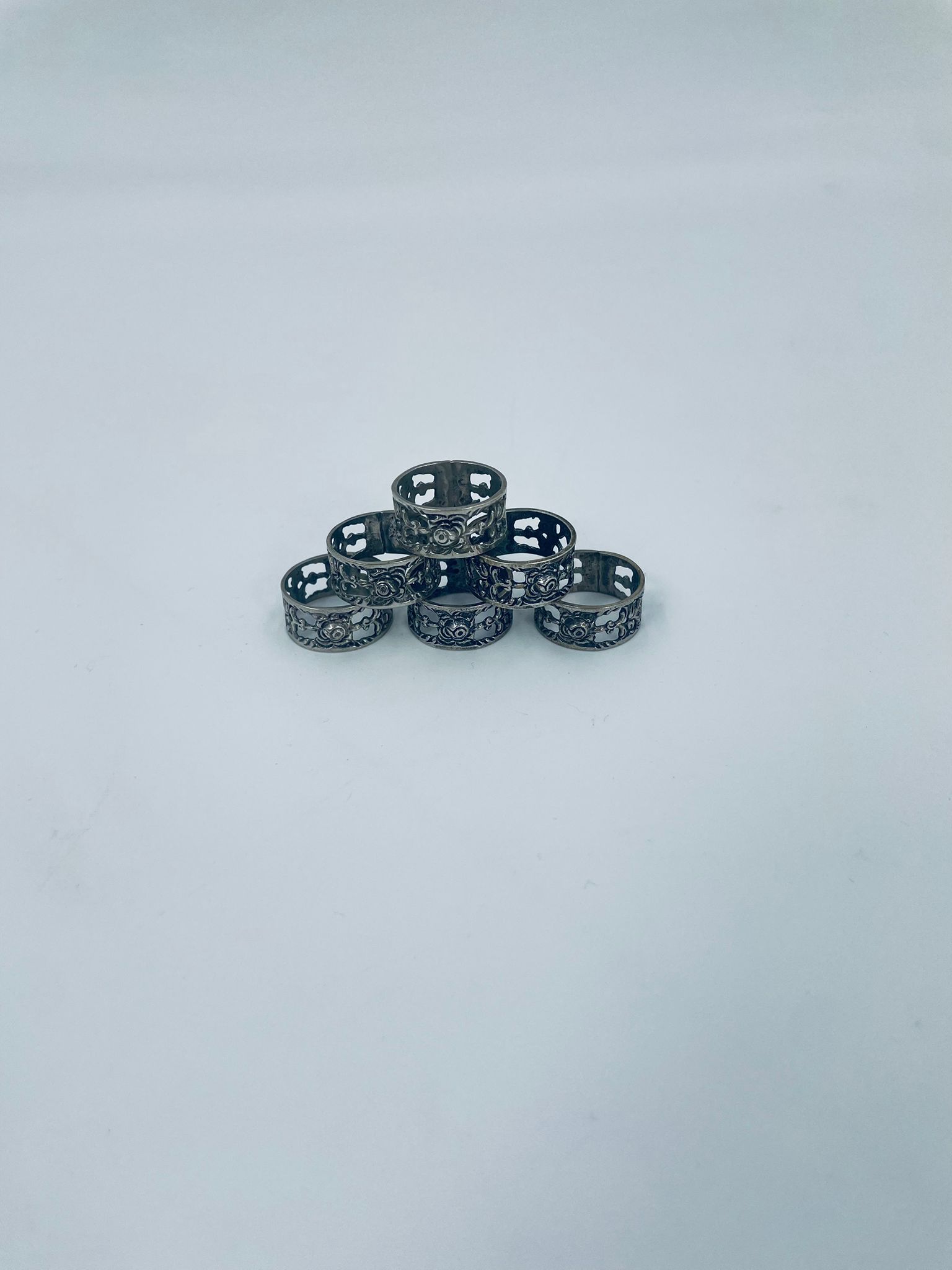 Komplet sześciu obrączek na serwetki srebrnych o probie 835. Serwetniki w stylu gotyckim, Charakteryzują się ciekawym wzorem ażurowym z kwiatkiem.