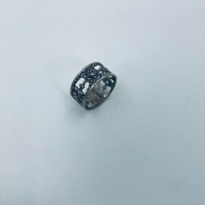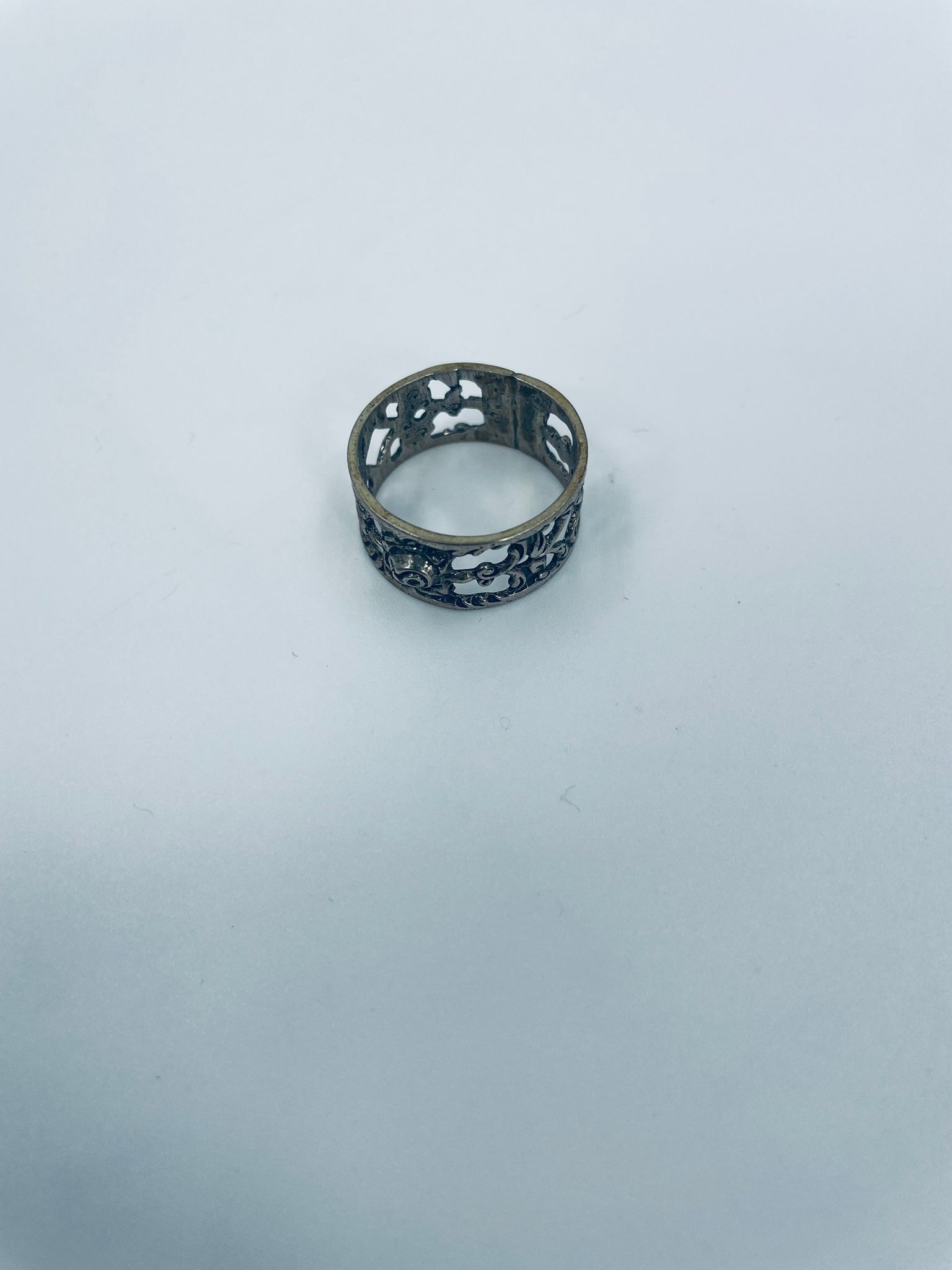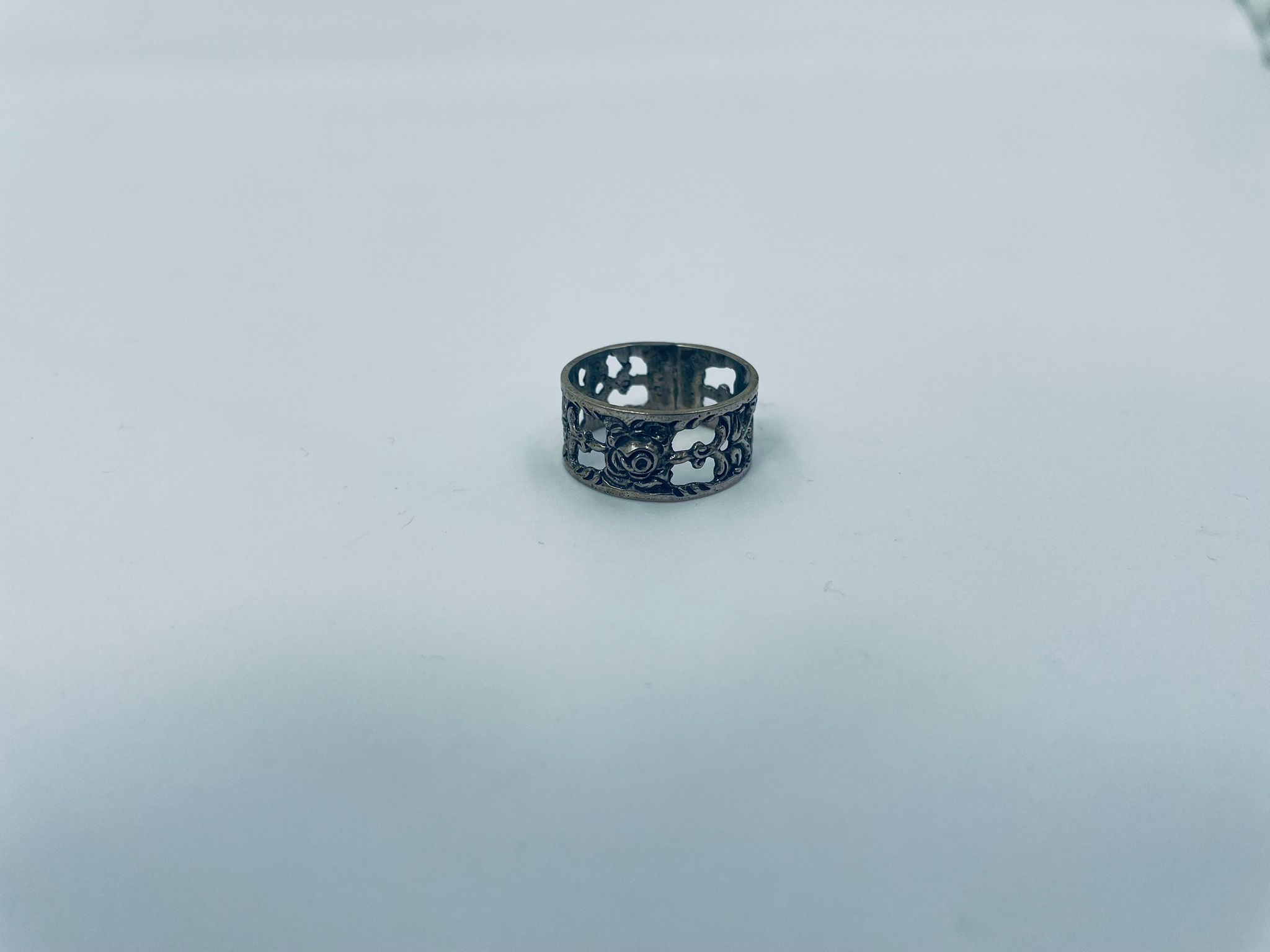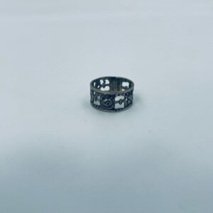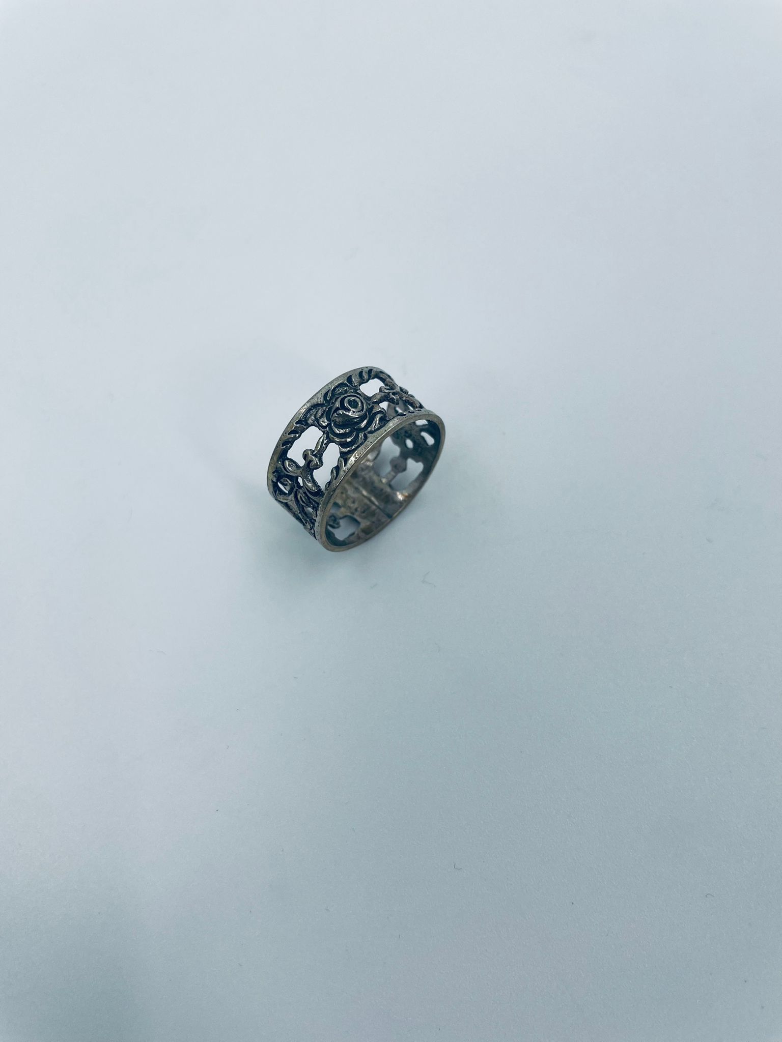 Komplet sześciu obrączek na serwetki srebrnych o probie 835. Serwetniki w stylu gotyckim, Charakteryzują się ciekawym wzorem ażurowym z kwiatkiem.