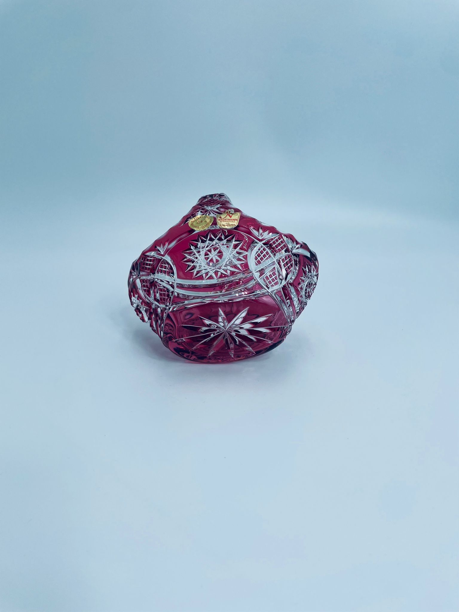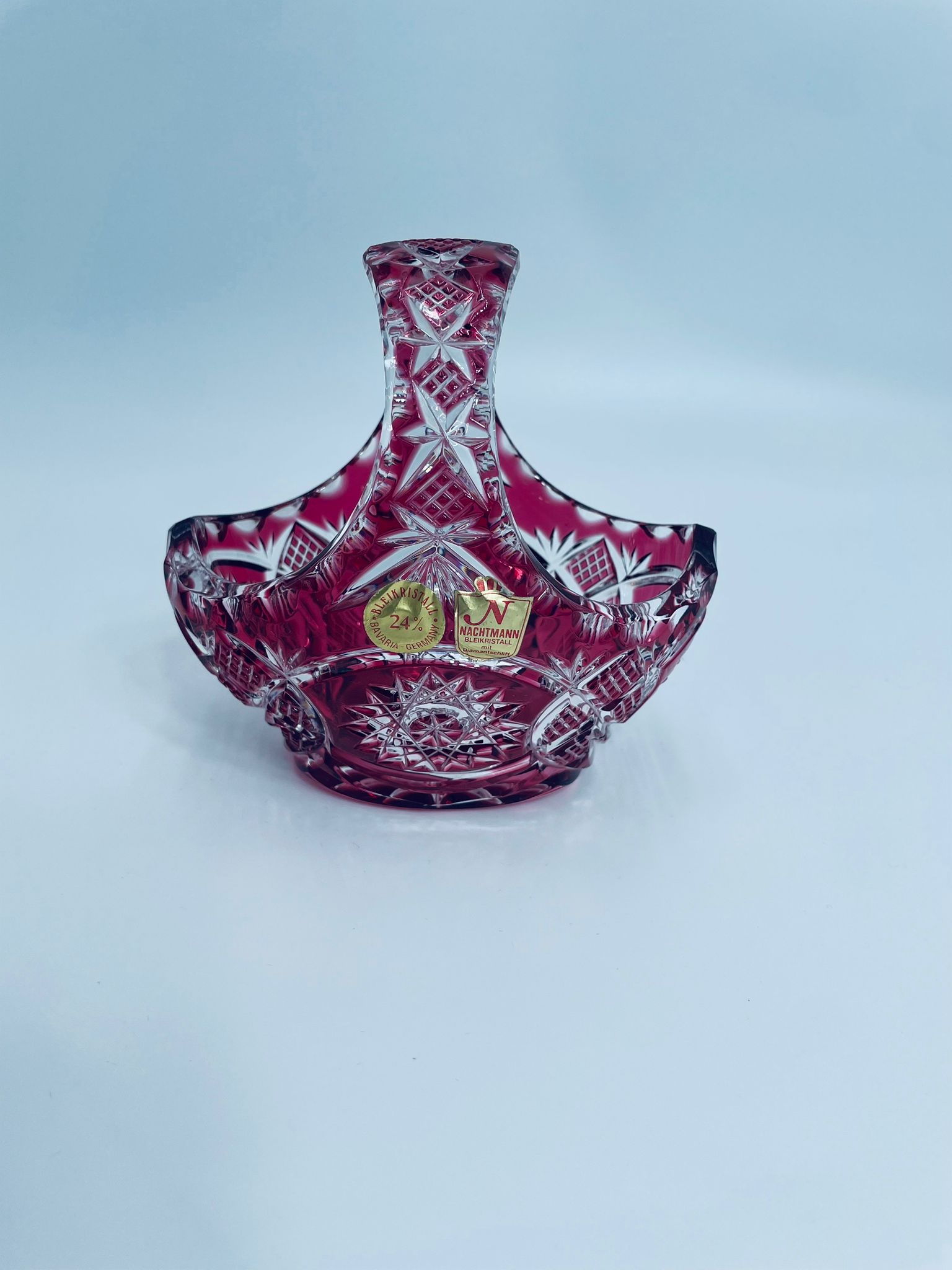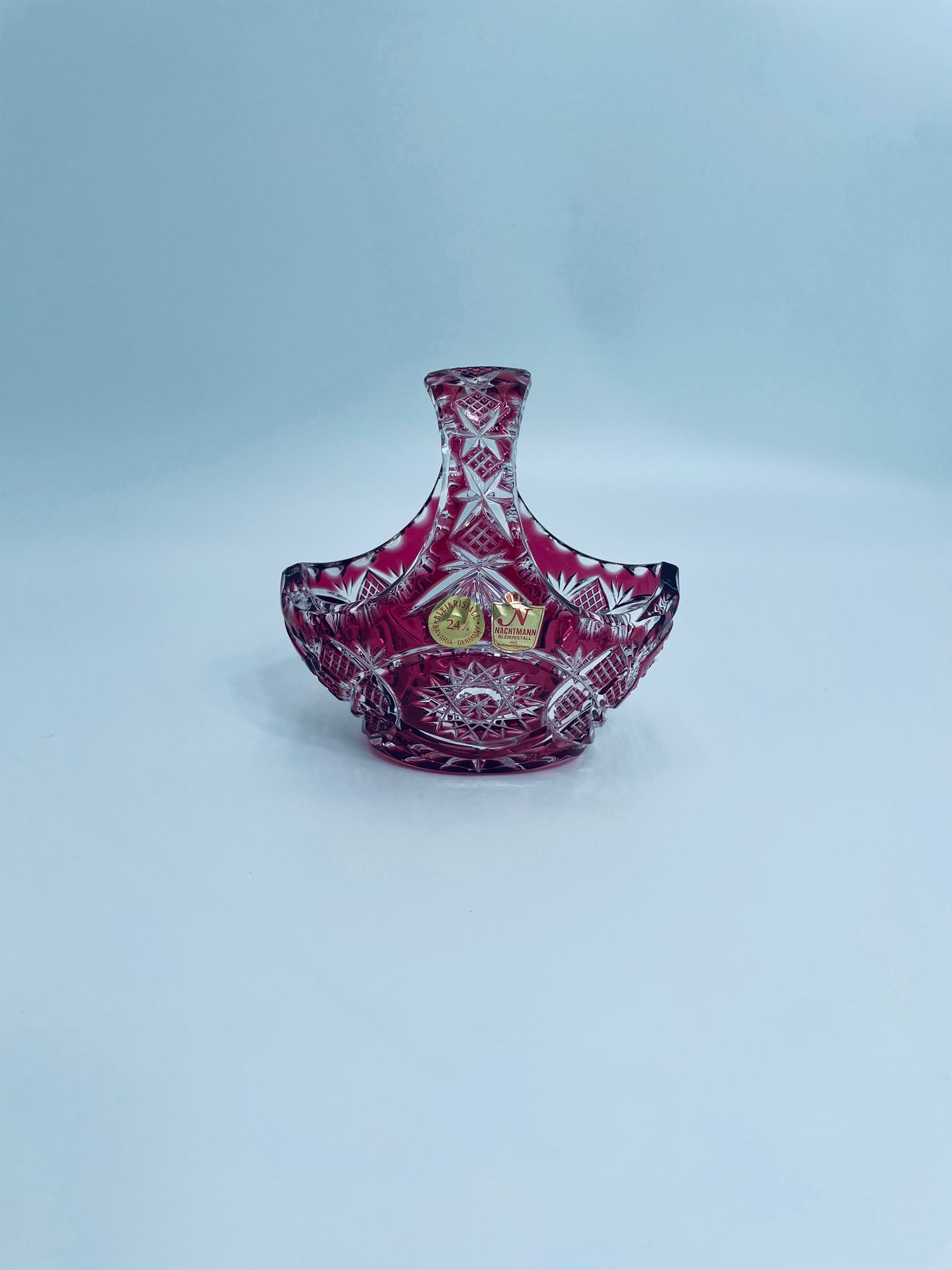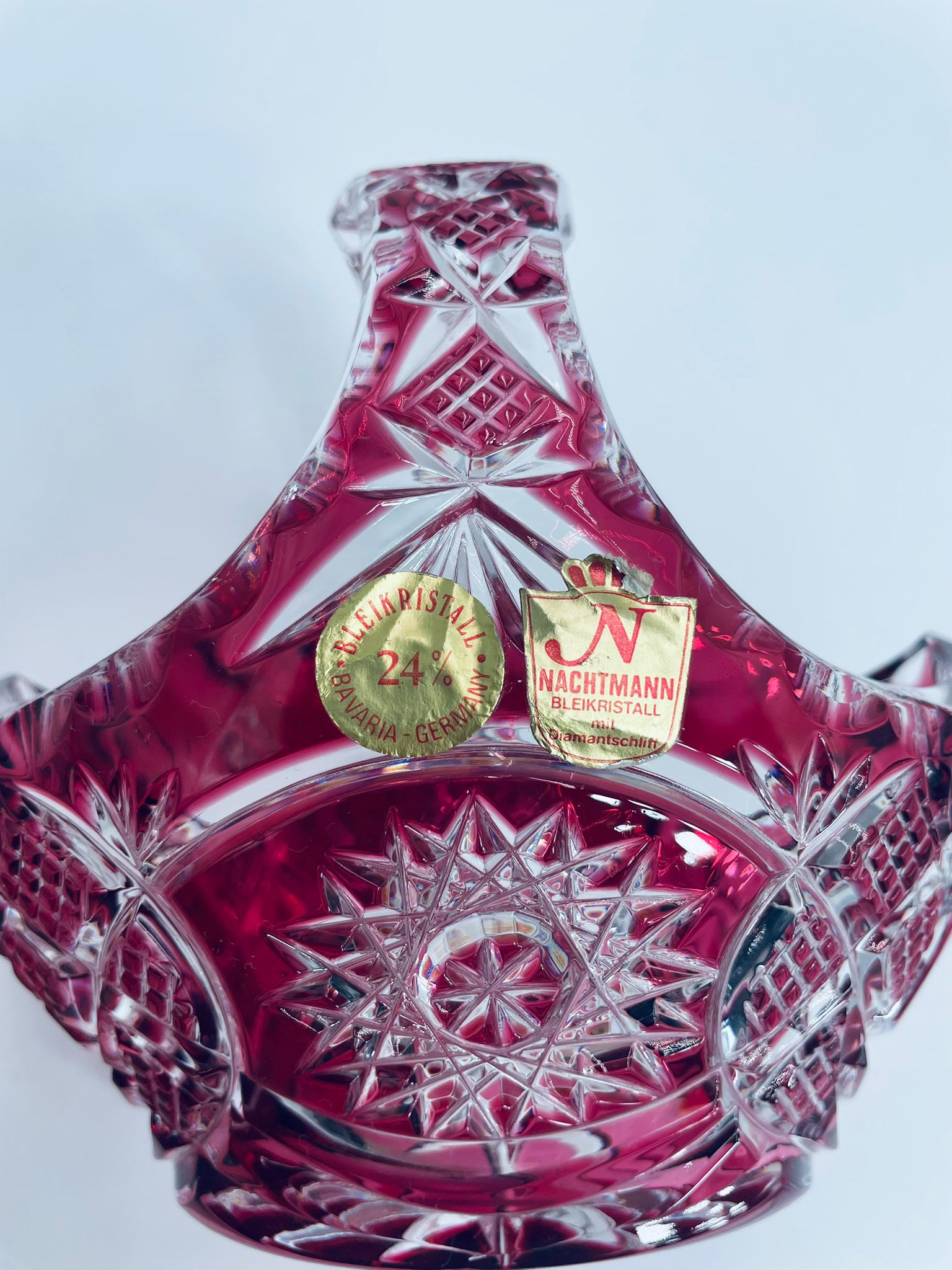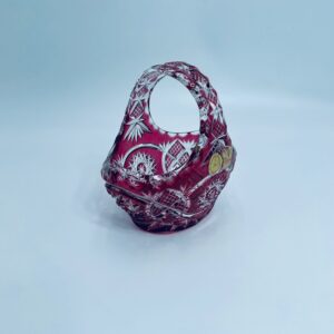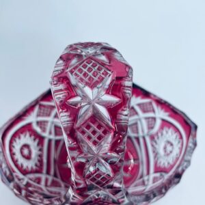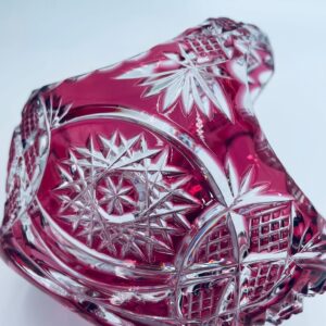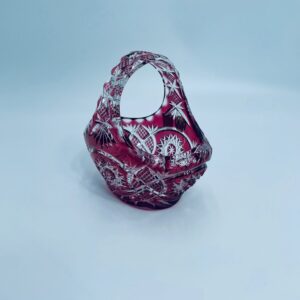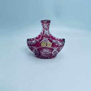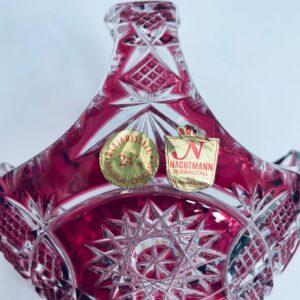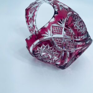 Koszyczek dekoracyjny Natchmann Bleikristall Bavaria Germany, wykonany z wysokiej jakości szkła kryształowego, ołowiowego. Koszyczek barwiony w masie na robinowy kolor, ozdobiony bogatym zdobieniem z precyzyjnymi szlifami we wzorach geometrycznych.