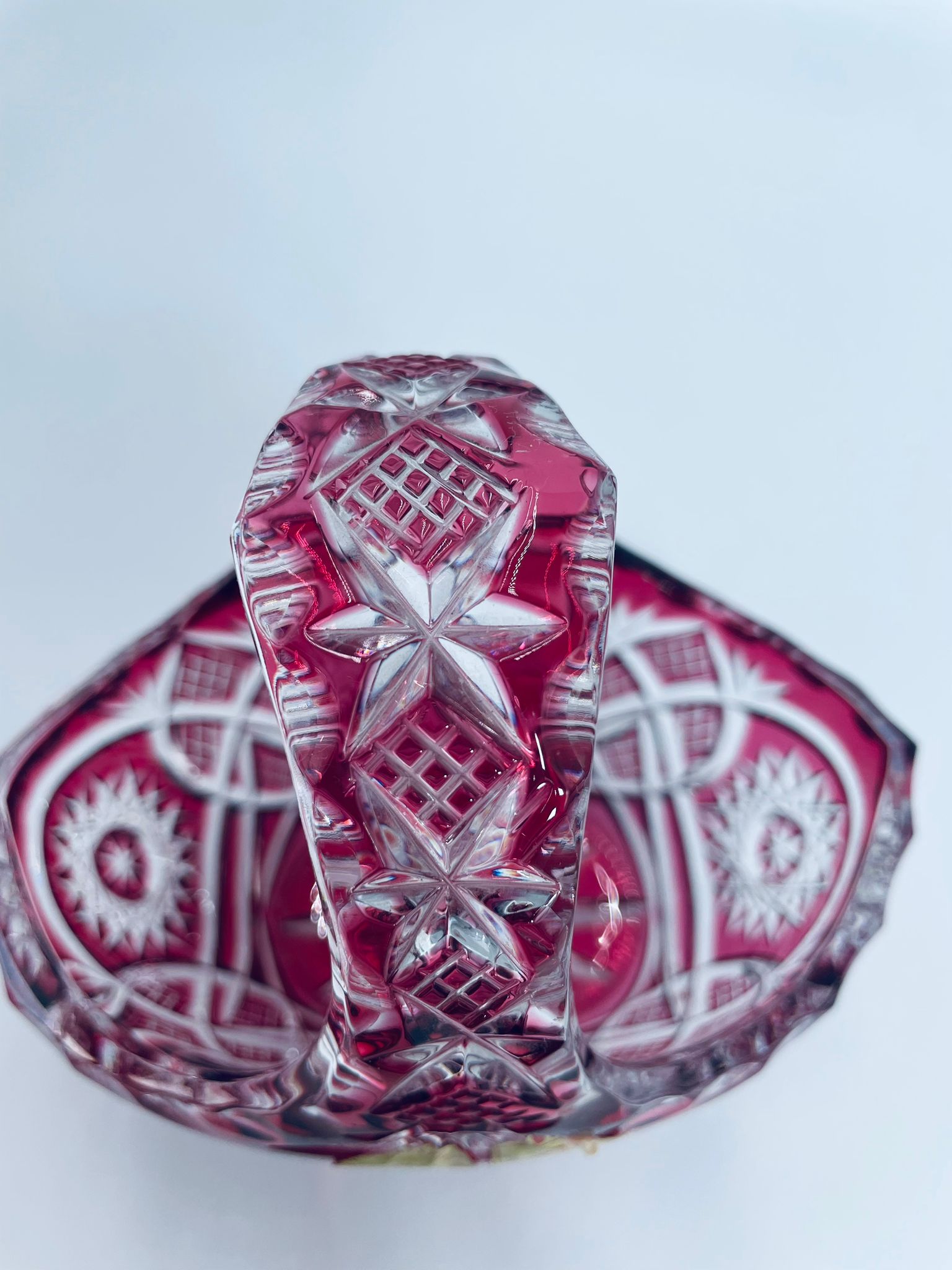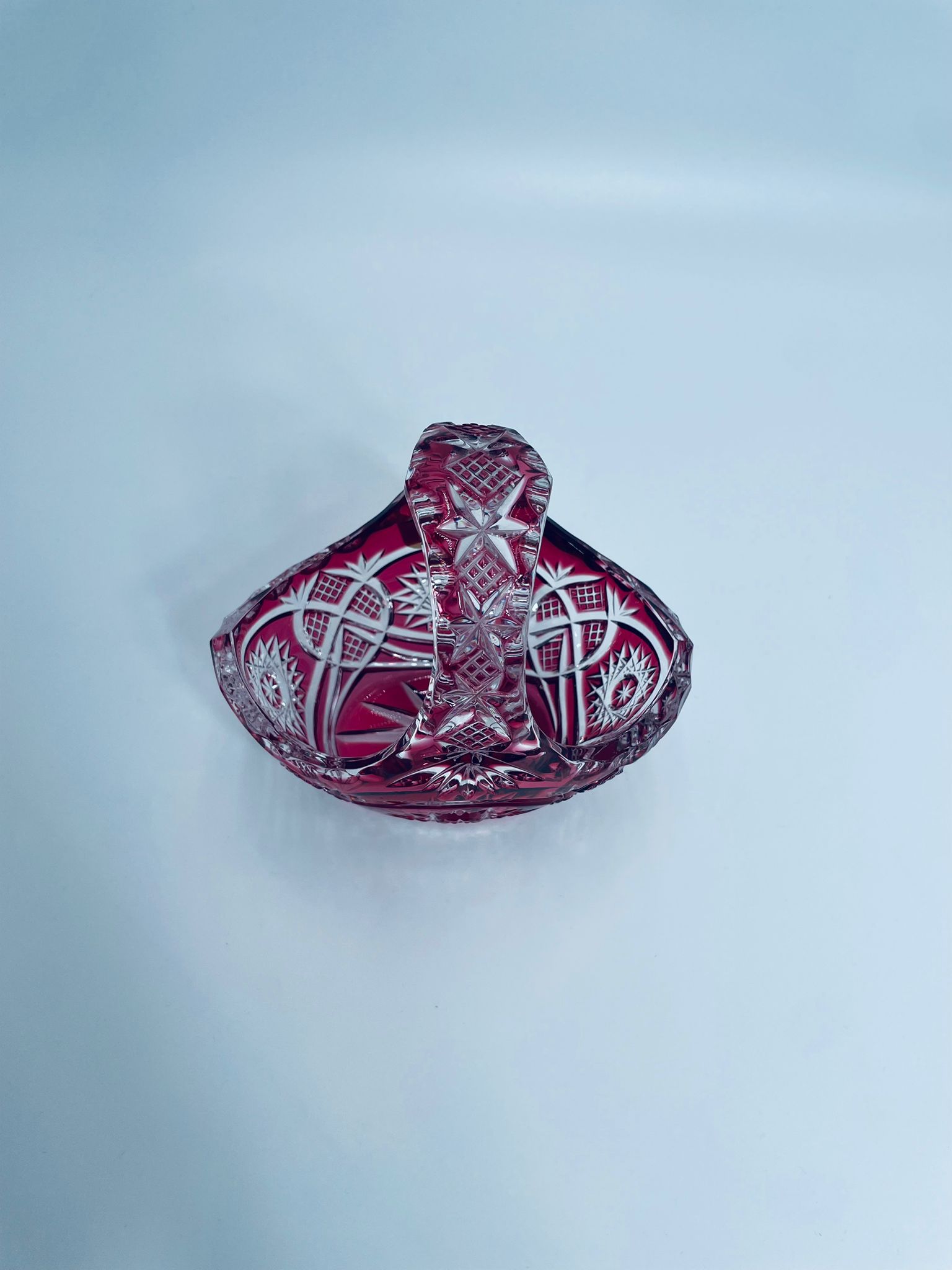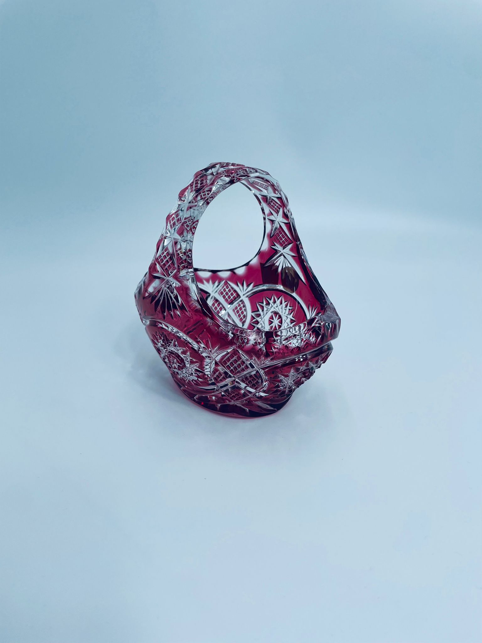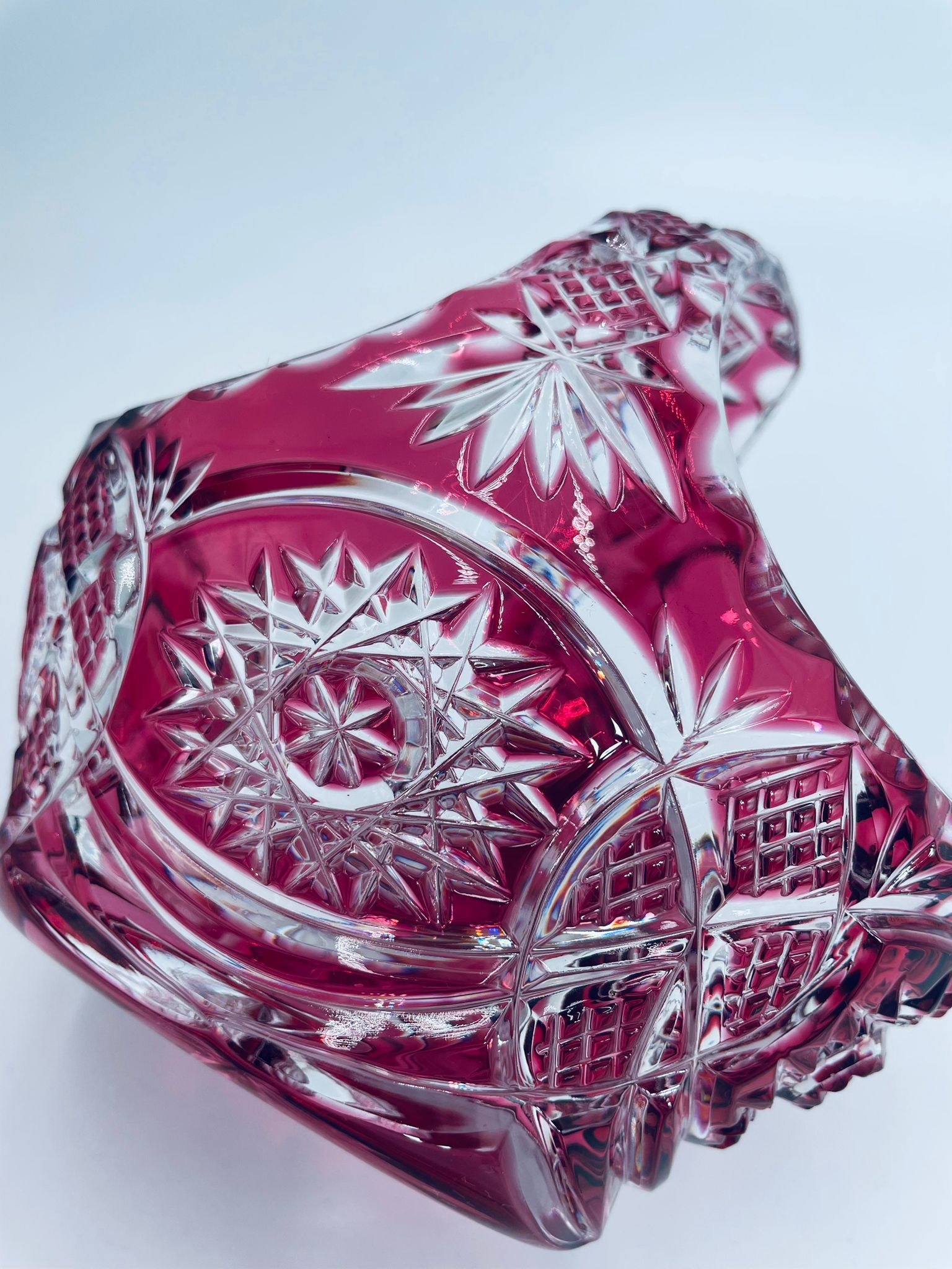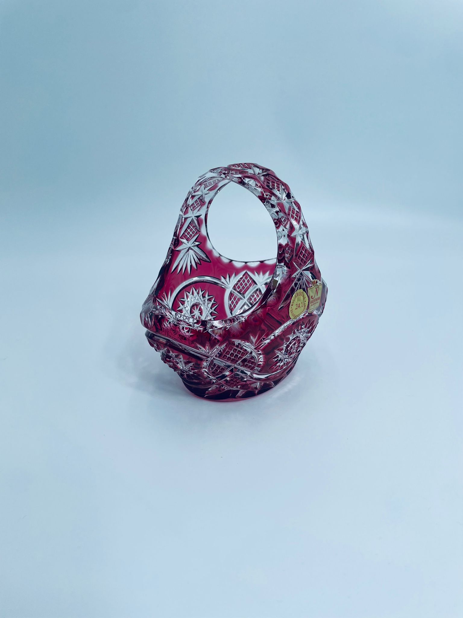 Koszyczek dekoracyjny Natchmann Bleikristall Bavaria Germany, wykonany z wysokiej jakości szkła kryształowego, ołowiowego. Koszyczek barwiony w masie na robinowy kolor, ozdobiony bogatym zdobieniem z precyzyjnymi szlifami we wzorach geometrycznych.