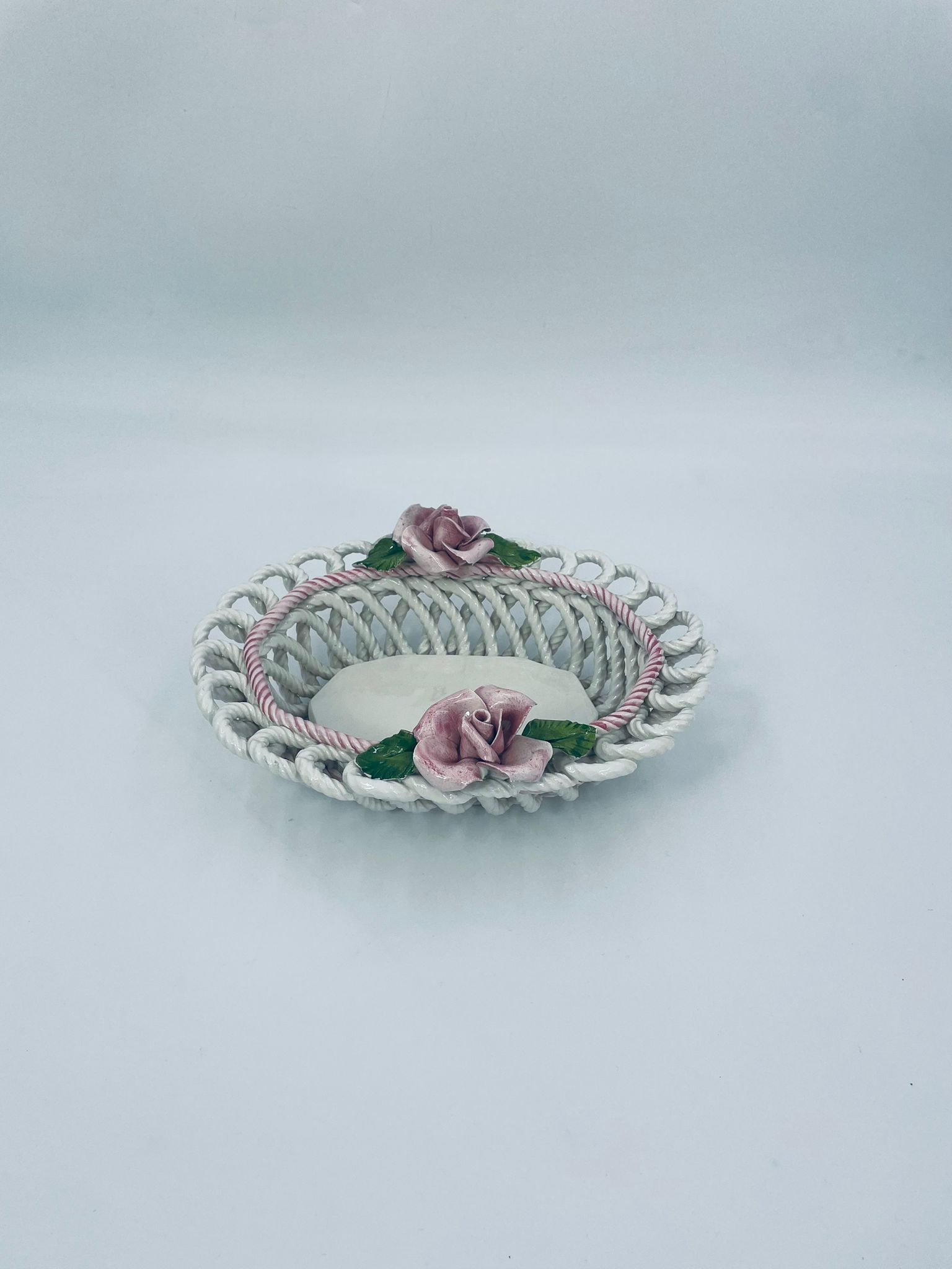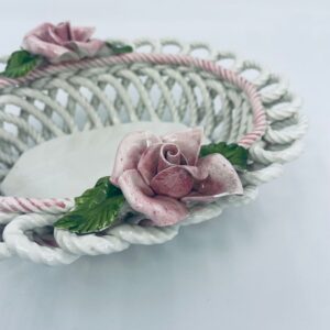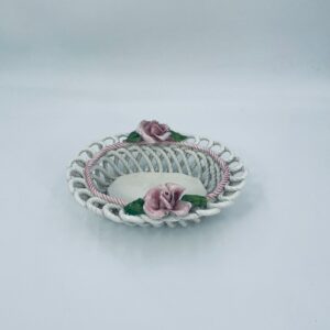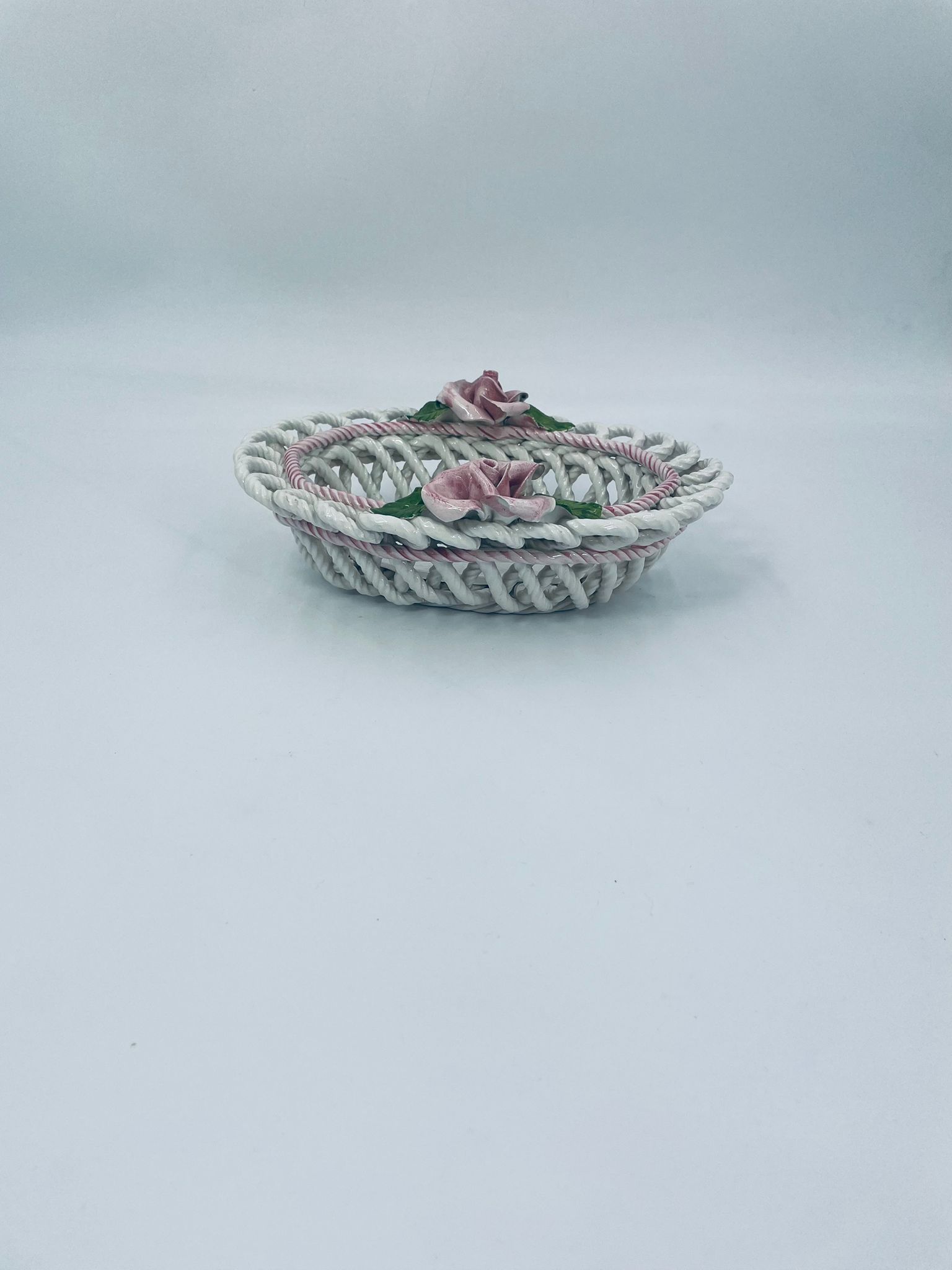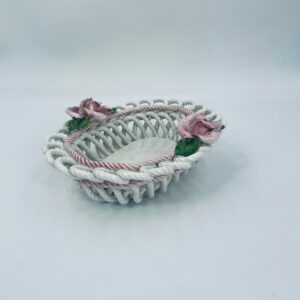 Koszyczek azurowy, wykonany z porcelany, pleciony, ozdobiony ręcznie malowanymi różowymi różami. Koszyczek posiada uszczerbek na róży.