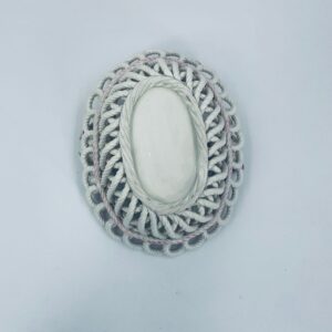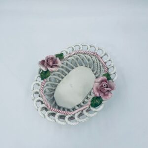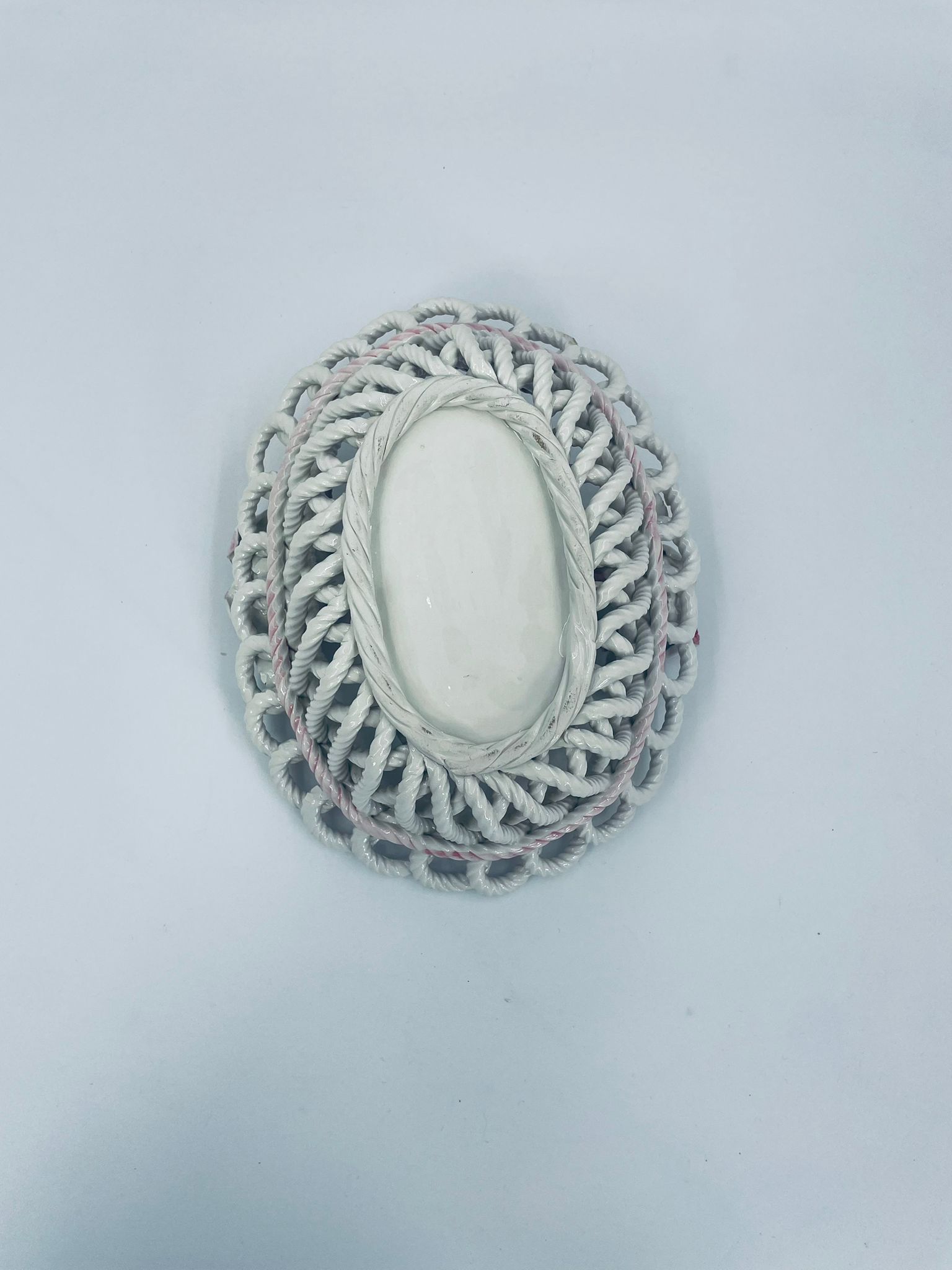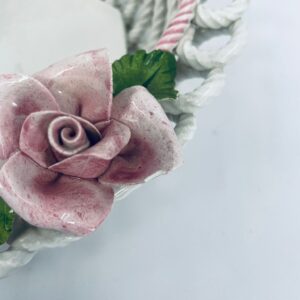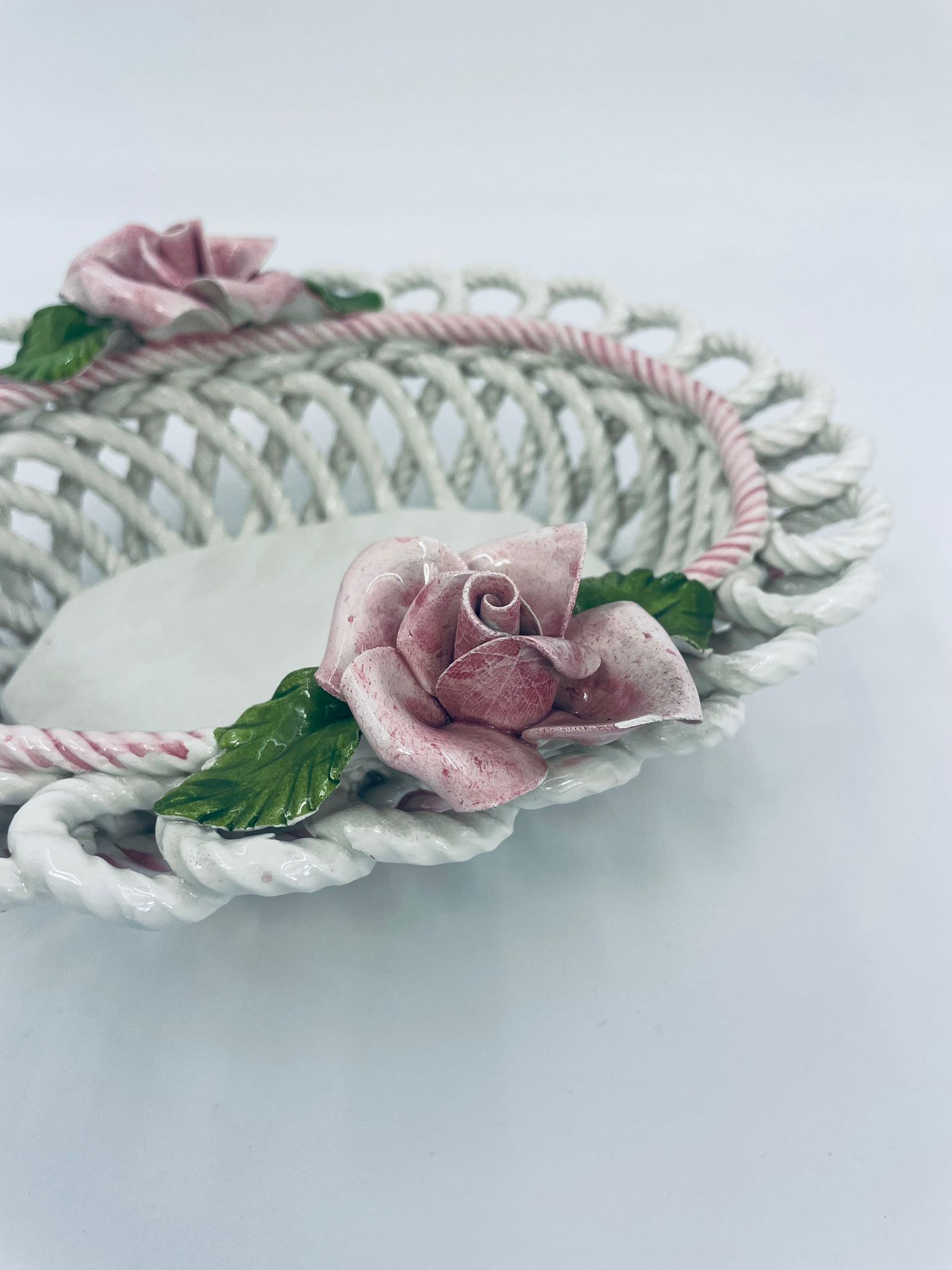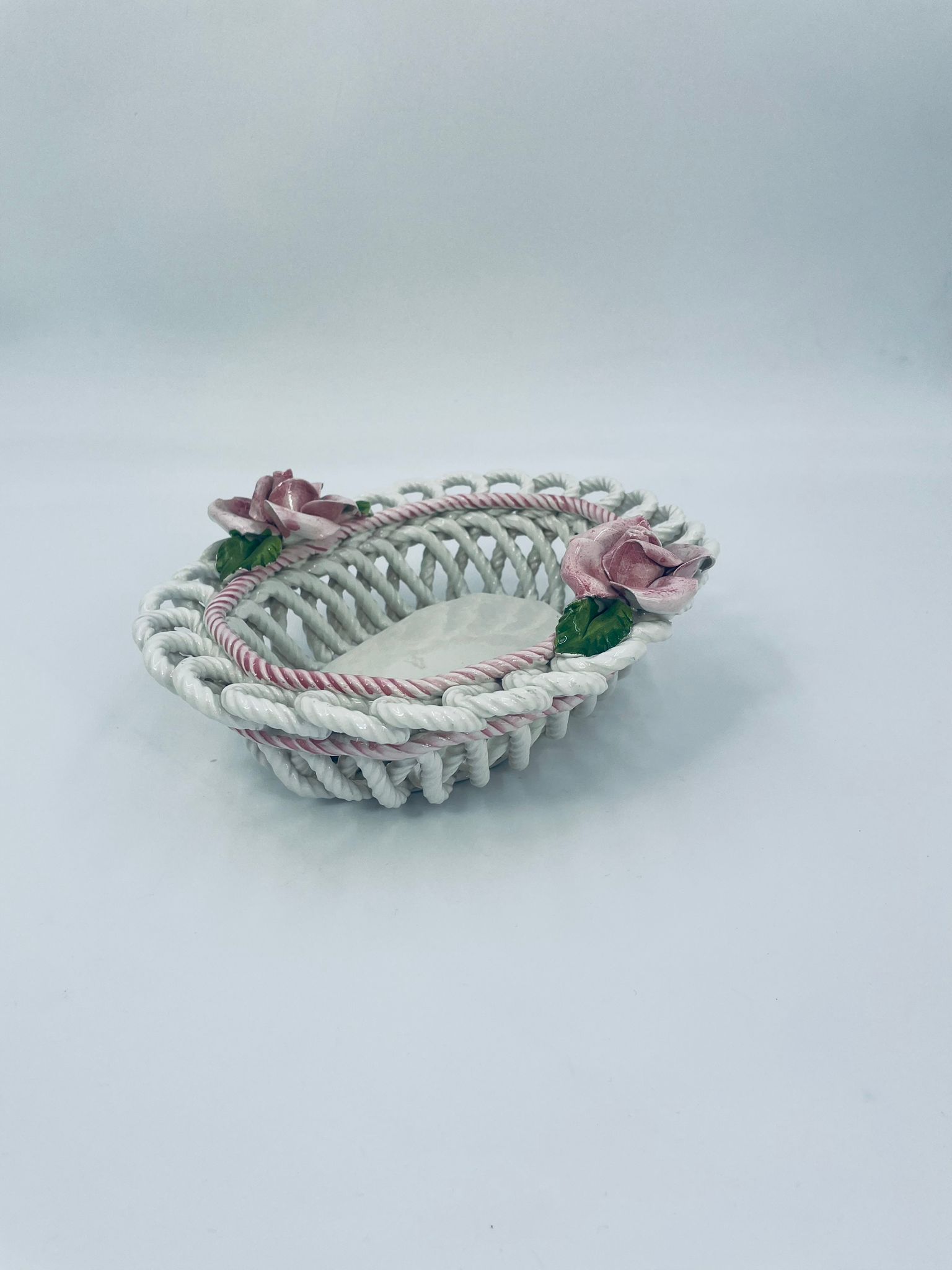 Koszyczek azurowy, wykonany z porcelany, pleciony, ozdobiony ręcznie malowanymi różowymi różami. Koszyczek posiada uszczerbek na róży.