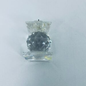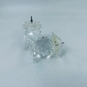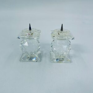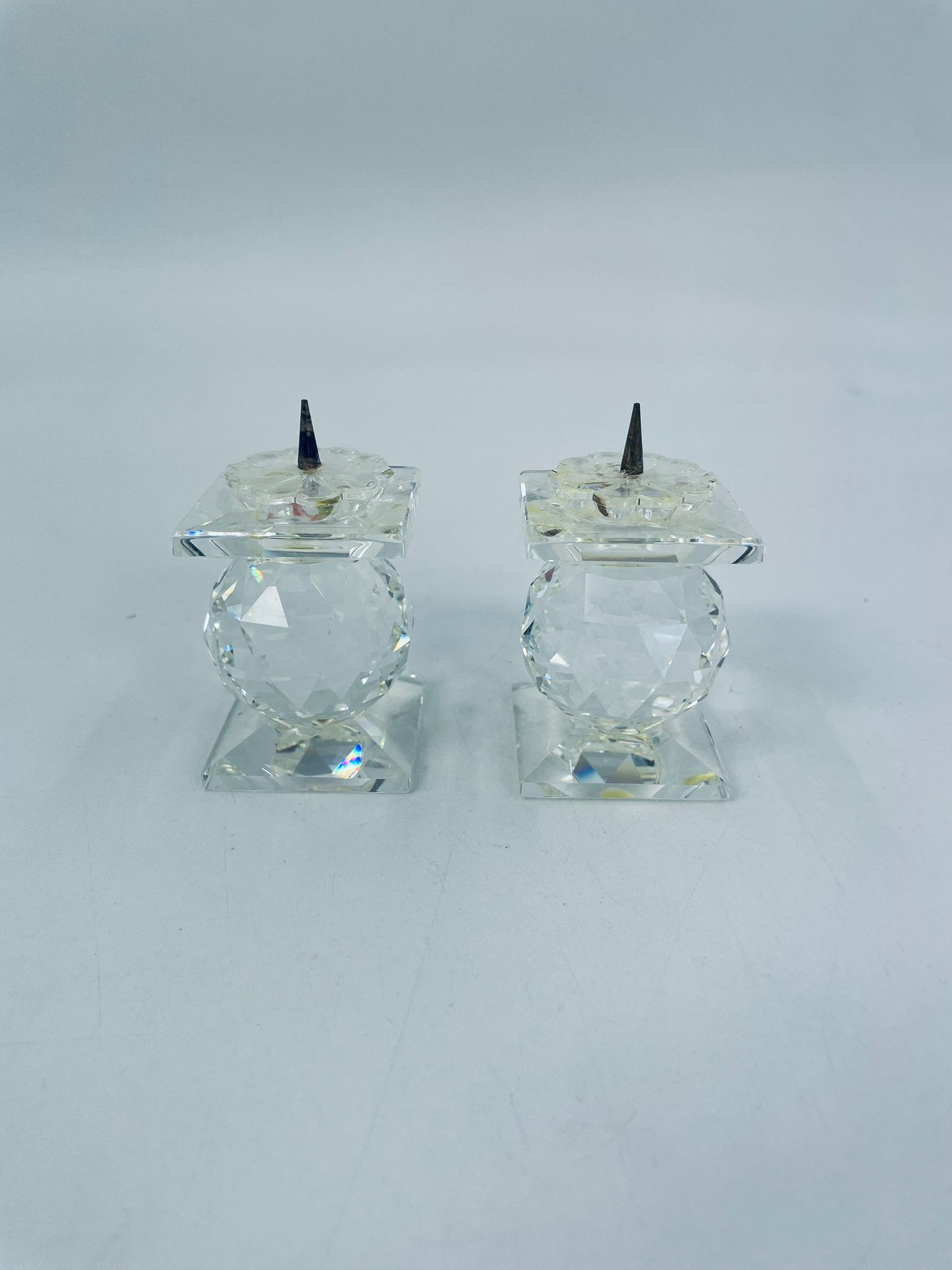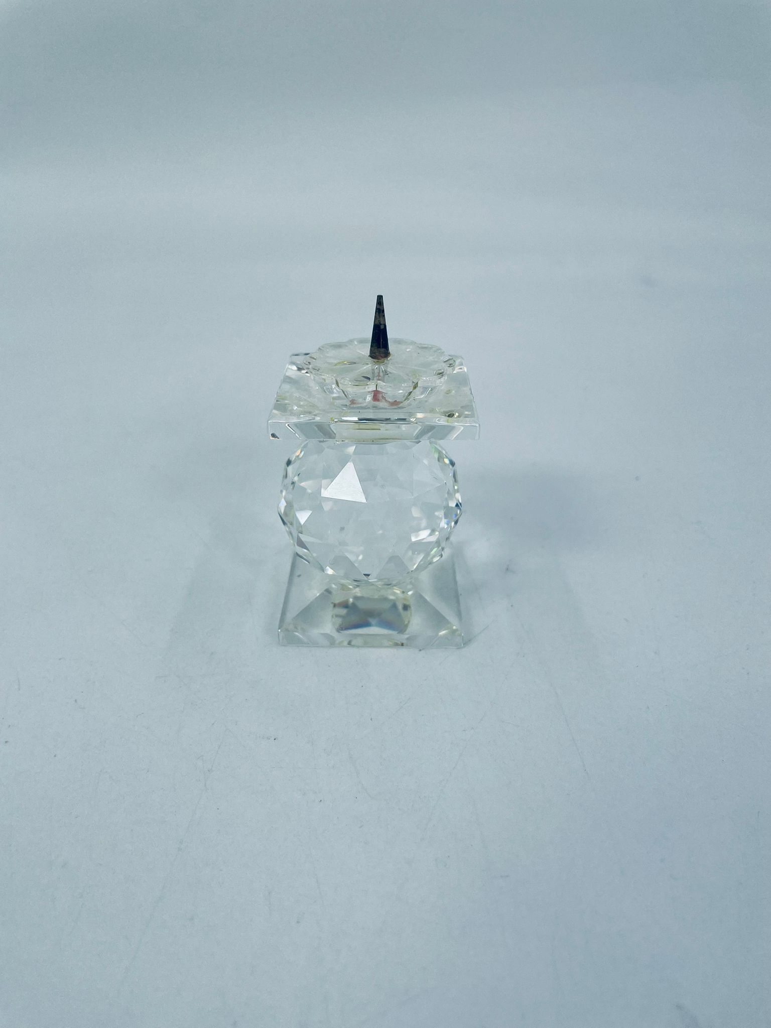 Malutki kryształowy świecznik na jedną świecę. Świecznik na kwadratowej podstawie na której znajduje się fasetowana kula kryształowa oraz zwieńczony kwadratową platforma z kolcem do mocowania świecy.