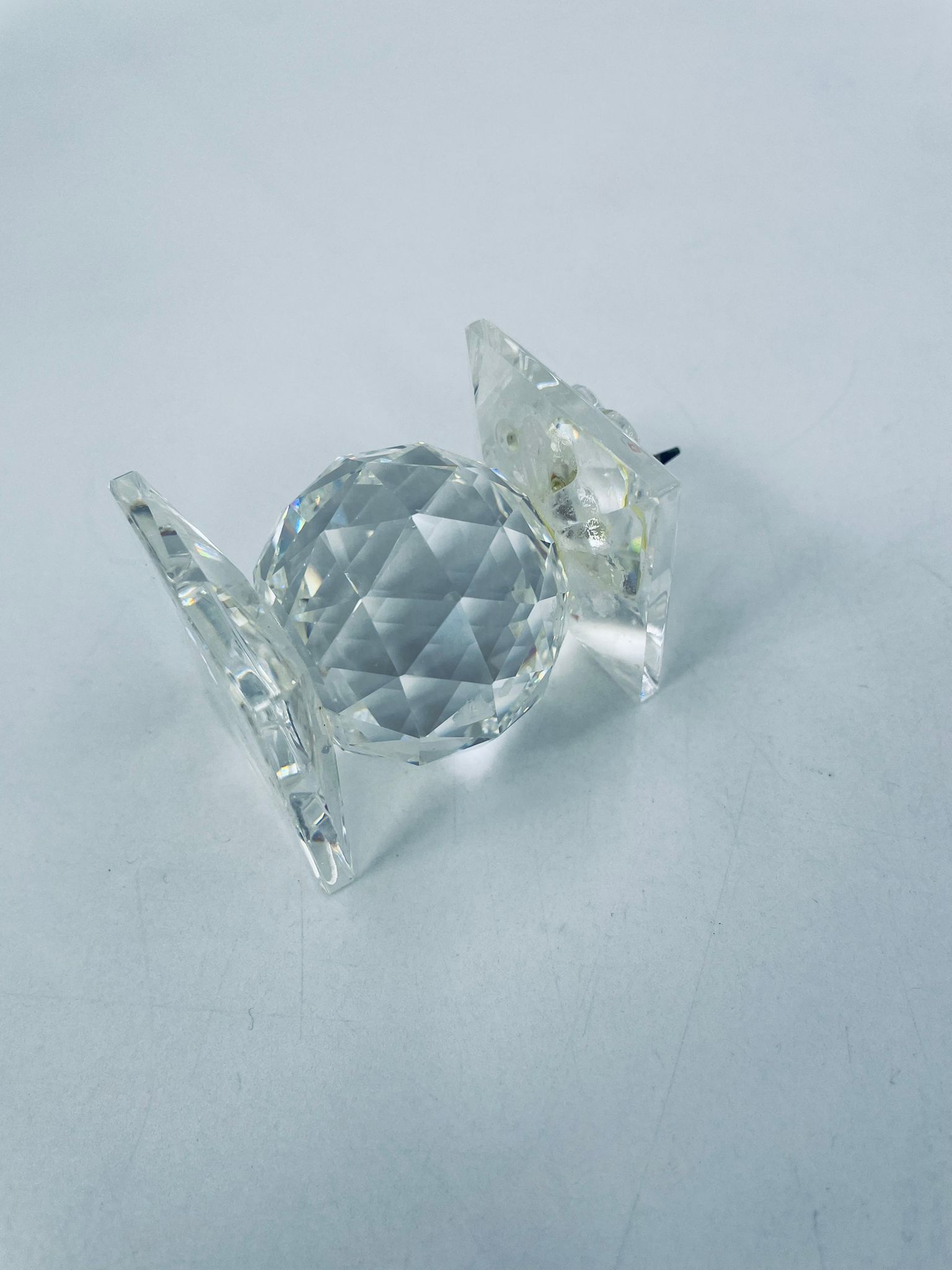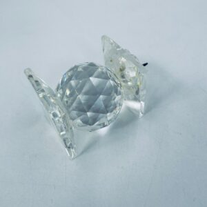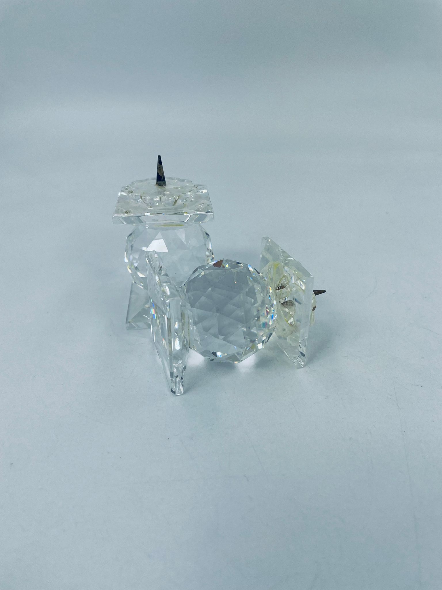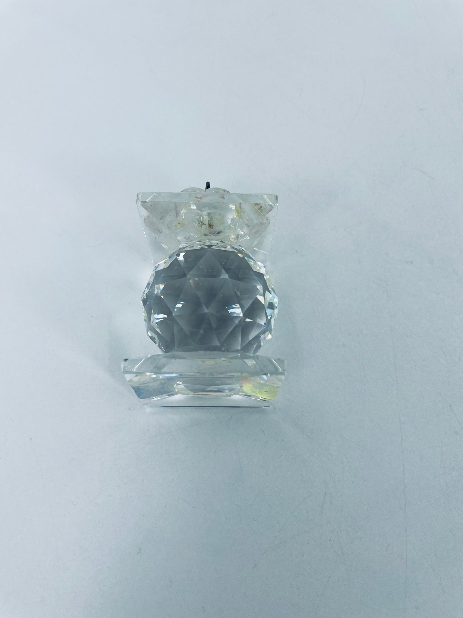 Malutki kryształowy świecznik na jedną świecę. Świecznik na kwadratowej podstawie na której znajduje się fasetowana kula kryształowa oraz zwieńczony kwadratową platforma z kolcem do mocowania świecy.