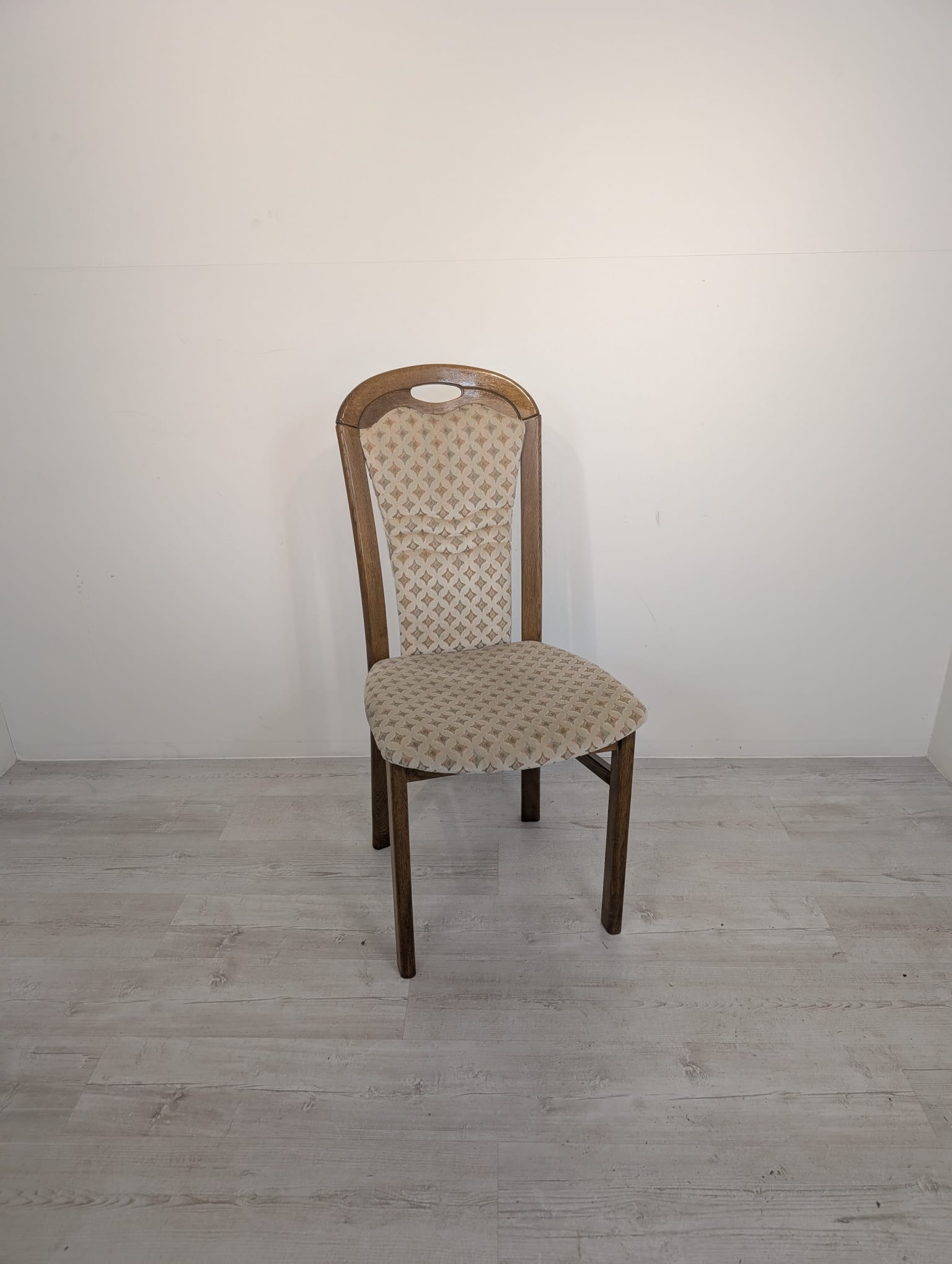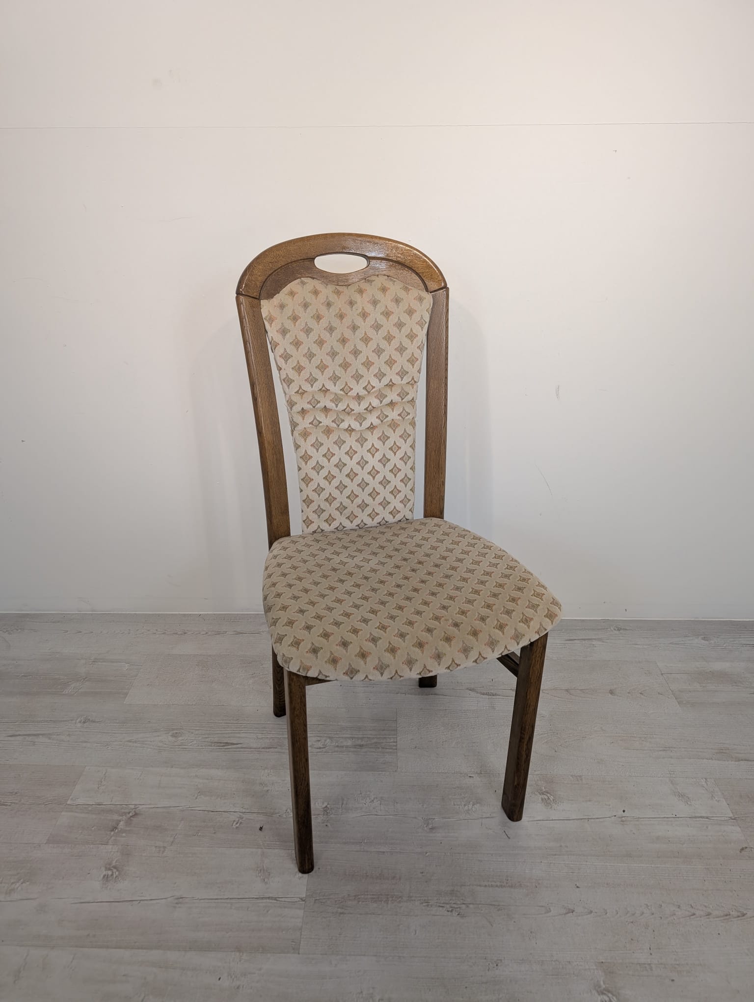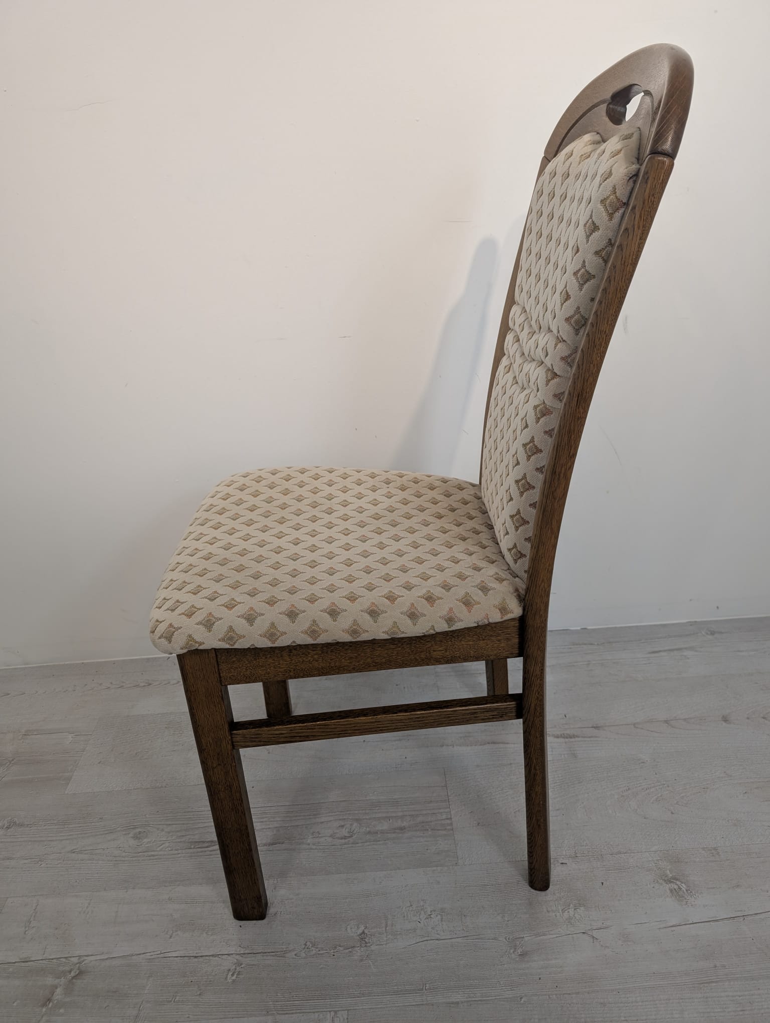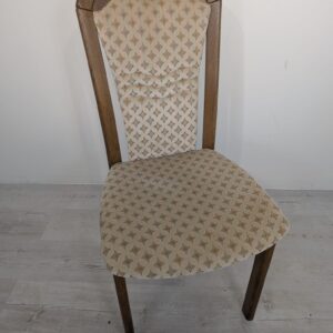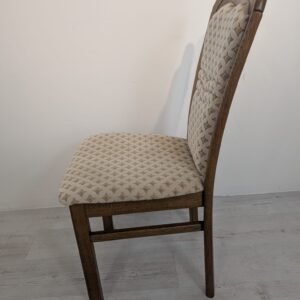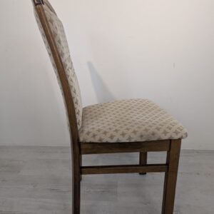Solidne, drewniane krzesło jadalnianie w stylu klasycznym. Siedzisko tapicerowane jest jasnym, wzorzystym materiałem, który nadaje mu elegancki wygląd. Krzesło jest używane, ale w dobrym stanie. Pasuje do wielu aranżacji wnętrz.
