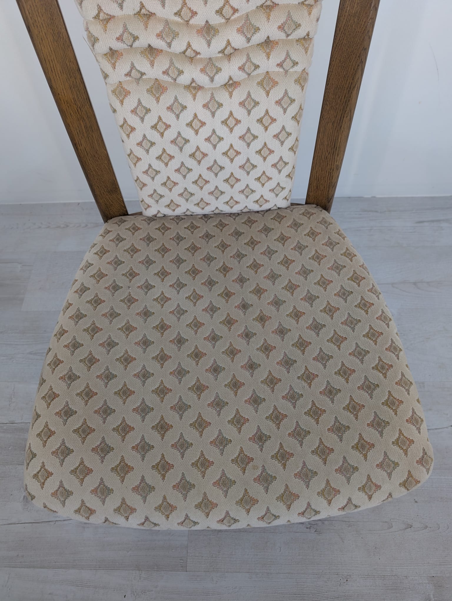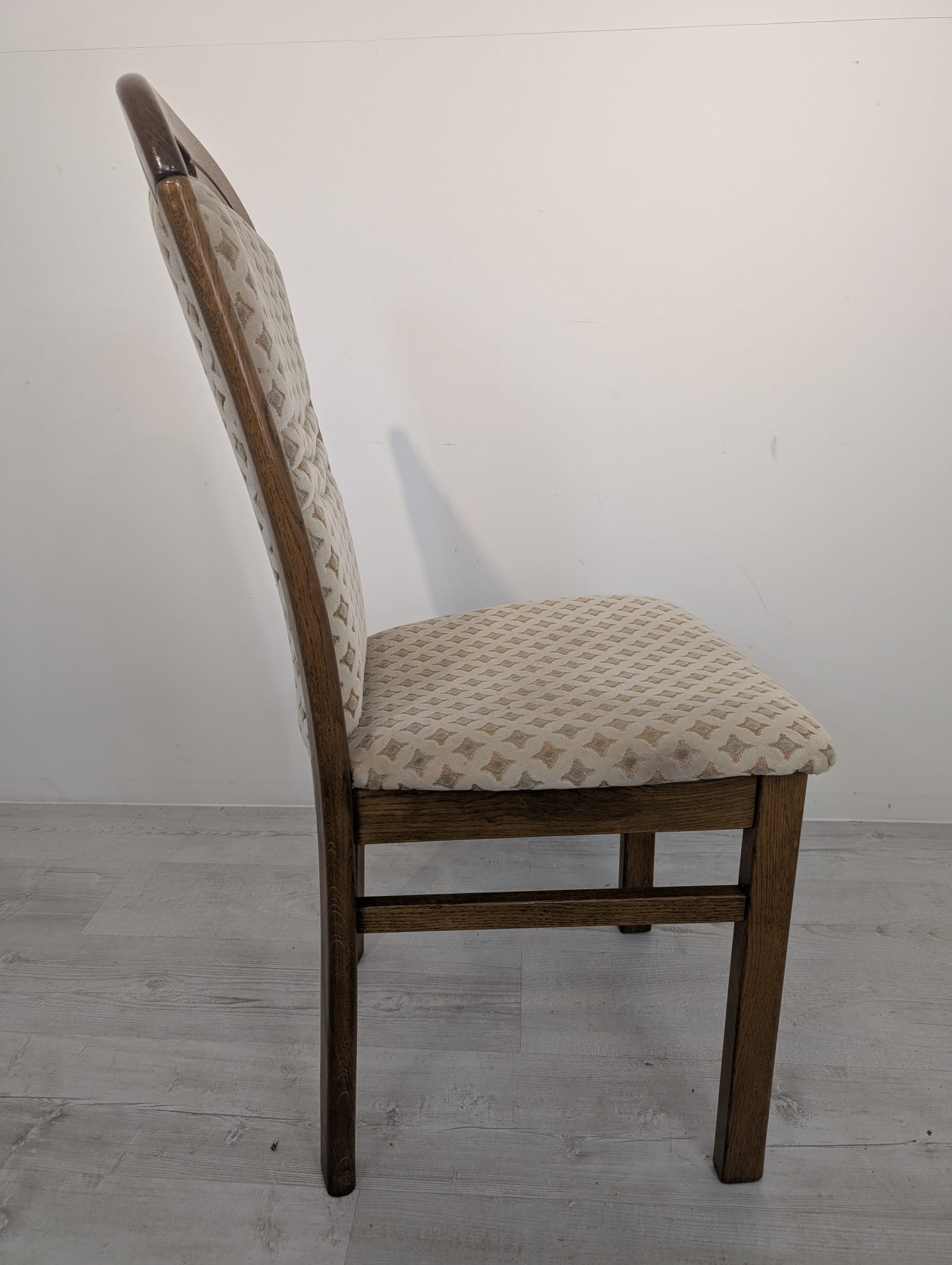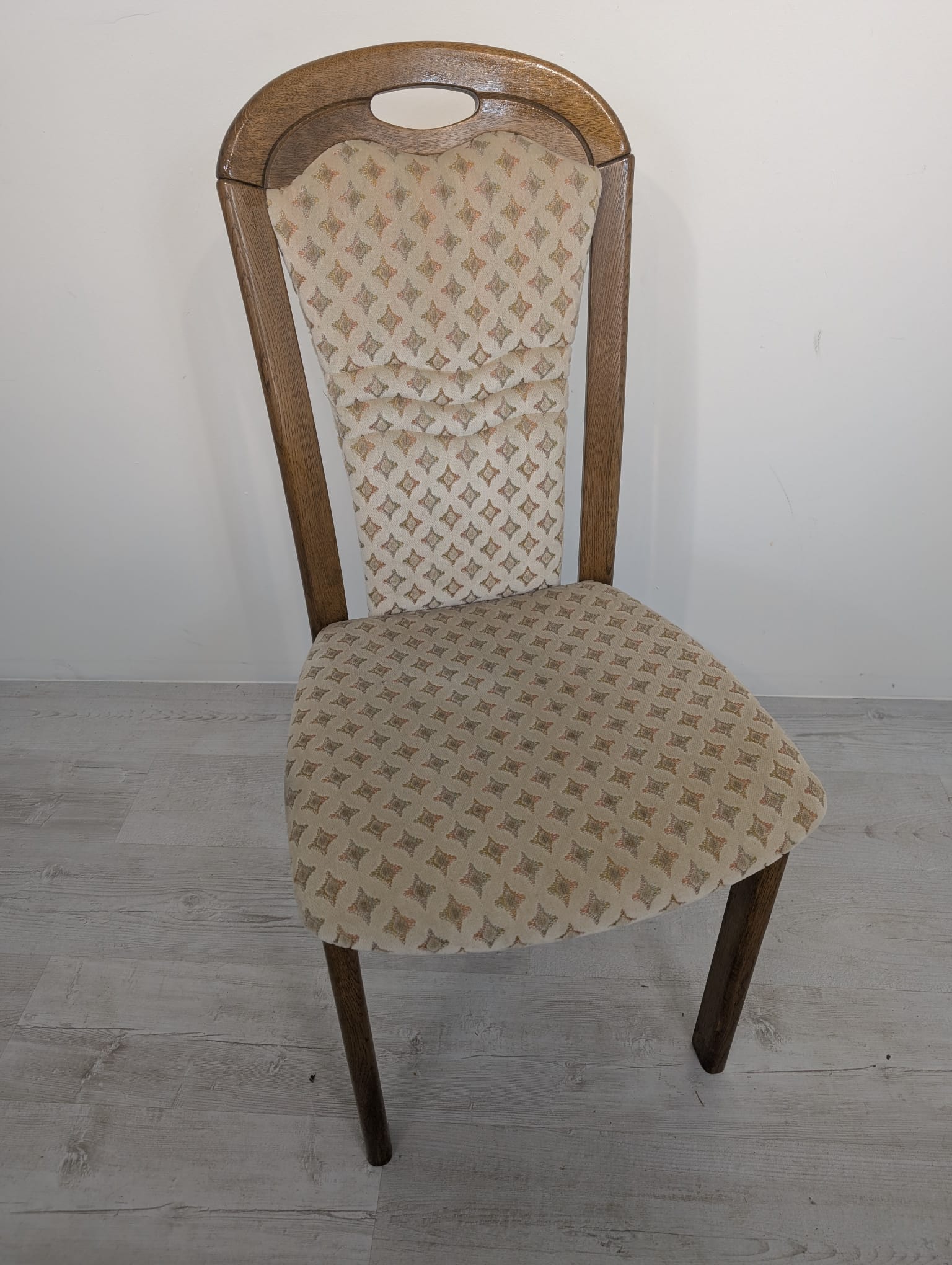 Solidne, drewniane krzesło jadalnianie w stylu klasycznym. Siedzisko tapicerowane jest jasnym, wzorzystym materiałem, który nadaje mu elegancki wygląd. Krzesło jest używane, ale w dobrym stanie. Pasuje do wielu aranżacji wnętrz.