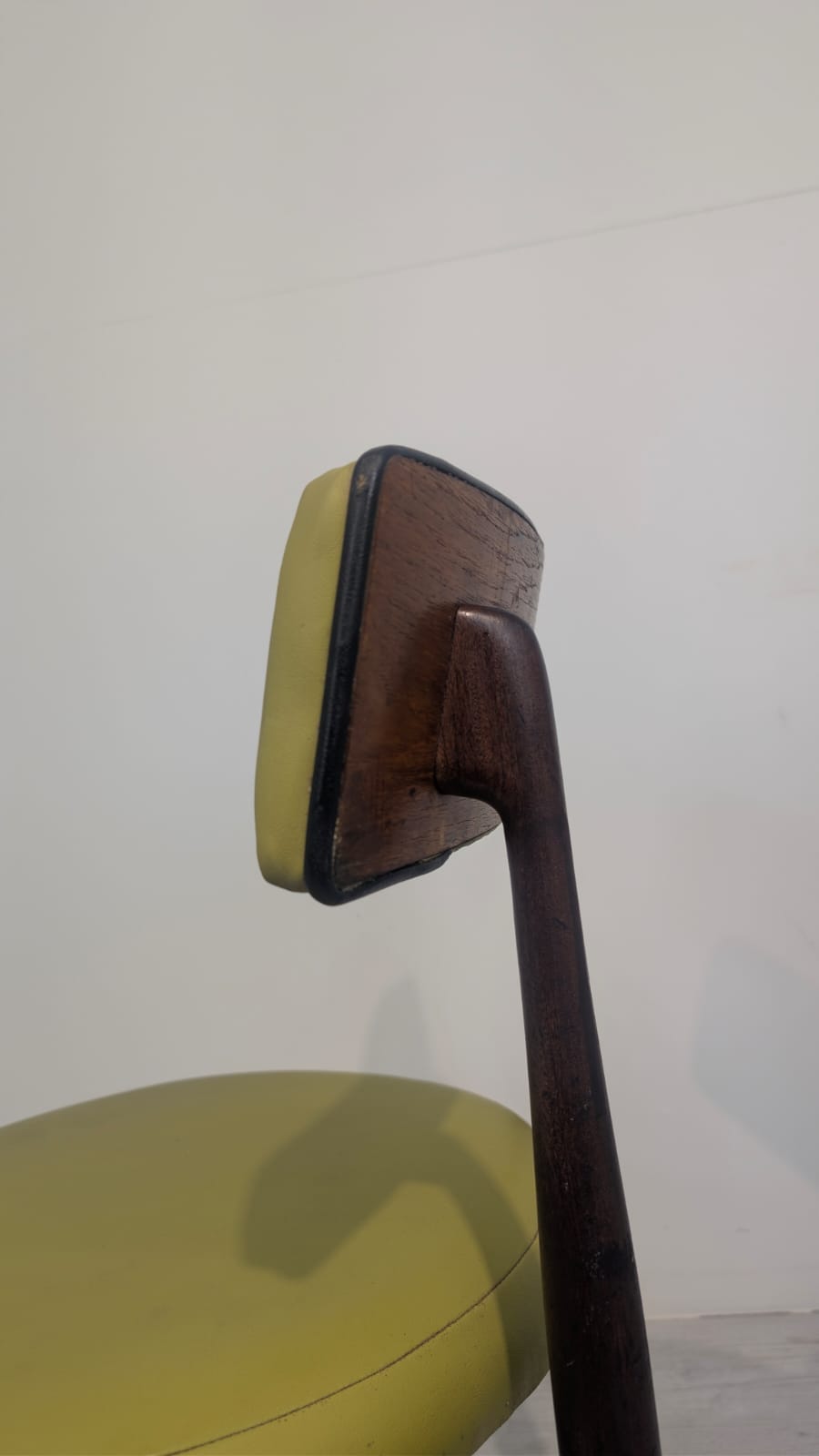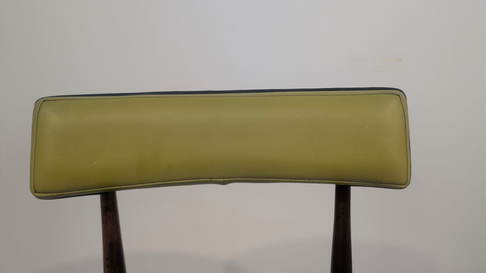 Stylowy fotel w stylu retro z lat 60./70. Wykonany z drewna tekowego, tapicerka w kolorze oliwkowym.