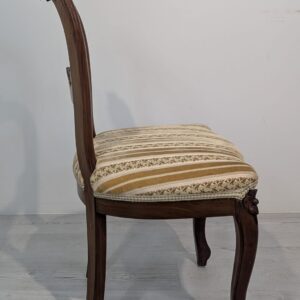 Mebel charakteryzuje się eleganckim, rzeźbionym oparciem i siedziskiem w paski.